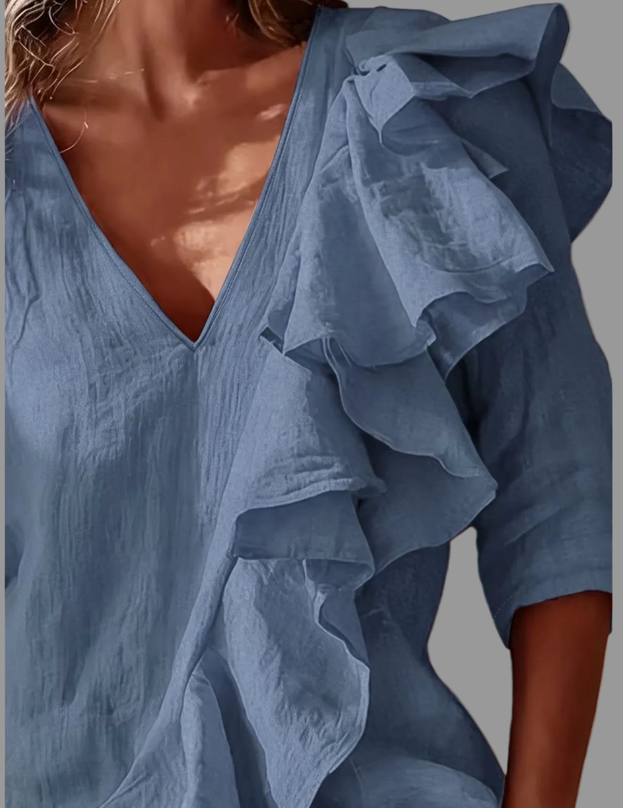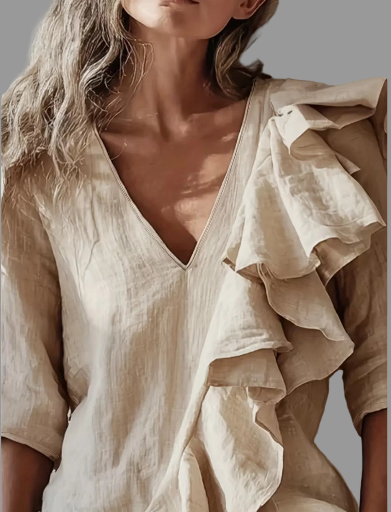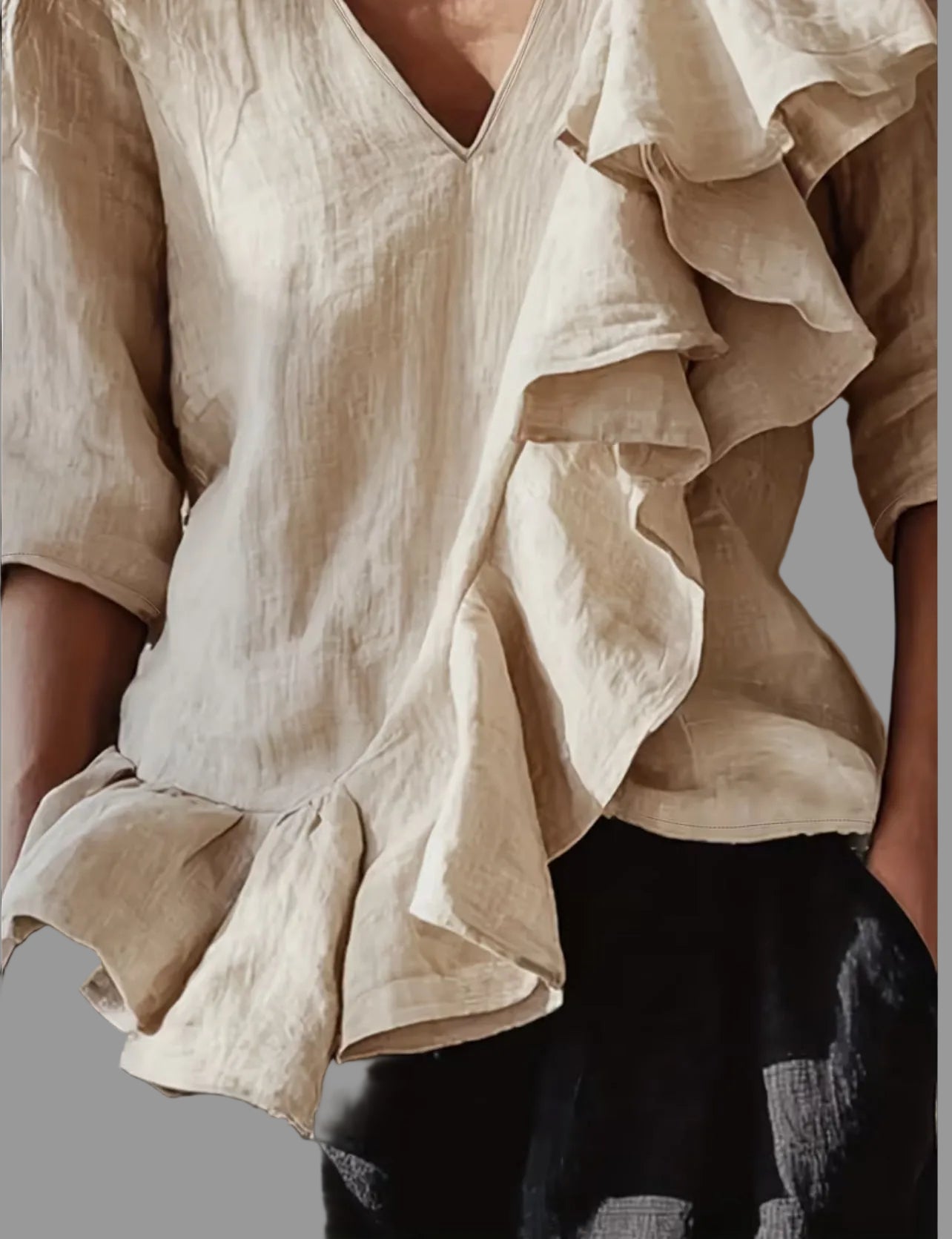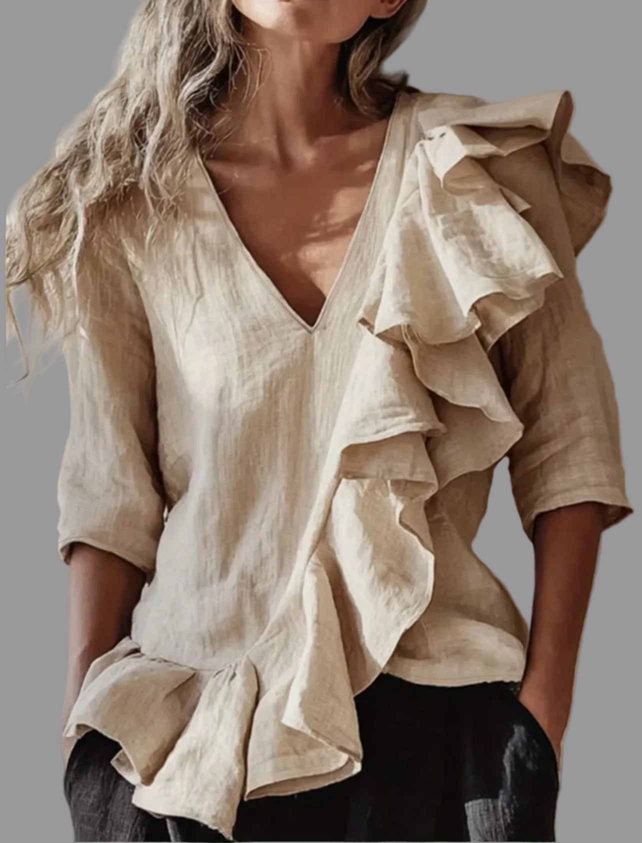 Esta camisa de tela fluida tiene un escote en forma de uve super favorecedor, y un volante asimétrico, diseñada para adaptarse a los diferentes estilos de mujer actual. Su confección permite una excelente transpirabilidad, lo que mejora la comodidad al usarla en diferentes entornos. Ideal para un look versátil y elegante. Perfecta para pantalones.