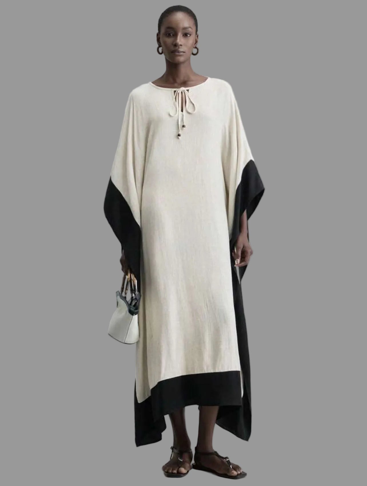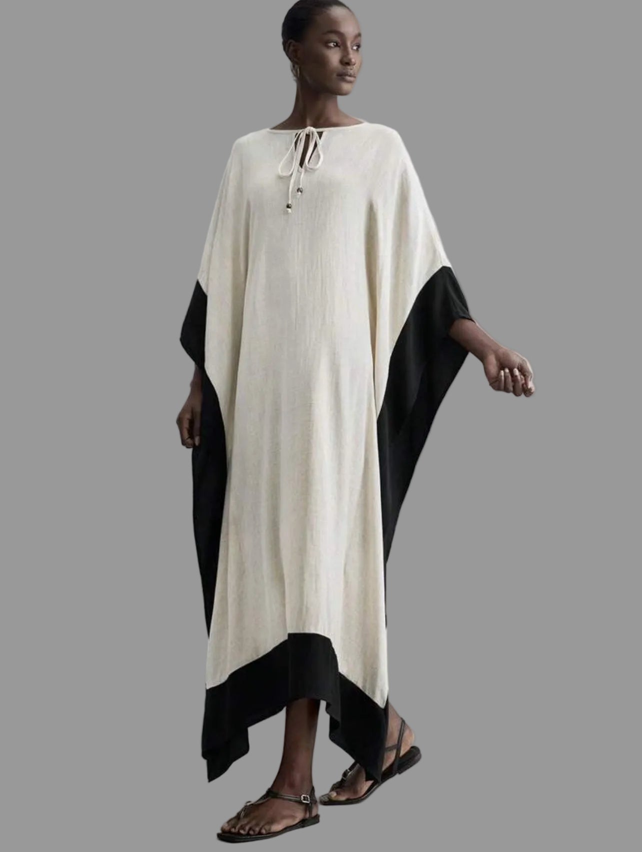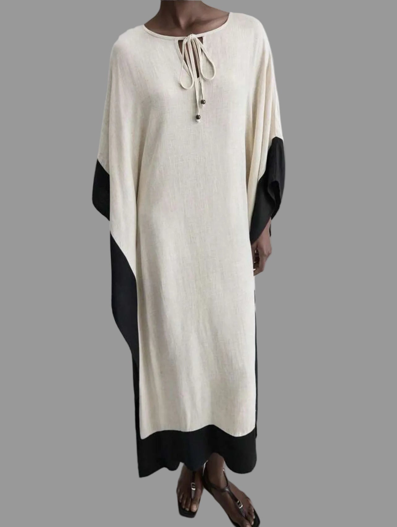 Este kaftán largo blanco y negro combina elegancia y frescura, ideal para diversas ocasiones. Su diseño destaca por un delicado borde negro que aporta distinción, mientras que su tono off white proporciona distinción en el verano. Perfecto para climas cálidos, es pura comodidad sin sacrificar el estilo.