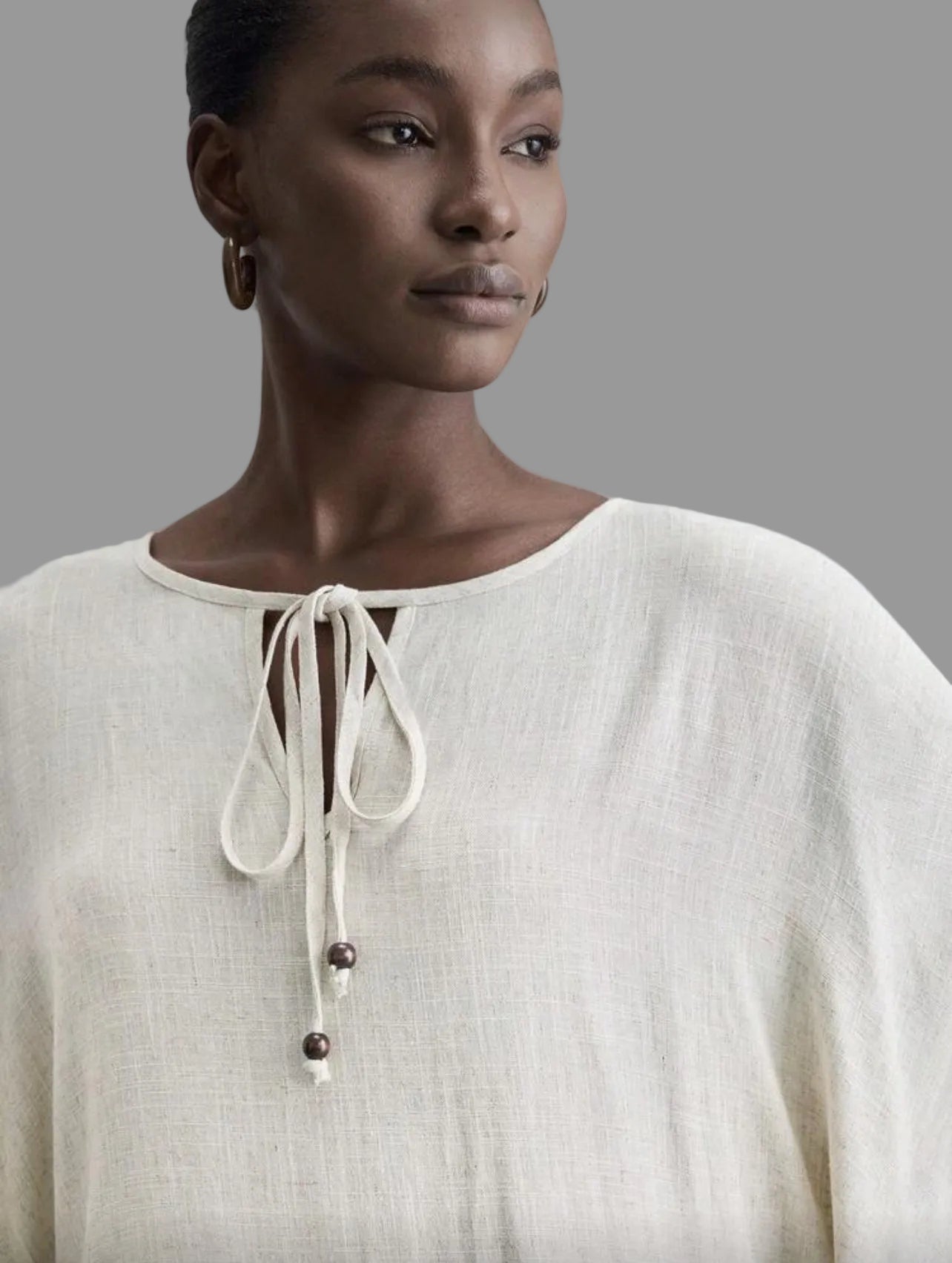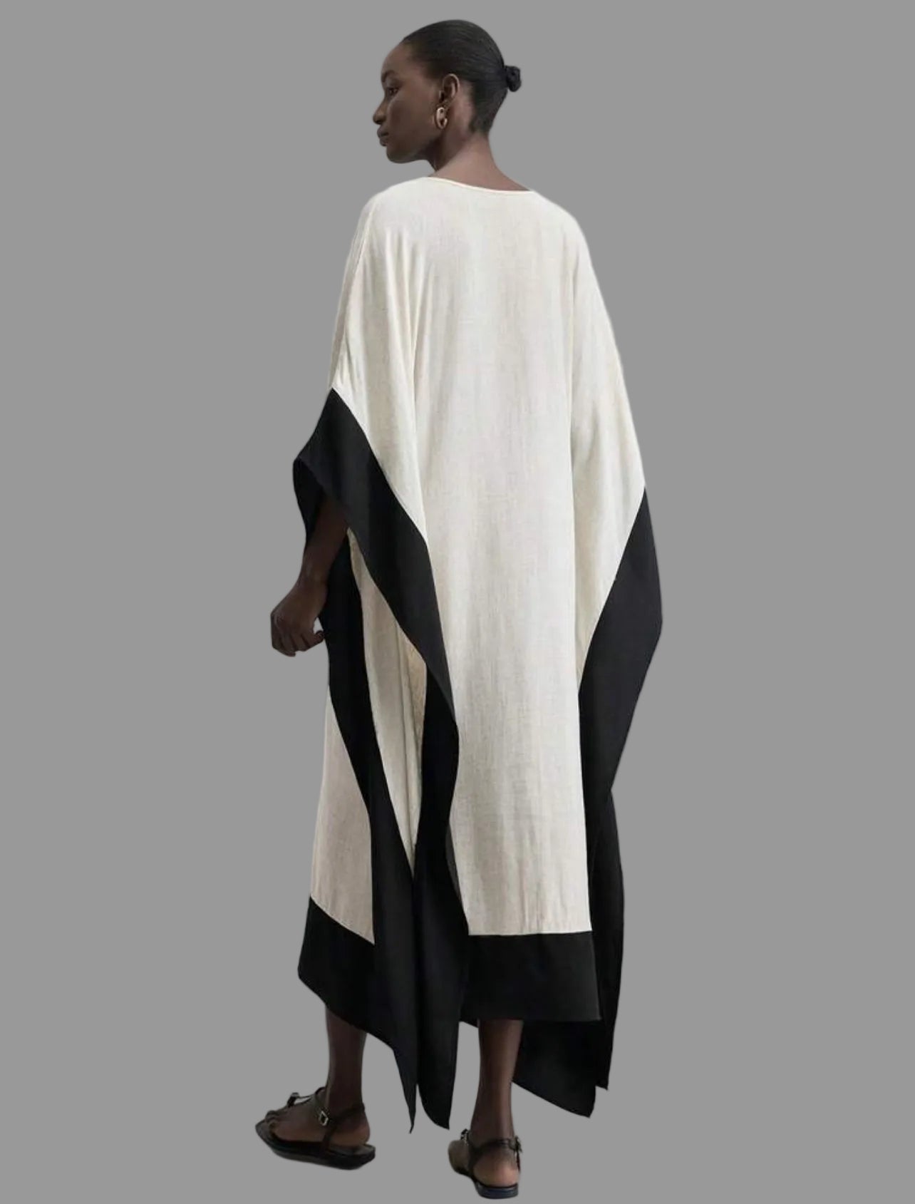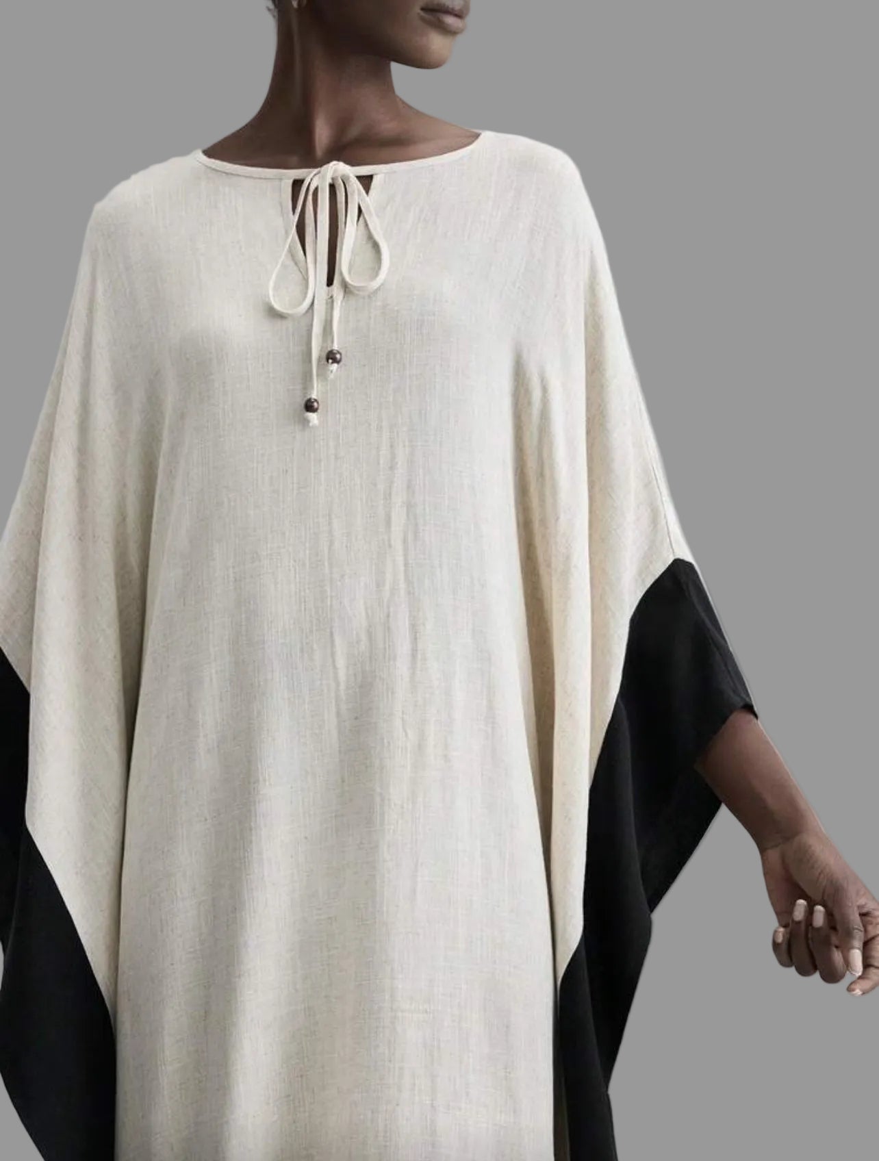 Este kaftán largo blanco y negro combina elegancia y frescura, ideal para diversas ocasiones. Su diseño destaca por un delicado borde negro que aporta distinción, mientras que su tono off white proporciona distinción en el verano. Perfecto para climas cálidos, es pura comodidad sin sacrificar el estilo.