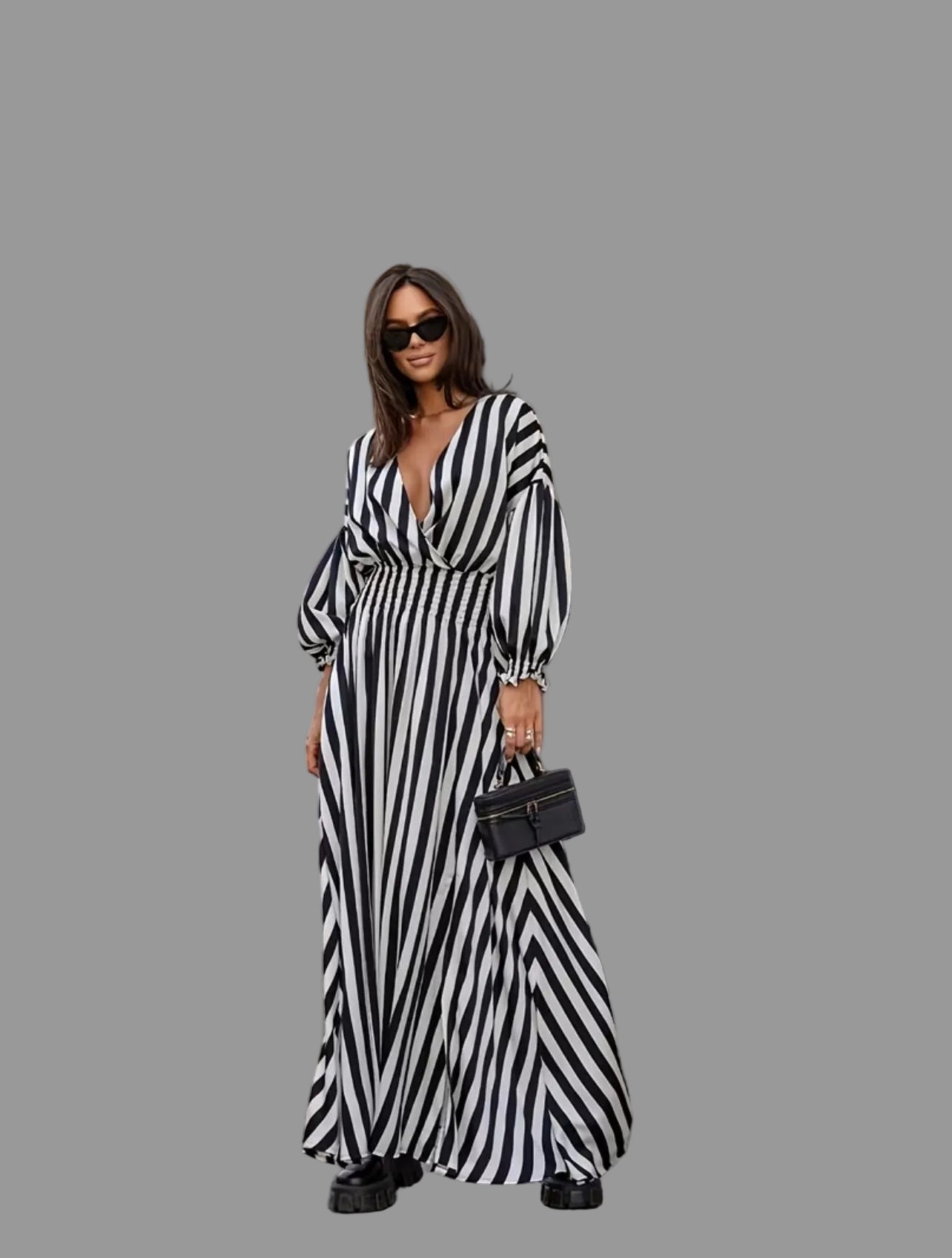 Este vestido largo de rayas con escote cruzado y mangas afaroladas, está diseñado para que junto a la comodidad tiene mucho estilo durante el verano. Su corte favorecedor y detalles elegantes lo convierten en una elección ideal para eventos informales, permitiendo una adecuada transpiración en climas cálidos.