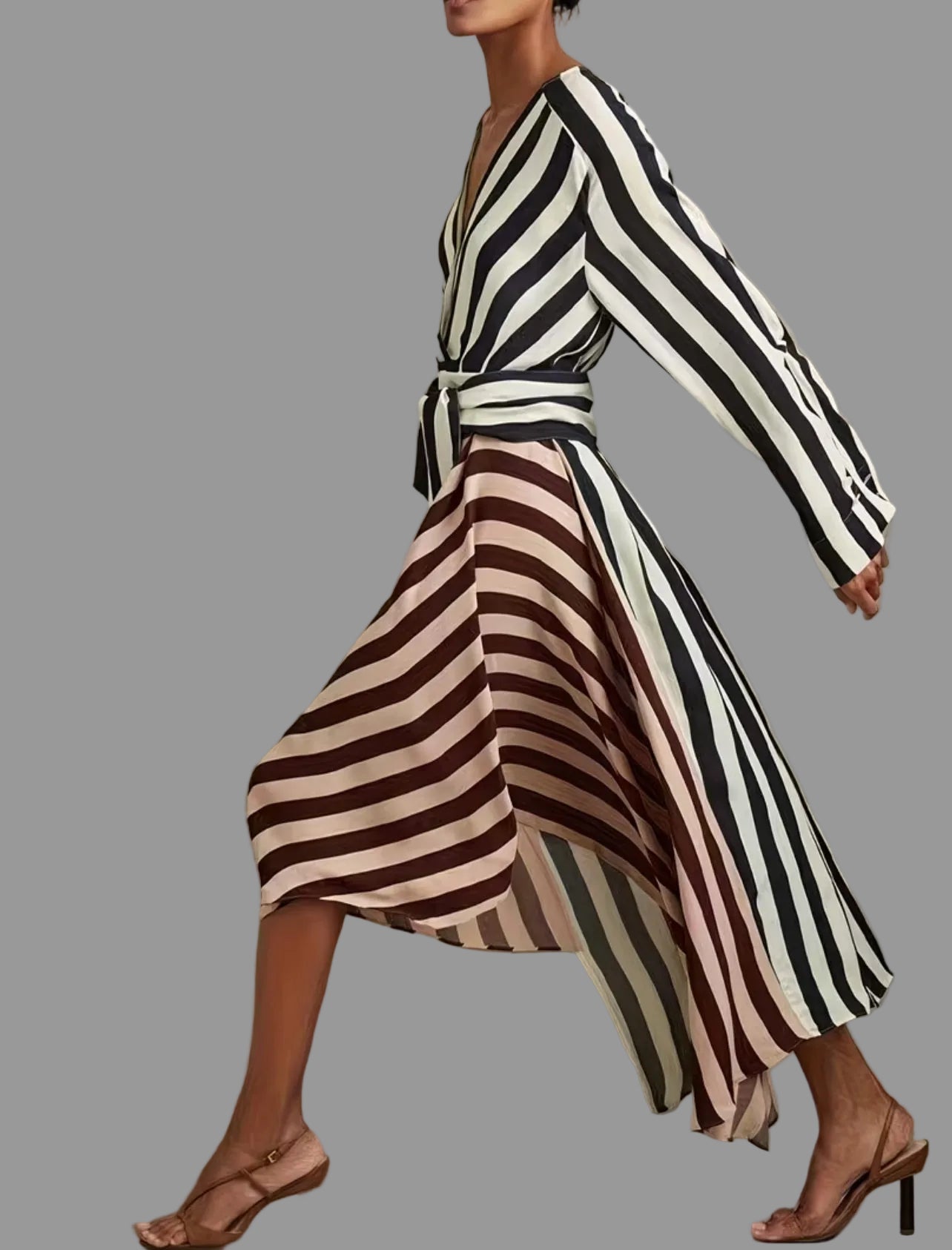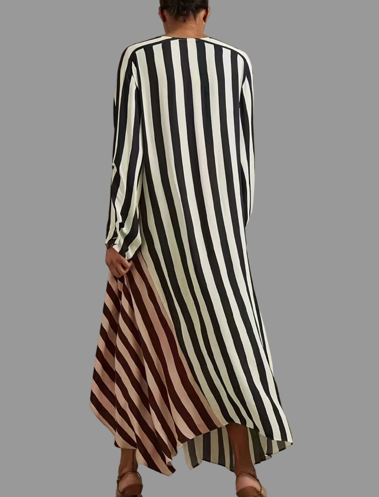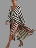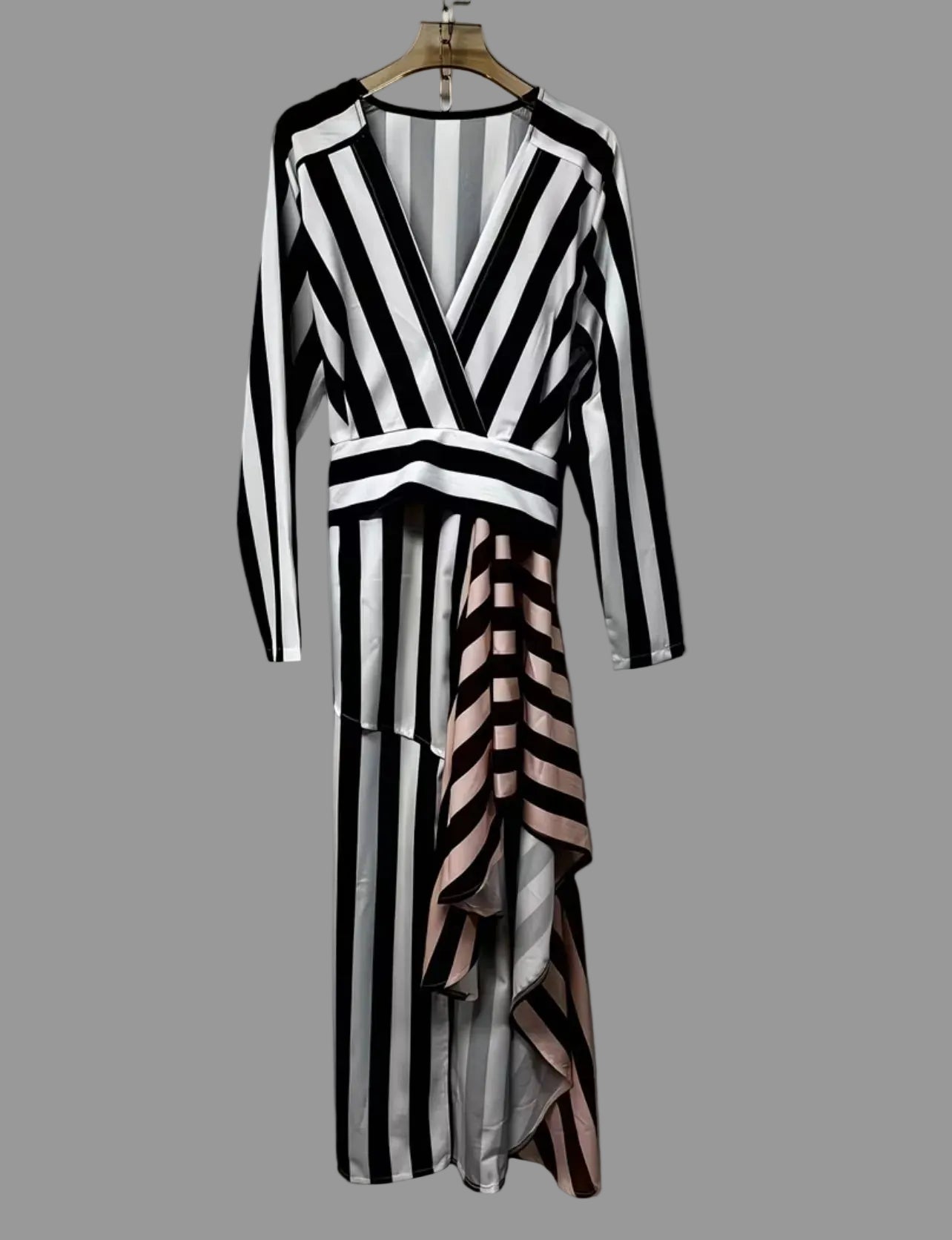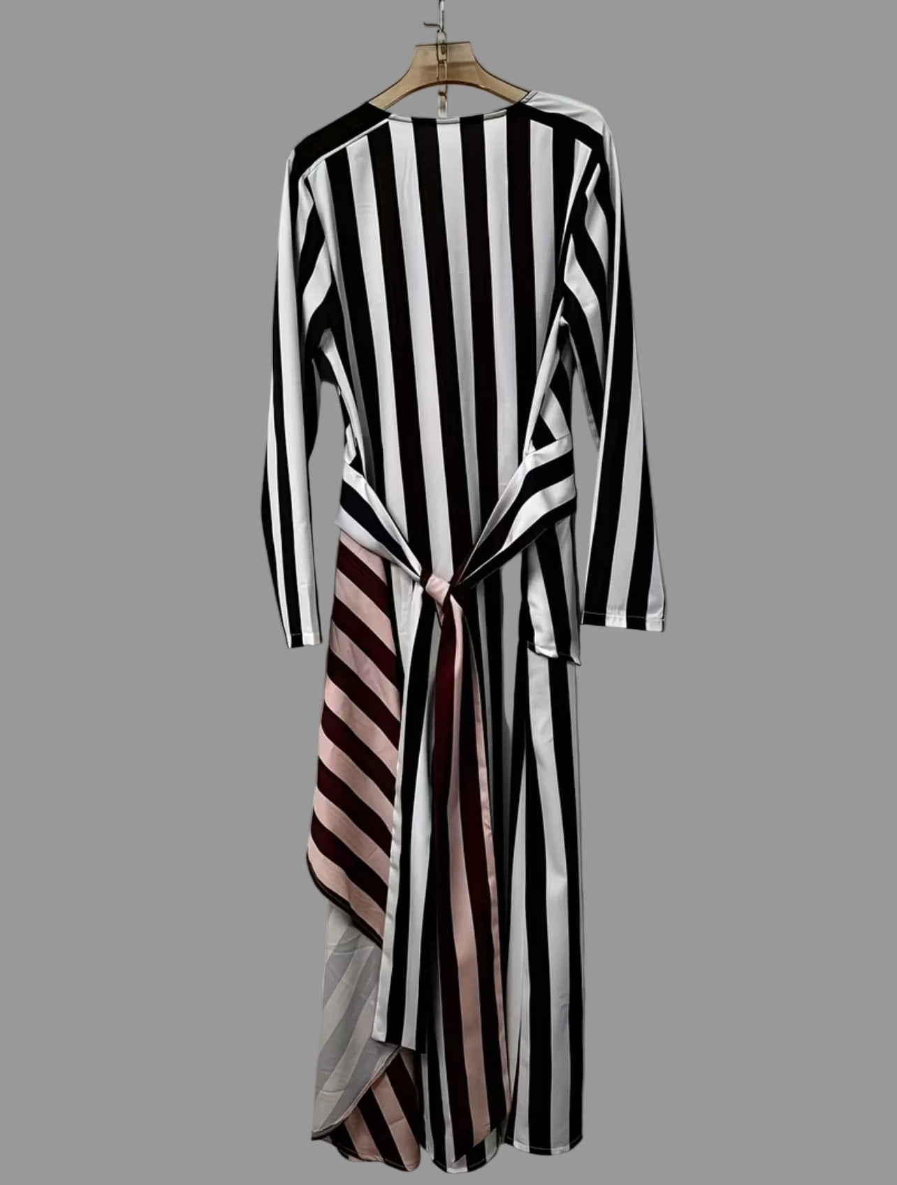 Vestido en raya clásica blanca y negra con un cruzado delantero que permite que se ajuste o llevar suelto. La tonalidad rosa le da un cambio a la estética recurrente. Es un vestido para uso diario y lavable. Las rayas blancas y negras se asocian con las mejores elegantes además de que estilizan y son muy fáciles de combinar con blanco y con negro y es una apuesta ganadora.