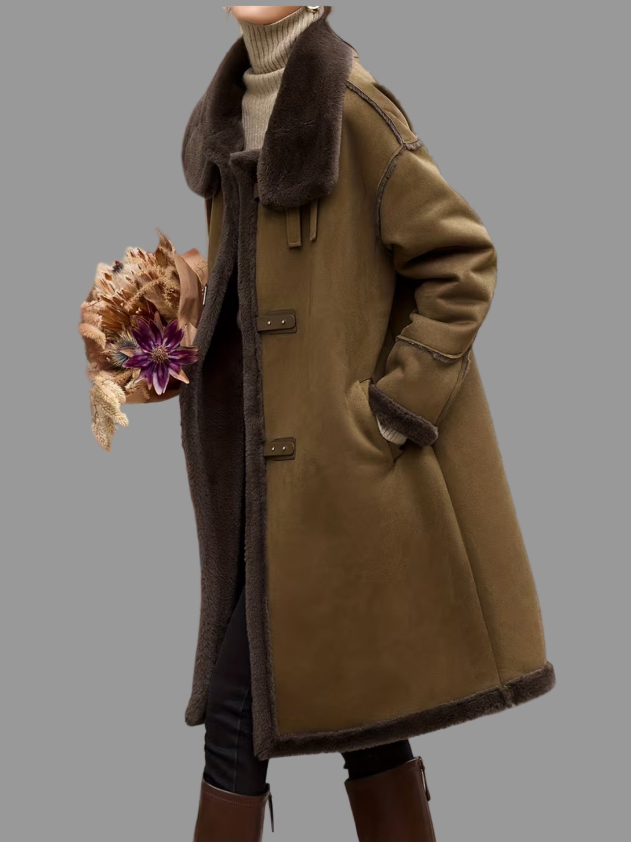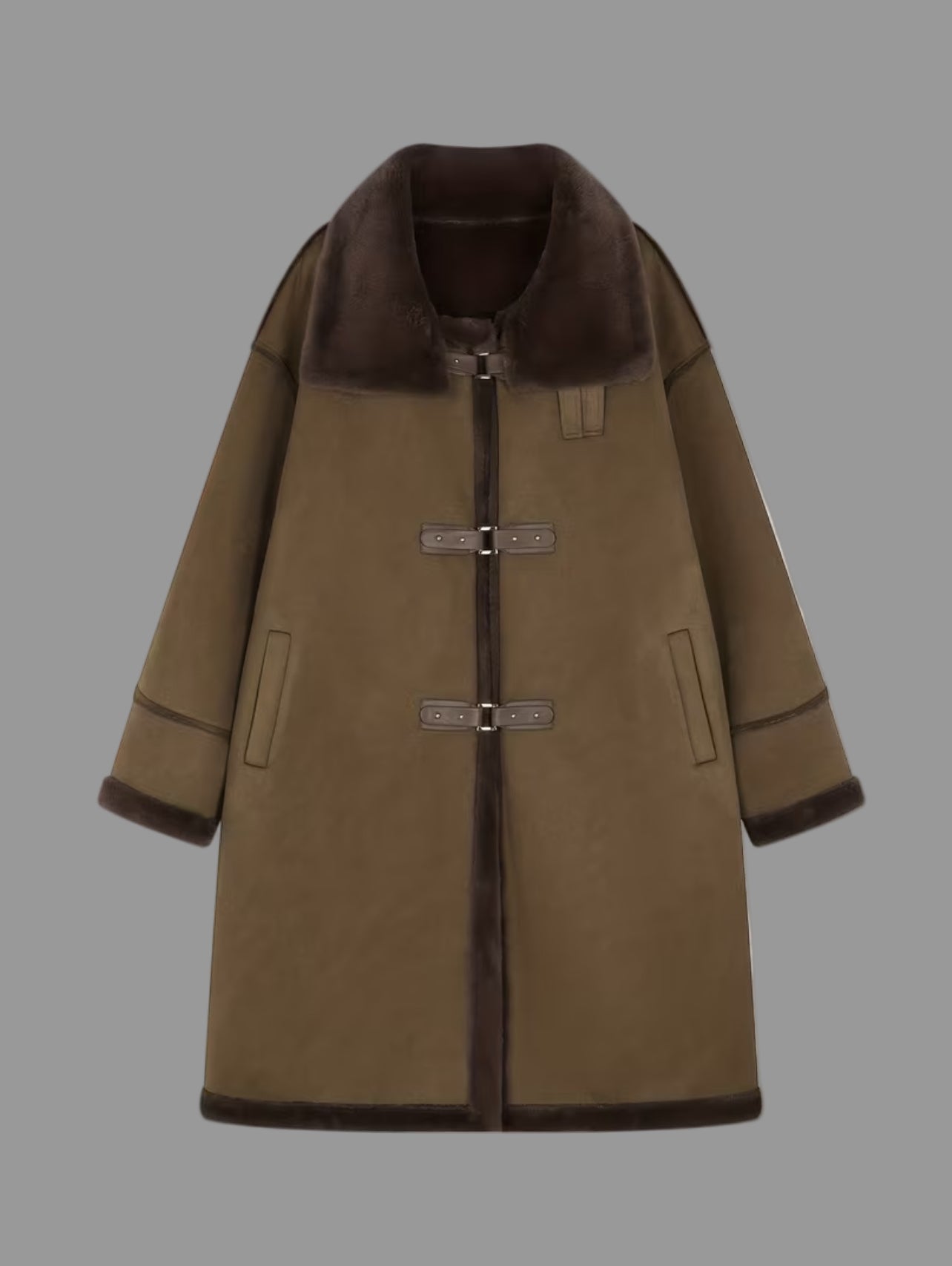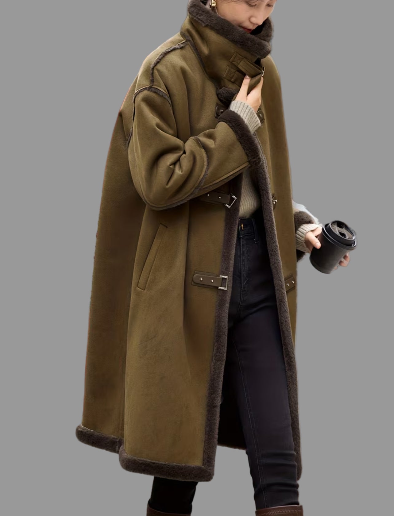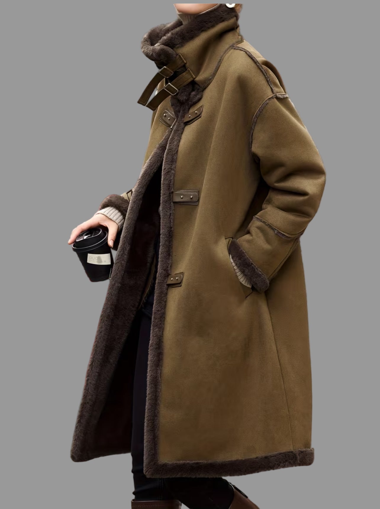 Este abrigo estilo trenka con cierres de cuero es perfecto para mantenerse abrigada y estilosa. Con su cuello que se puede subir para mayor calidez de piel vuelta, es lavable y tiene un tejido súper agradable. ¡Una mezcla nostálgica y moderna con un toque de piel natural!