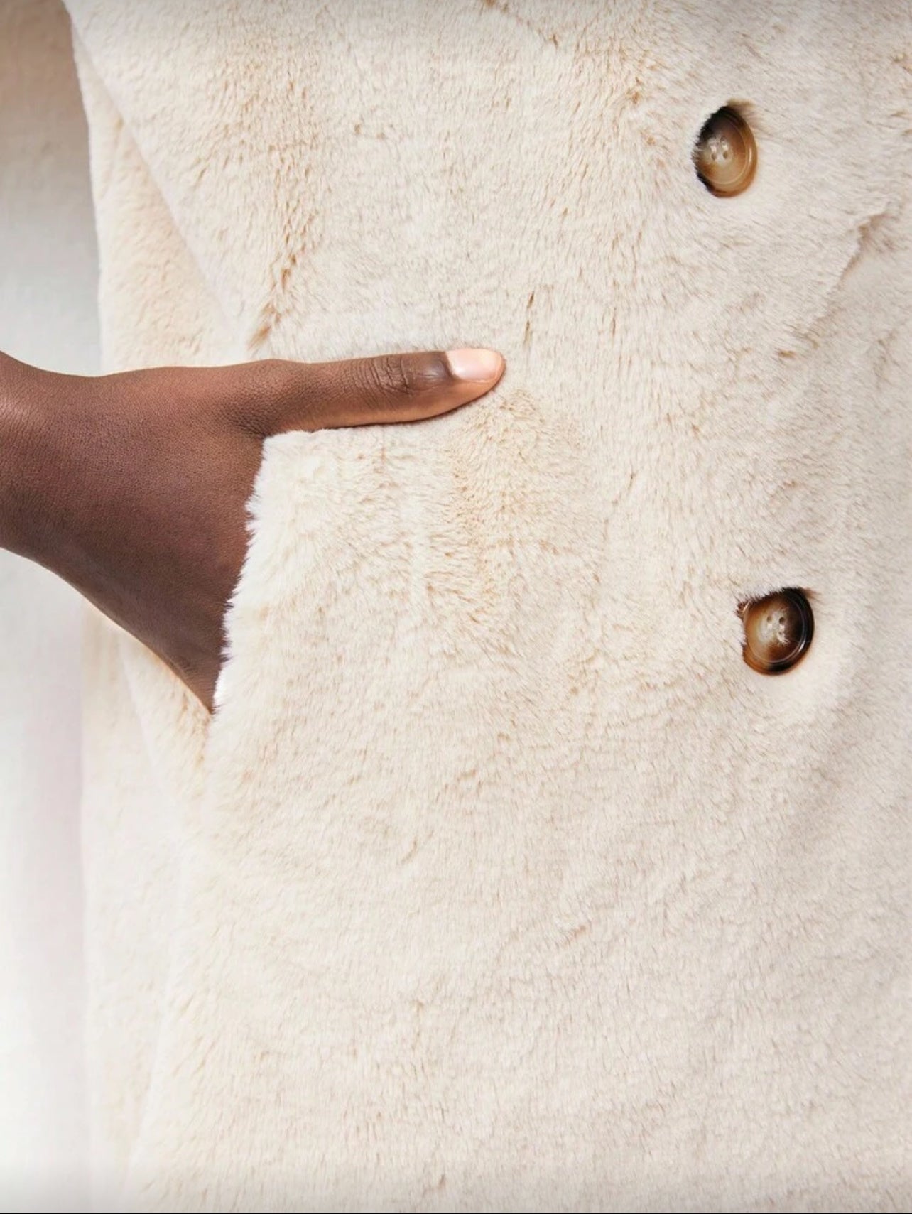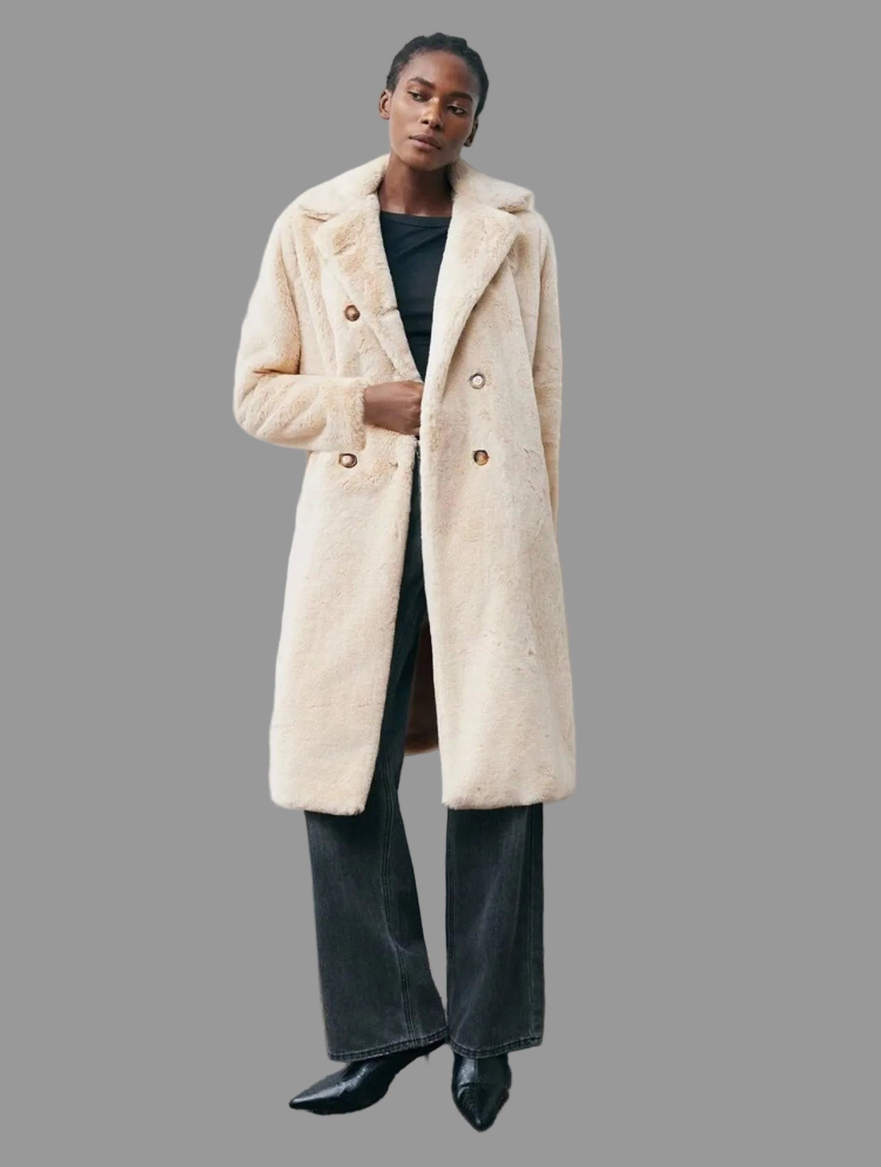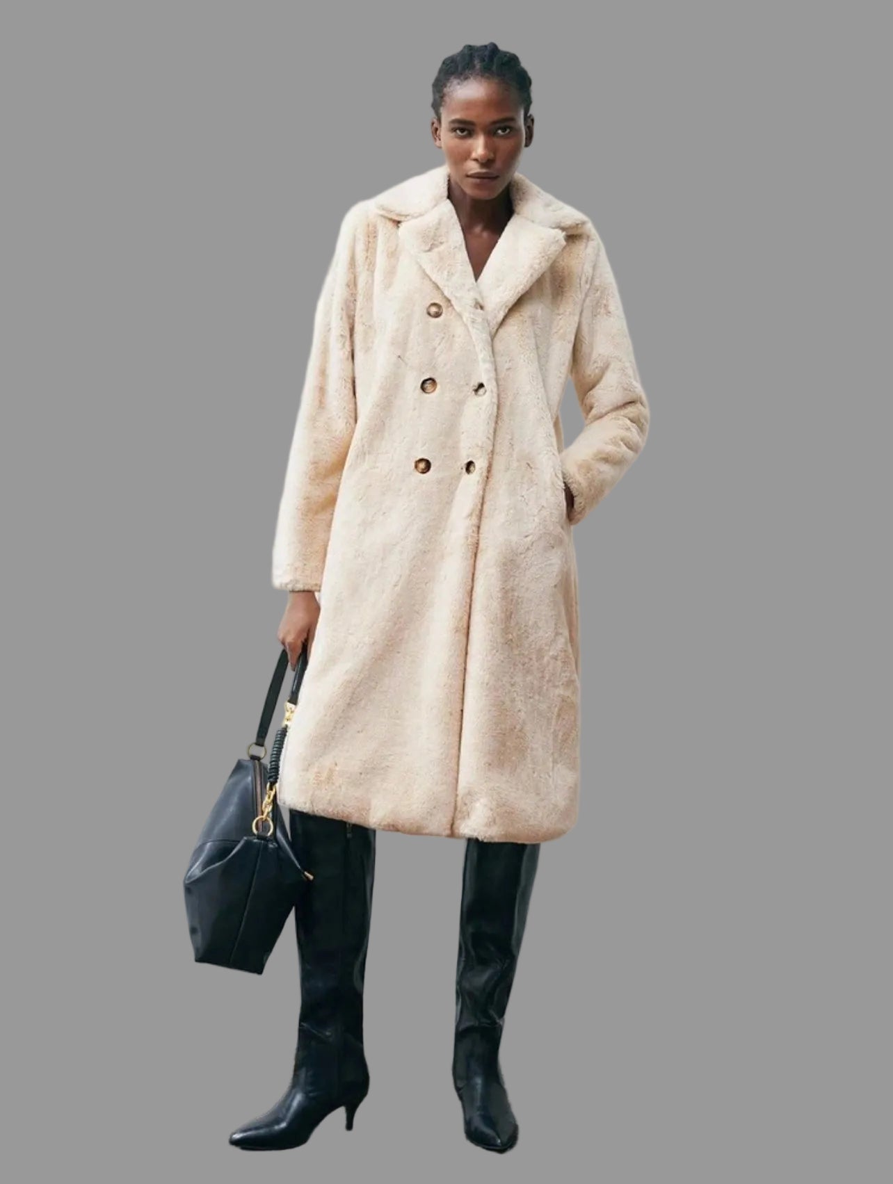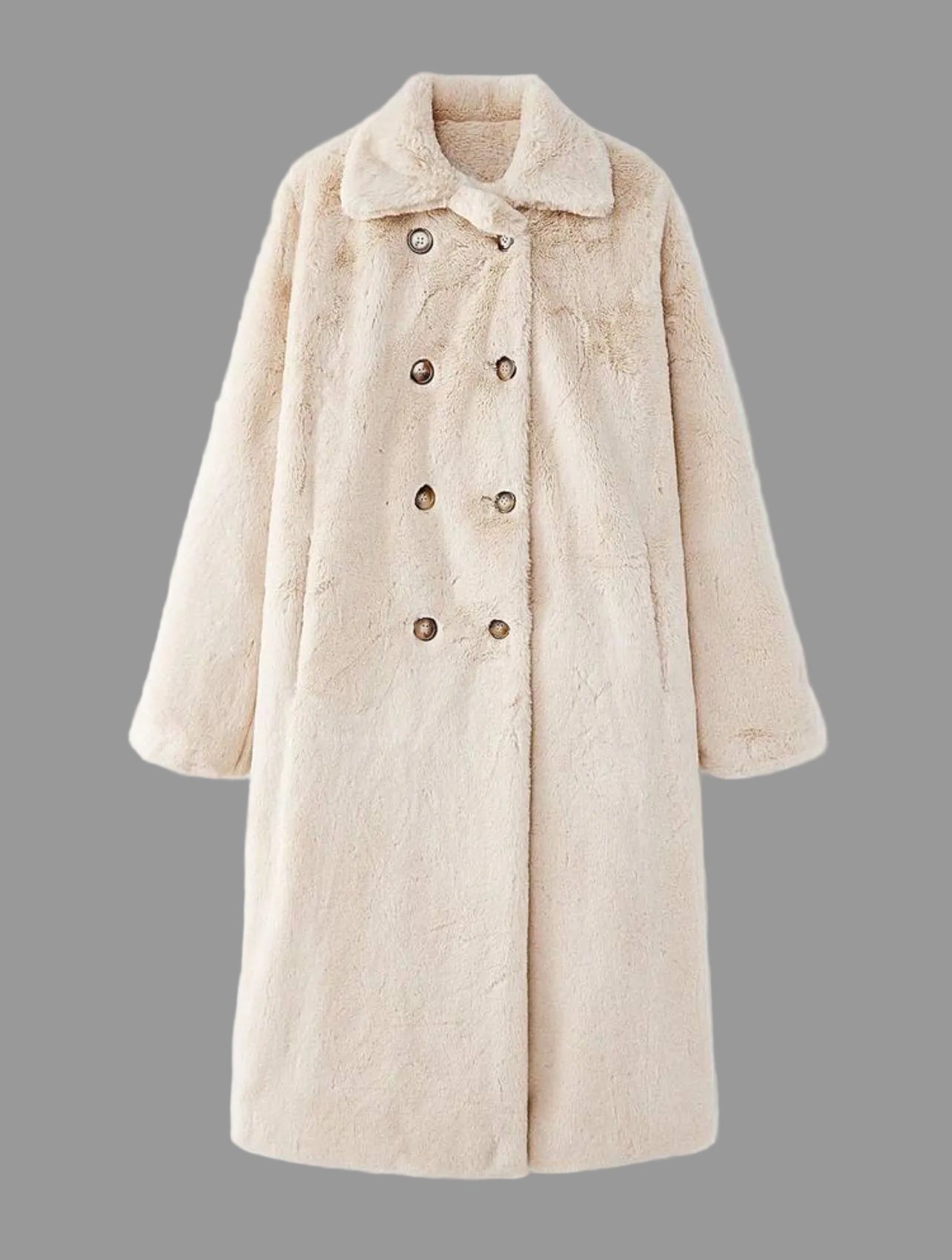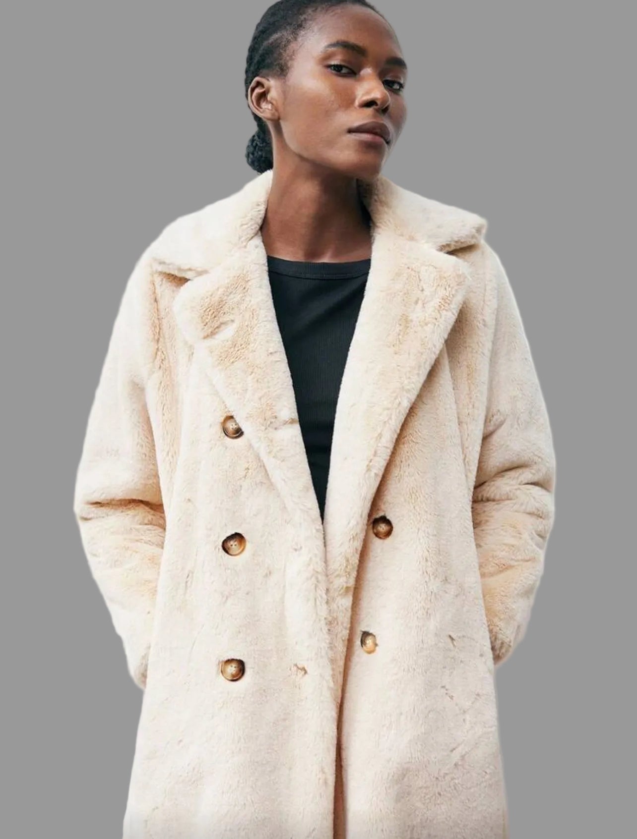Descubre la elegancia y calidez del abrigo cruzado de pelo ecológico, suave como un peluche. Con su suave tacto y forro maravilloso, te mantendrá abrigada y con estilo. Su corte clásico combina perfectamente con cualquier outfit, especialmente en el color blanco roto top este año. ¡Una prenda imprescindible para tu armario!