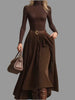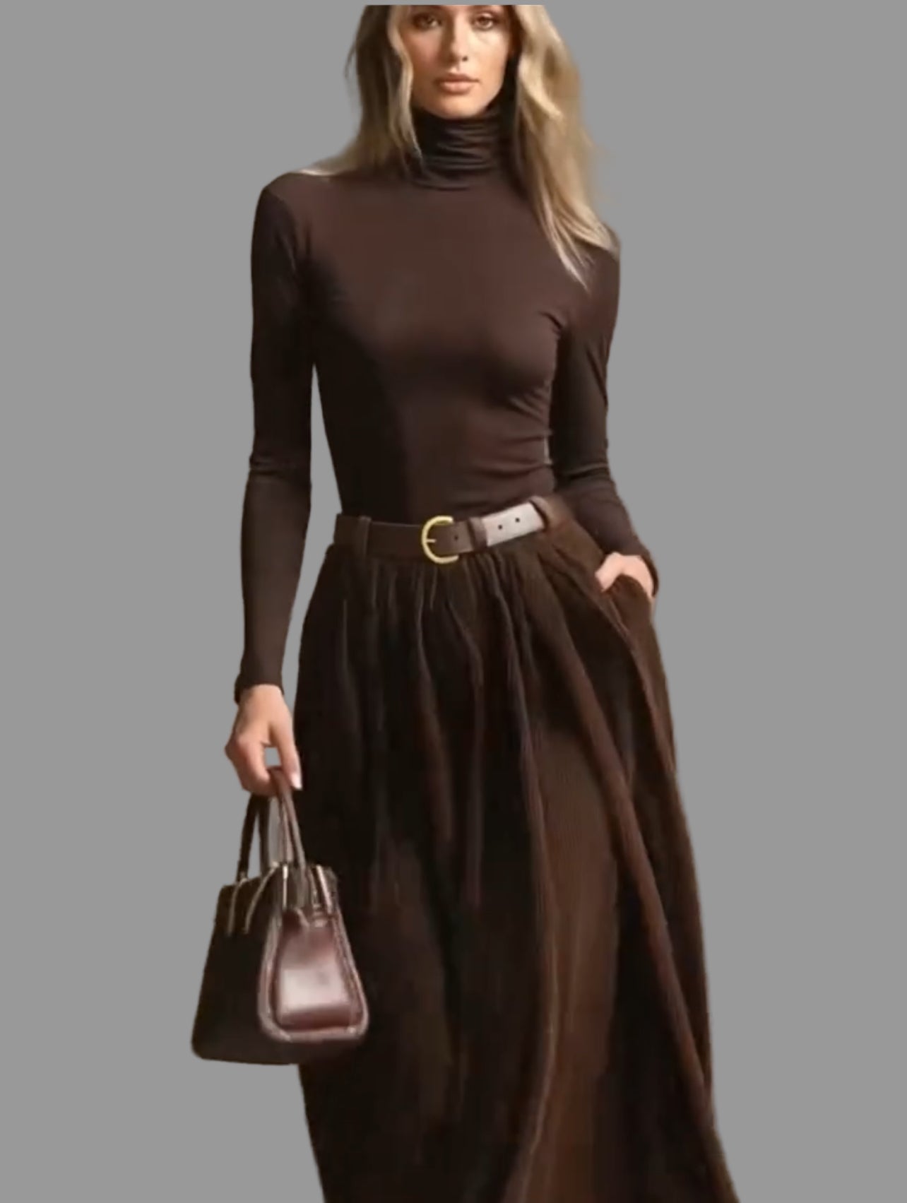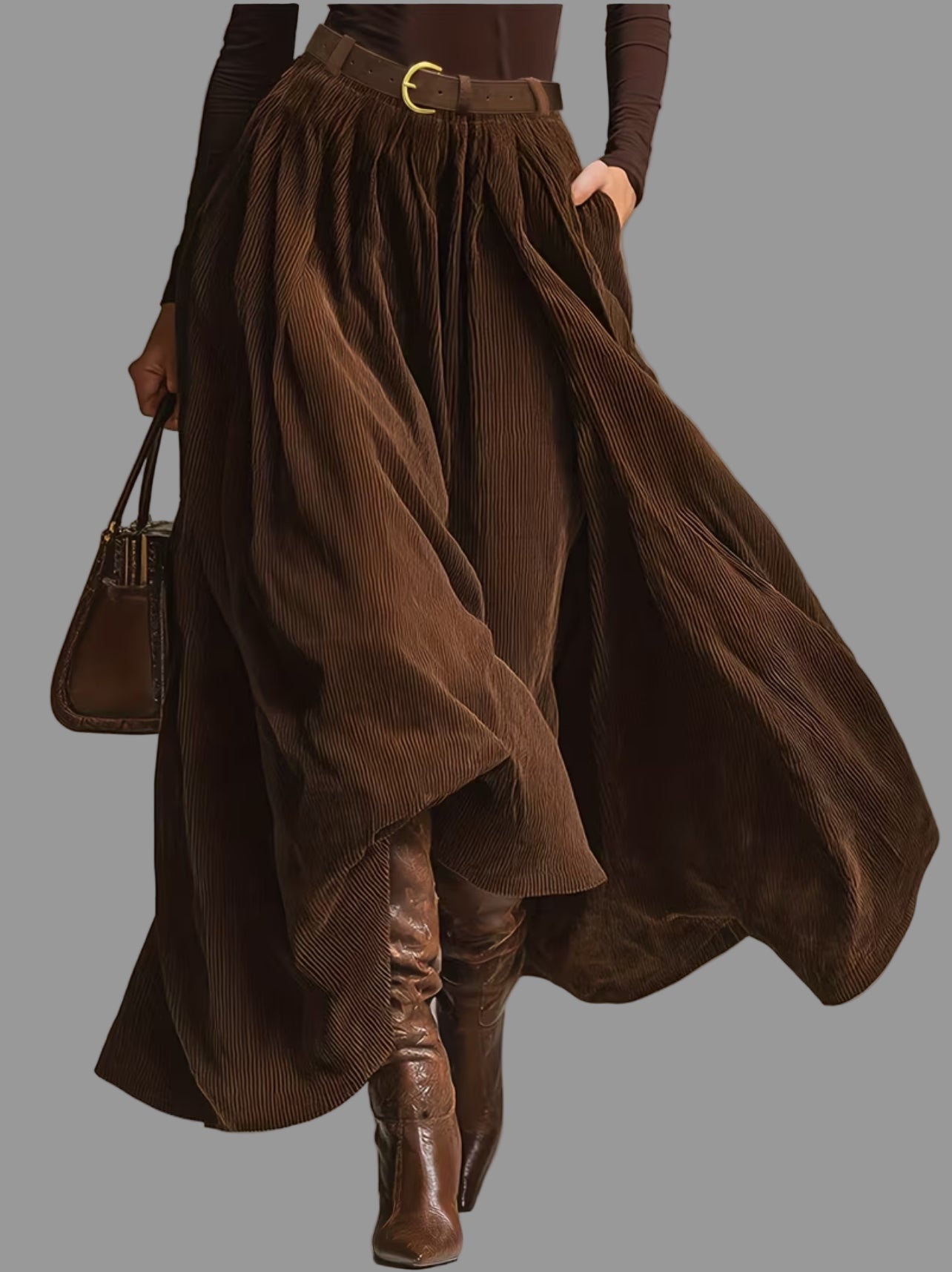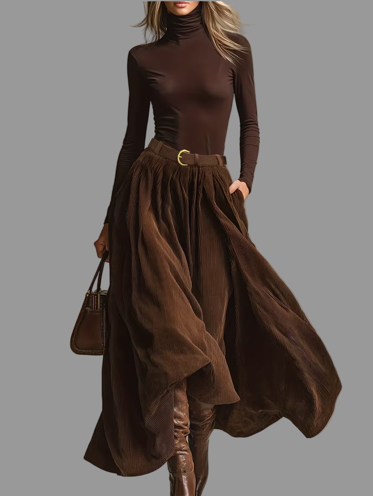 Disfruta de un look juvenil y versátil con nuestro conjunto de falda de pana y camiseta elástica de cuello alto. La pana es un material en tendencia, mientras que el cuello alto agrega un toque elegante. Puedes completar este conjunto con una cazadora o un blazer, o llevarlo directamente con abrigo, o si el tiempo lo permite, sin nada encima. Se recomiendan collares para completar el look y botas.