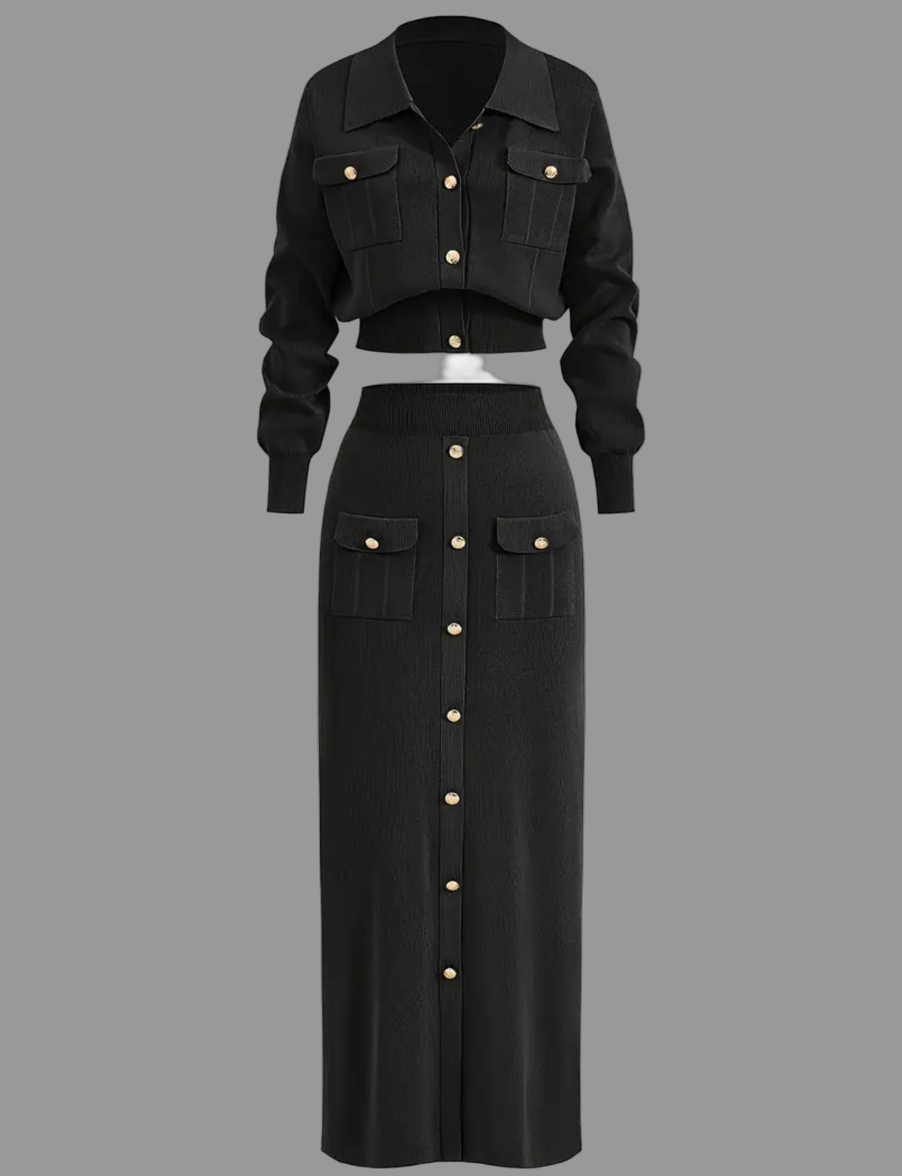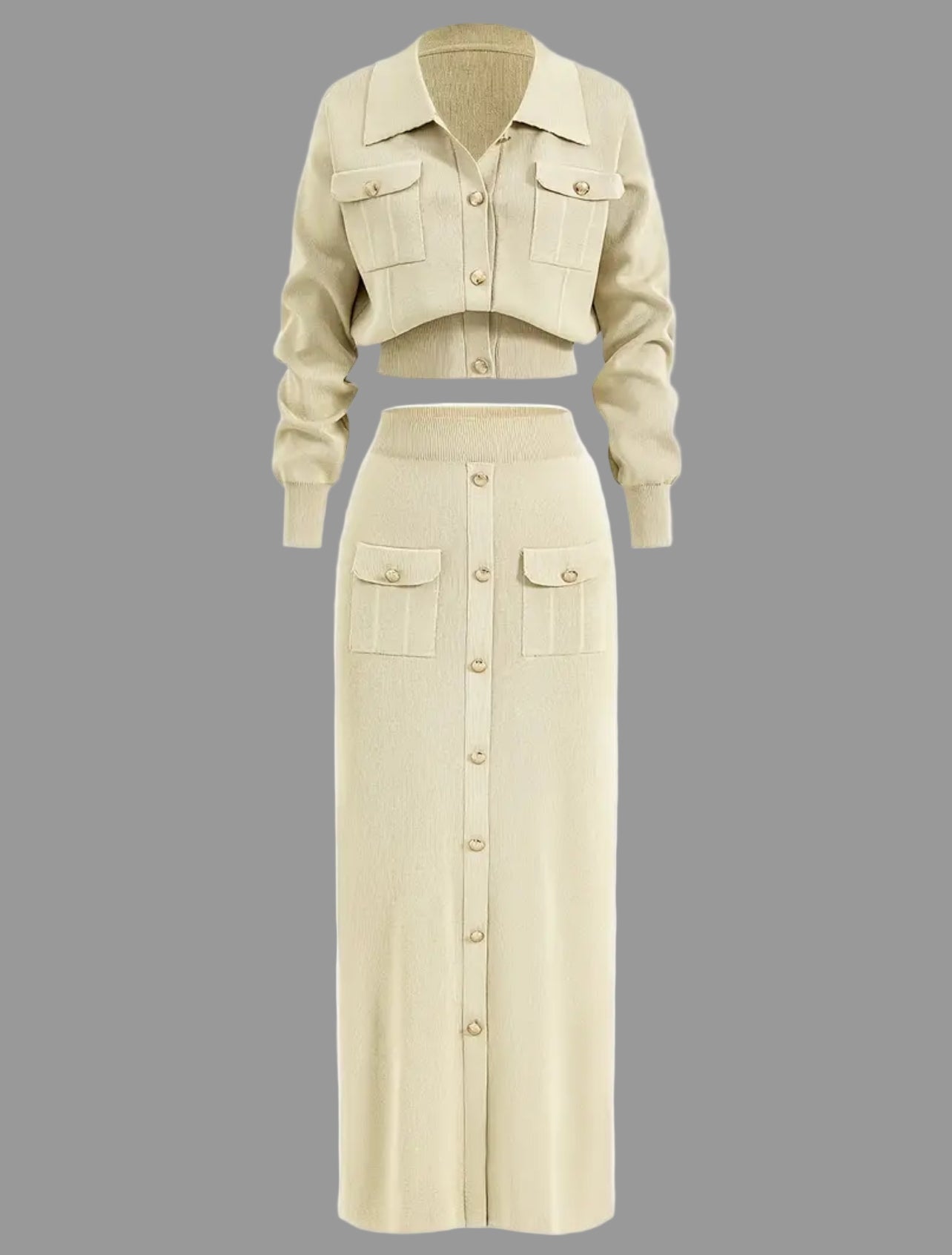 Este conjunto de punto es una combinación elegante y versátil para cualquier ocasión. Incluye una parte de arriba con estilo cazadora y una falda con botones, disponible en colores clásicos y brillantes. Es muy necesario tener un conjunto como este en invierno. No se pega, y da bien de talla. Perfecto para eventos o para el trabajo, también puede ser usado por separado y combinado con blazer. se recomienda con botas o botines.