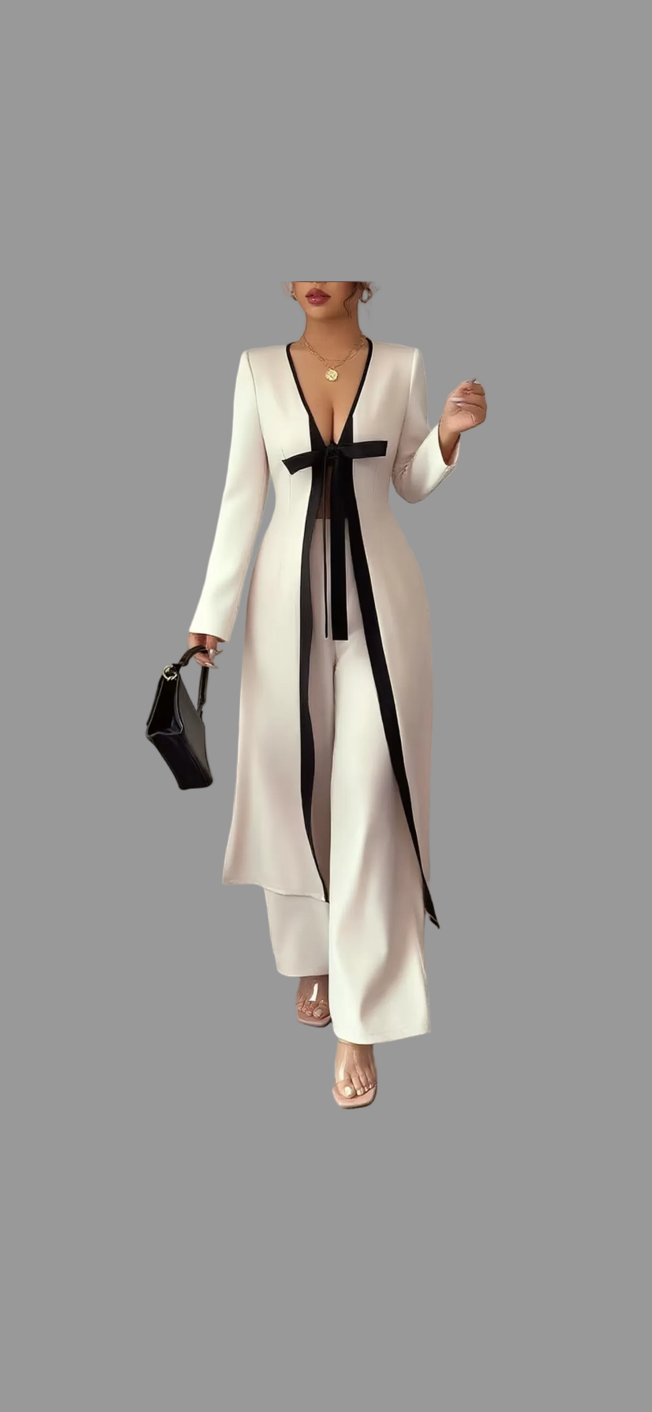 Este Conjunto de Levita con Lazo es ideal para eventos formales, diseñando una apariencia sofisticada. Su lazo bicolor no solo añade un elemento estético, sino que también permite versatilidad en el uso. Este conjunto es apropiado para quienes buscan elegancia sin sacrificar el confort. Pantalón con cintura con goma.