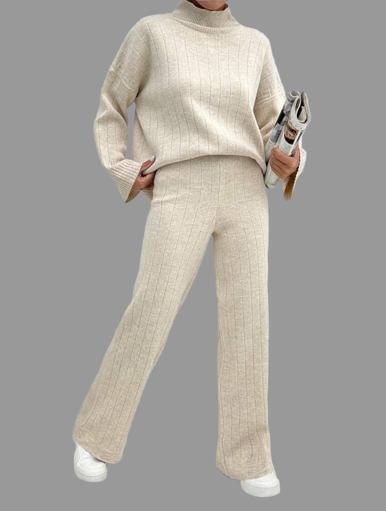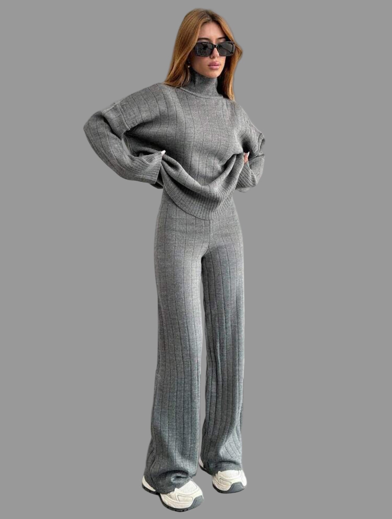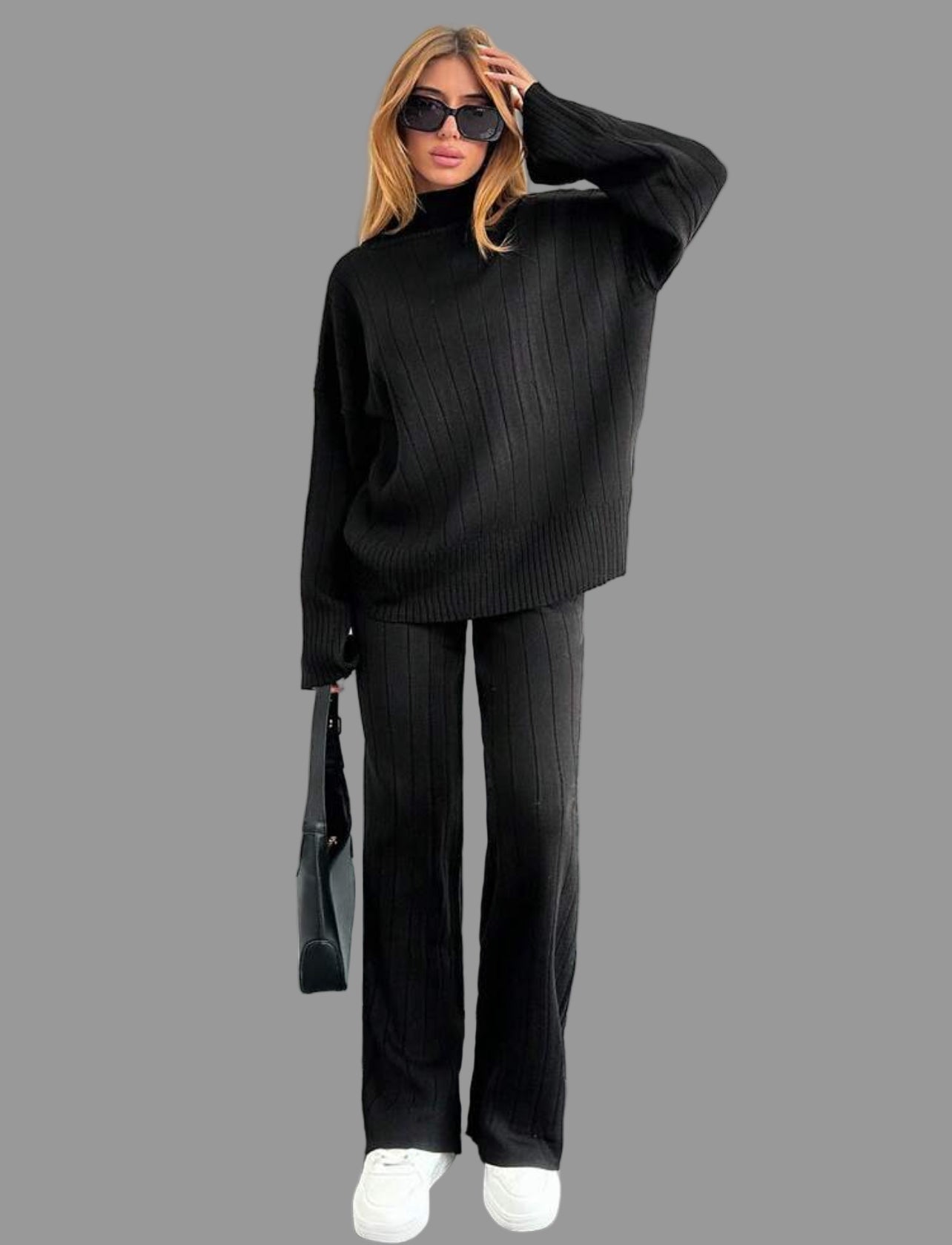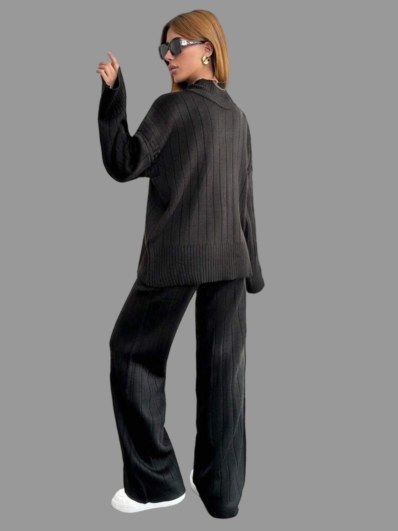 Este conjunto de punto, formado por un jersey y un pantalón de lana, es básico pero especial al mismo tiempo. Hecho con muy buena calidad, su largo hasta debajo del trasero y sus colores básicos, aseguran un look favorecedor y versátil. Perfecto para combinar en cualquier ocasión. Todas grandes marcas lo tienen en sus colecciones porque es esencial en invierno. Confortable y evolucionando hacia el estilo cómodo y DISTINGUIDO.