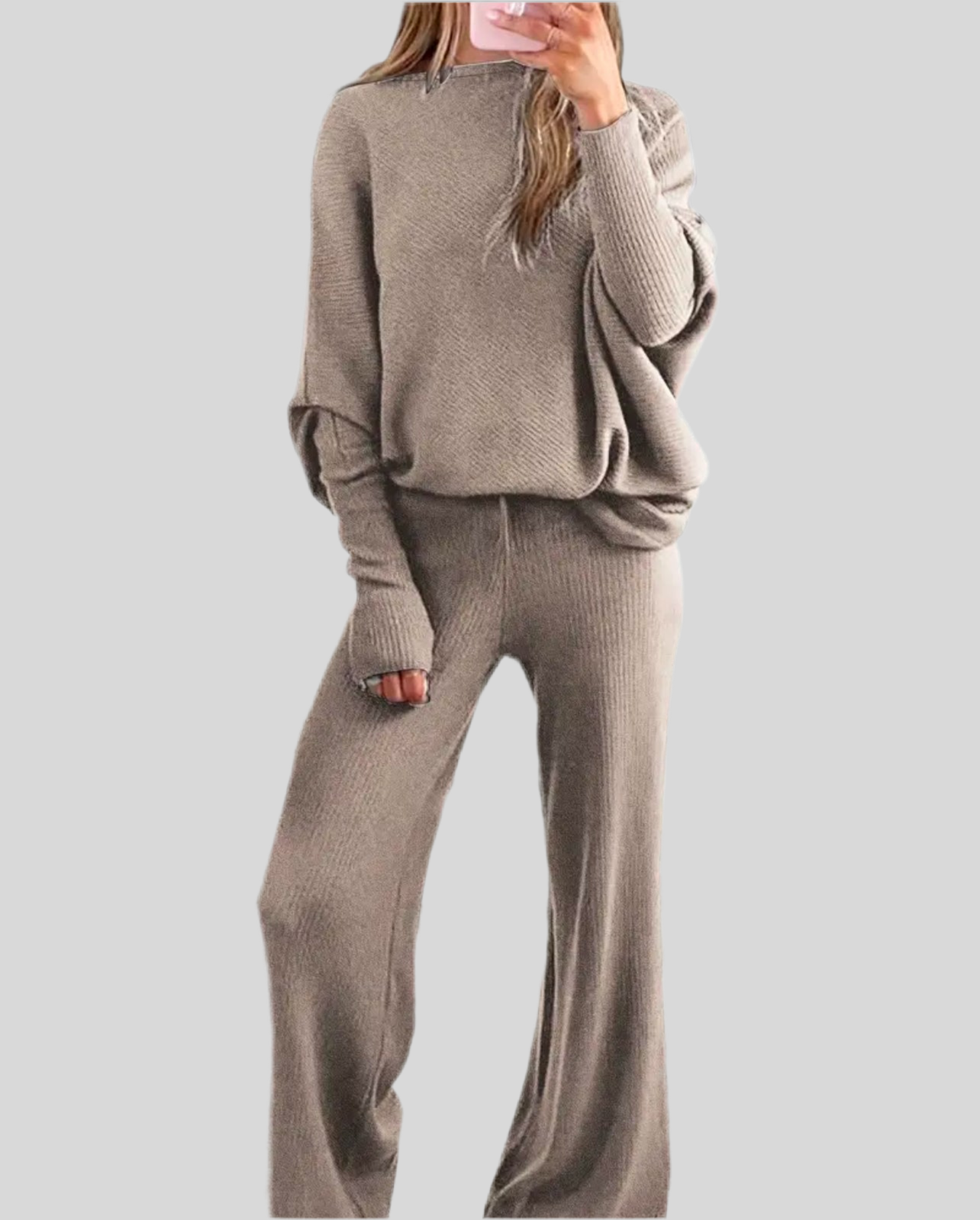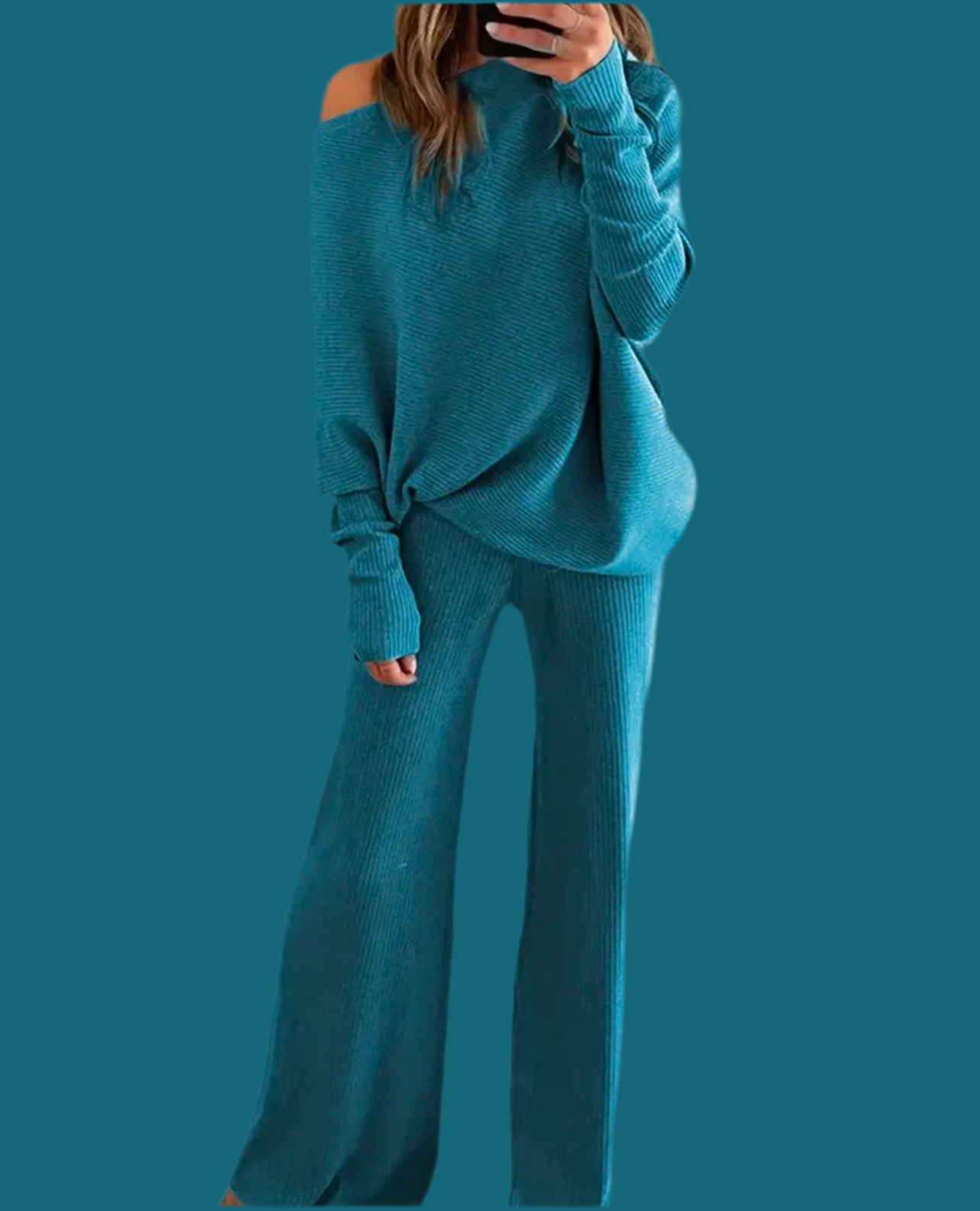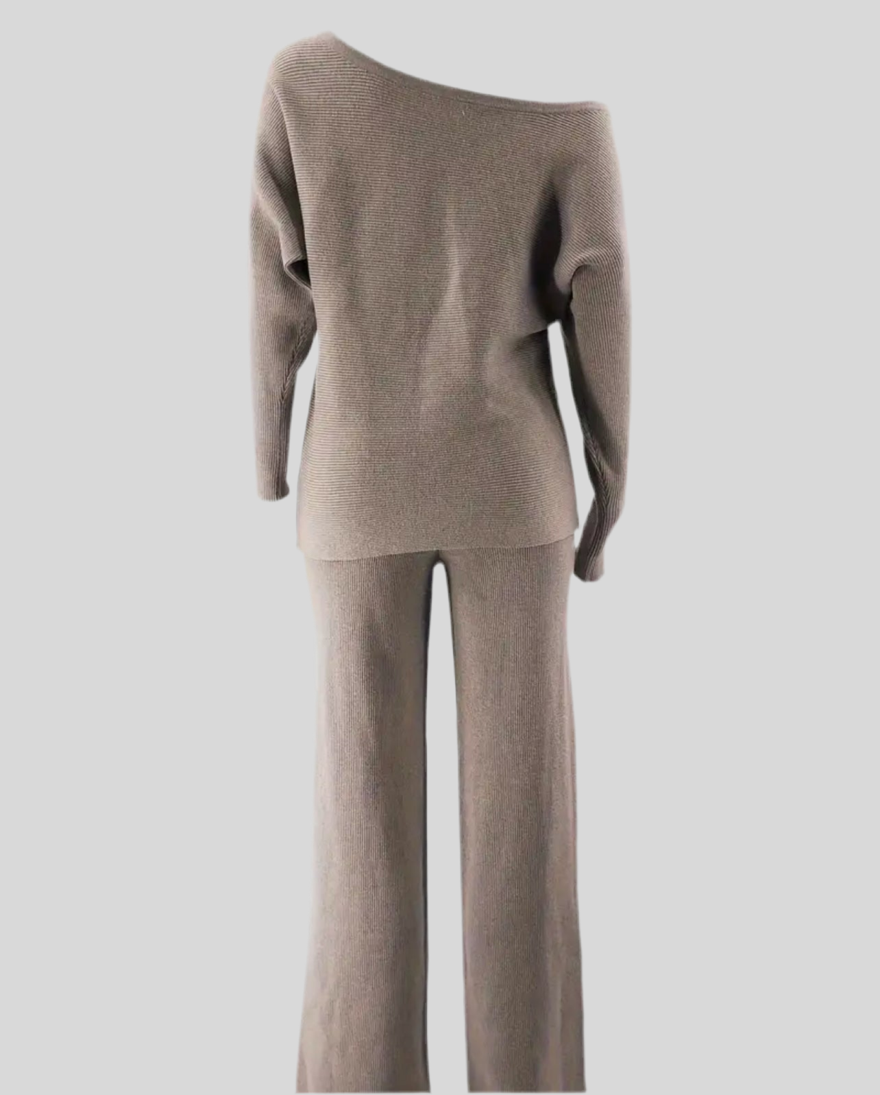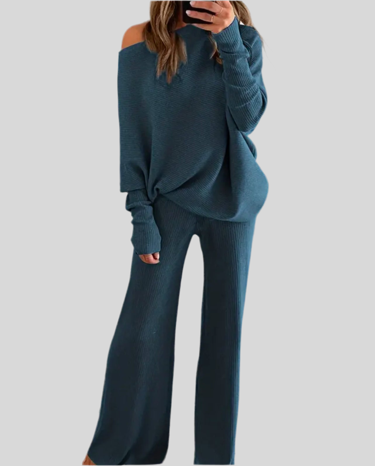 Este conjunto de punto con cuello barco es perfecto para mostrar un estilo elegante y relajado. El cuello barco permite llevar un hombro caído, mientras que el jersey amplio y el pantalón recto en colores sólidos y de temporada, te brindan comodidad y versatilidad. Vístete en tendencia y cómoda con este conjunto.