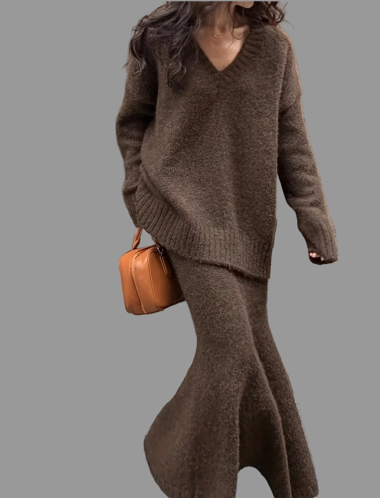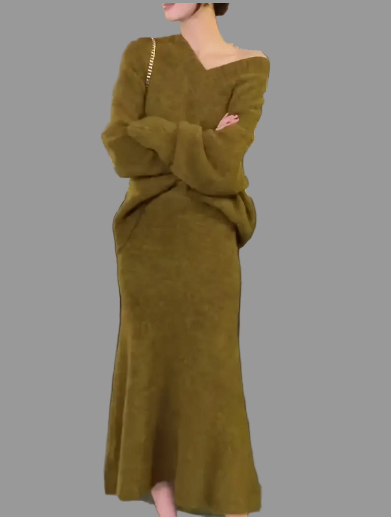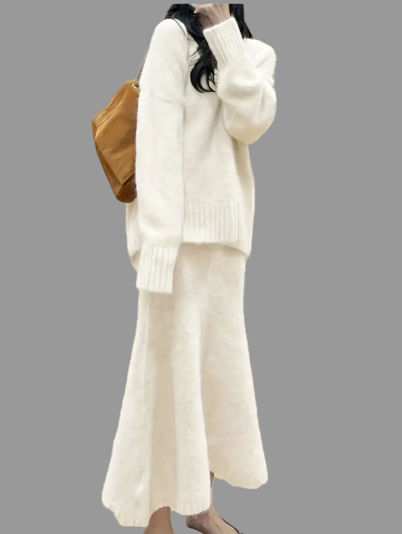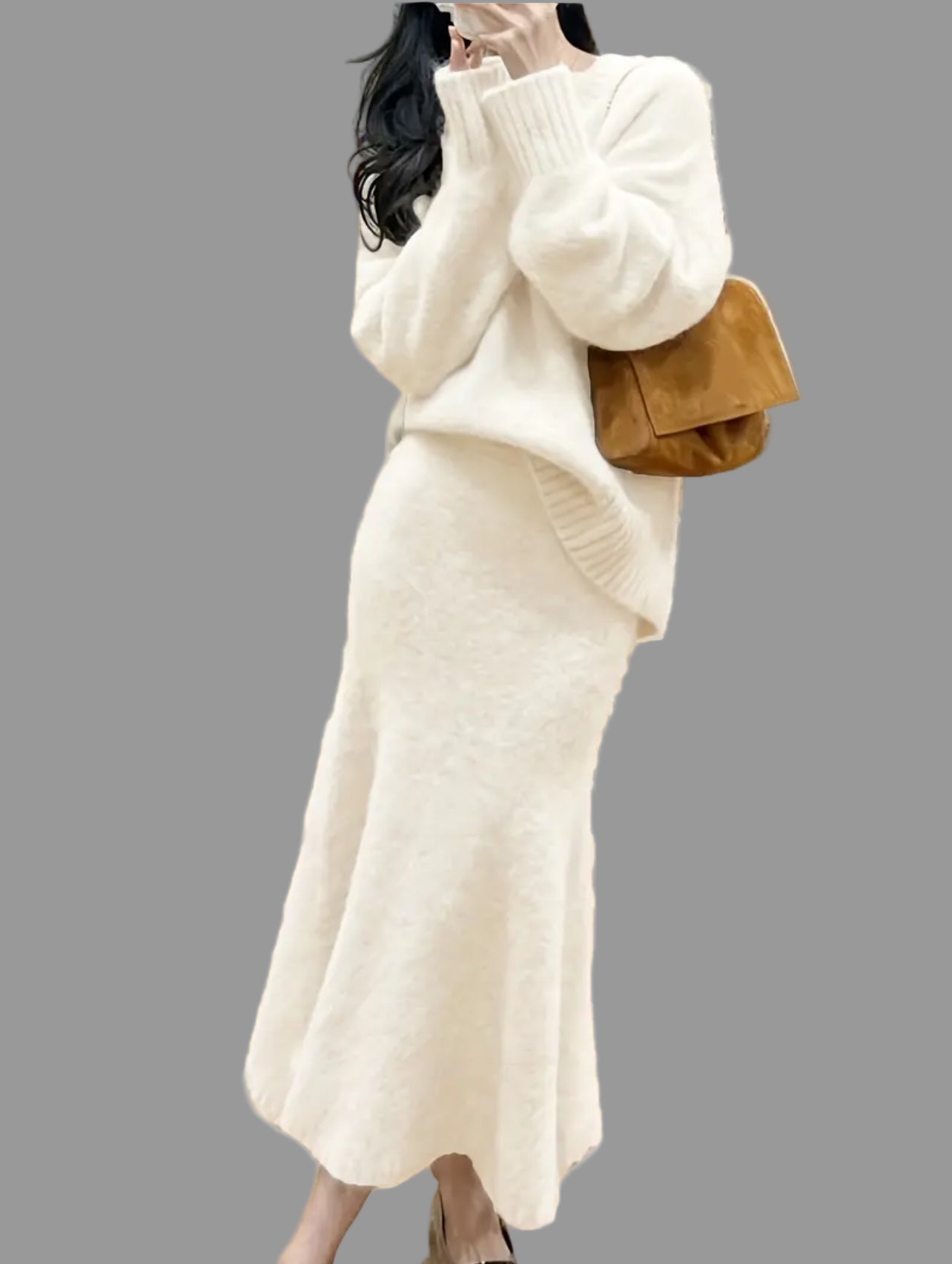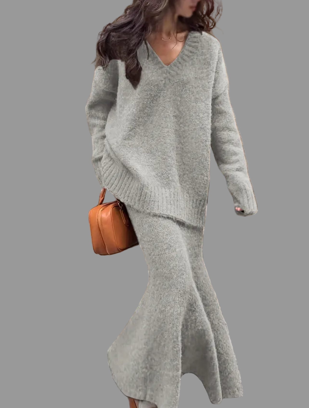 Este conjunto de punto, de jersey amplio con escote en pico y falda estilo sirena son la combinación perfecta de comodidad y estilo. Úsalos con abrigos, chaquetones, plumas o cazadoras para un look estiloso y moderno. Disponible en 3 colores. ¡Apúntate al Punto!