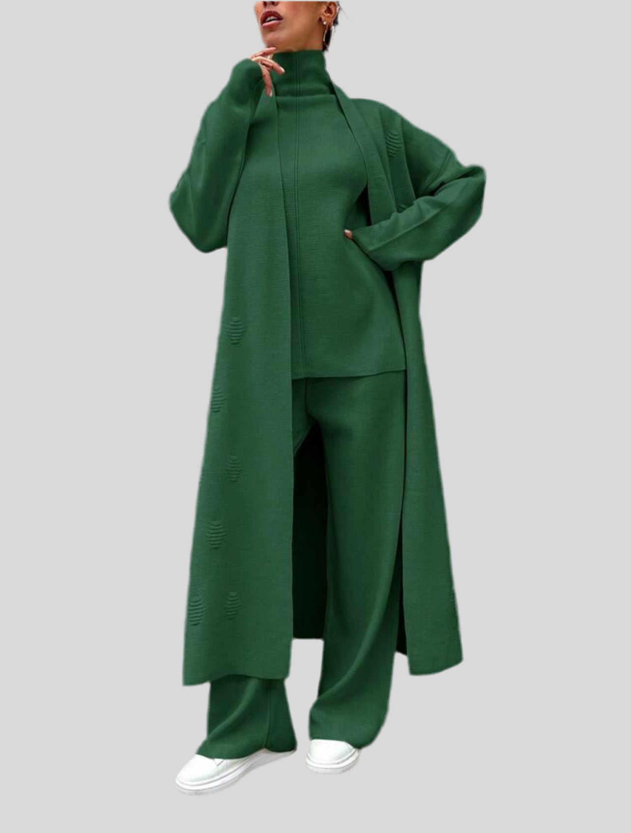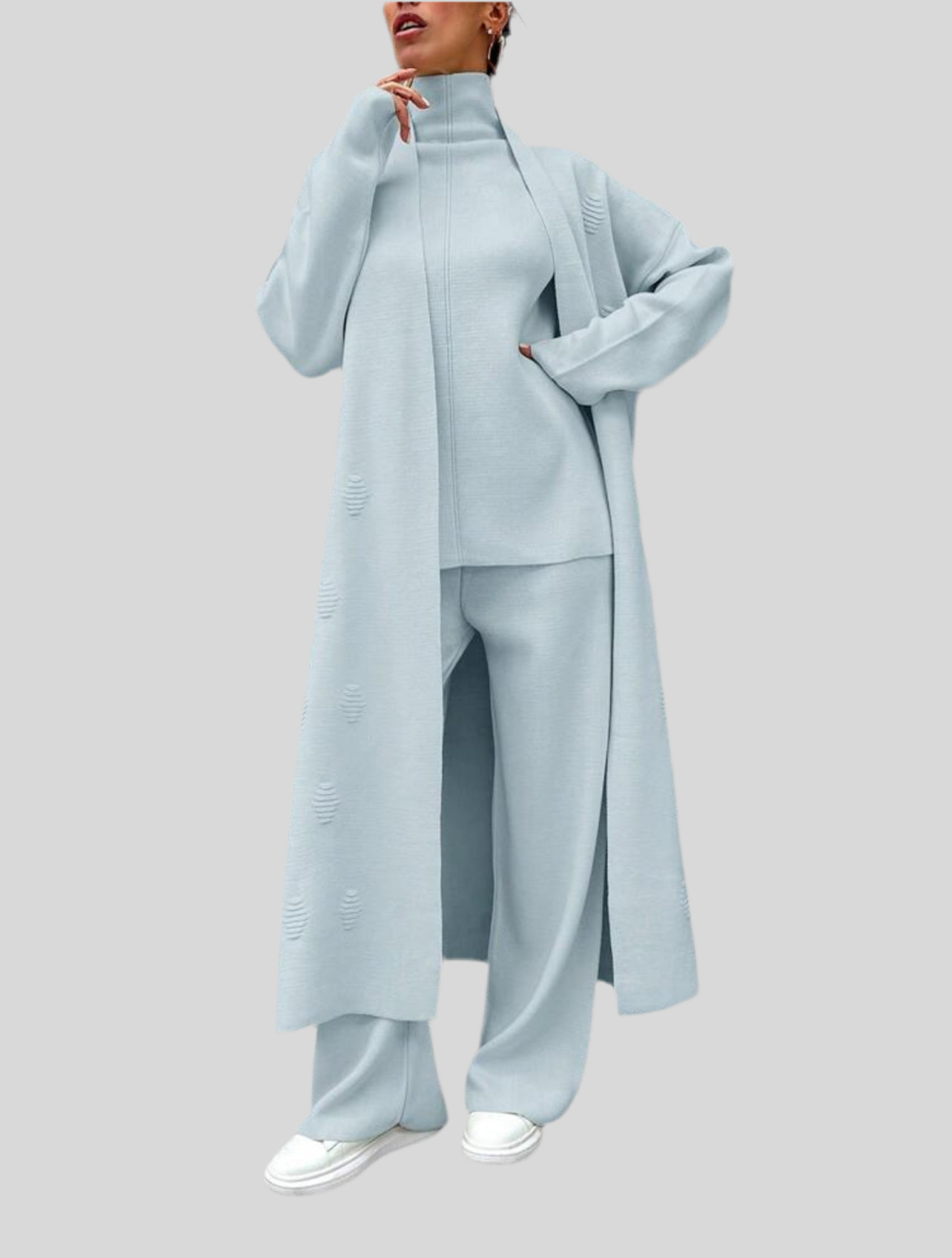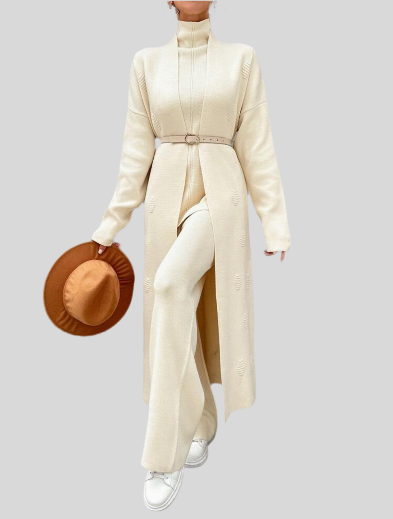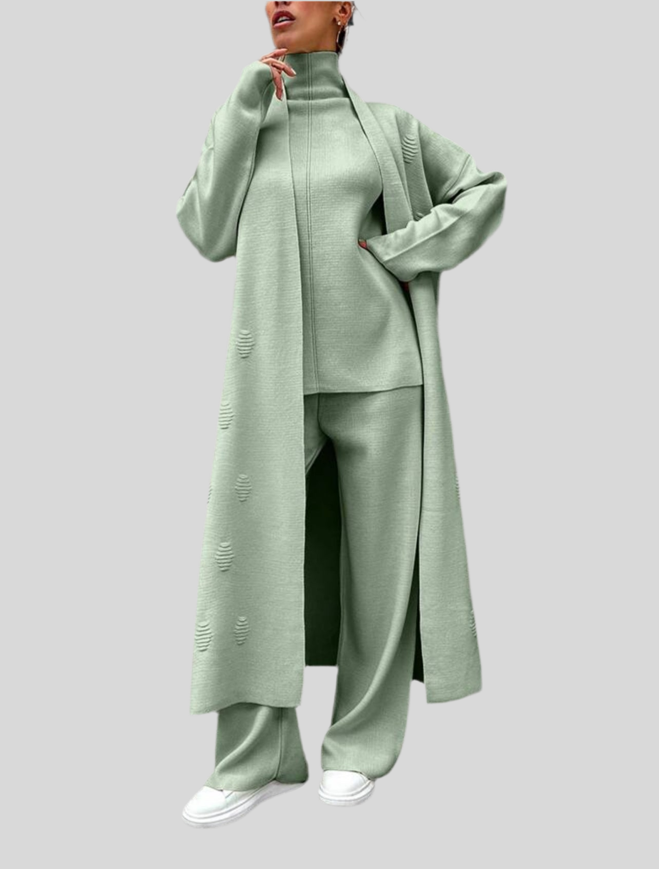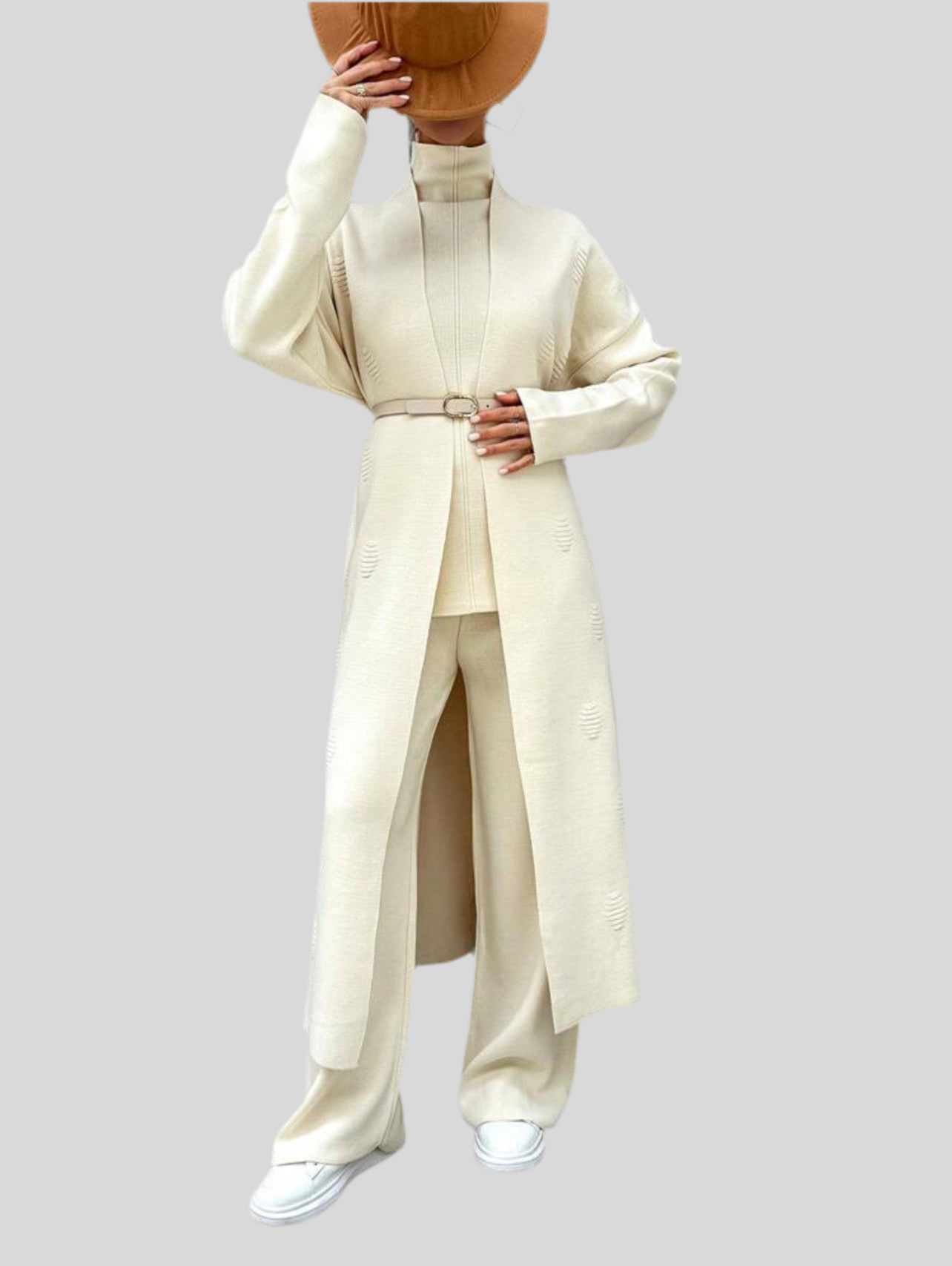 Este conjunto de punto de tres piezas disponible en 9 colores es perfecto para cualquier ocasión. El top de cuello alto y sin mangas junto con el cárdigan largo con detalles de dibujos en el mismo punto y el pantalón anchos y rectos con goma en la cintura aseguran la comodidad. Un tres piezas combinable por separado para la cuidad, y para cualquier evento con los accesorios adecuados. Talla única válida desde M a XL. La modelo mide 1,54 cm