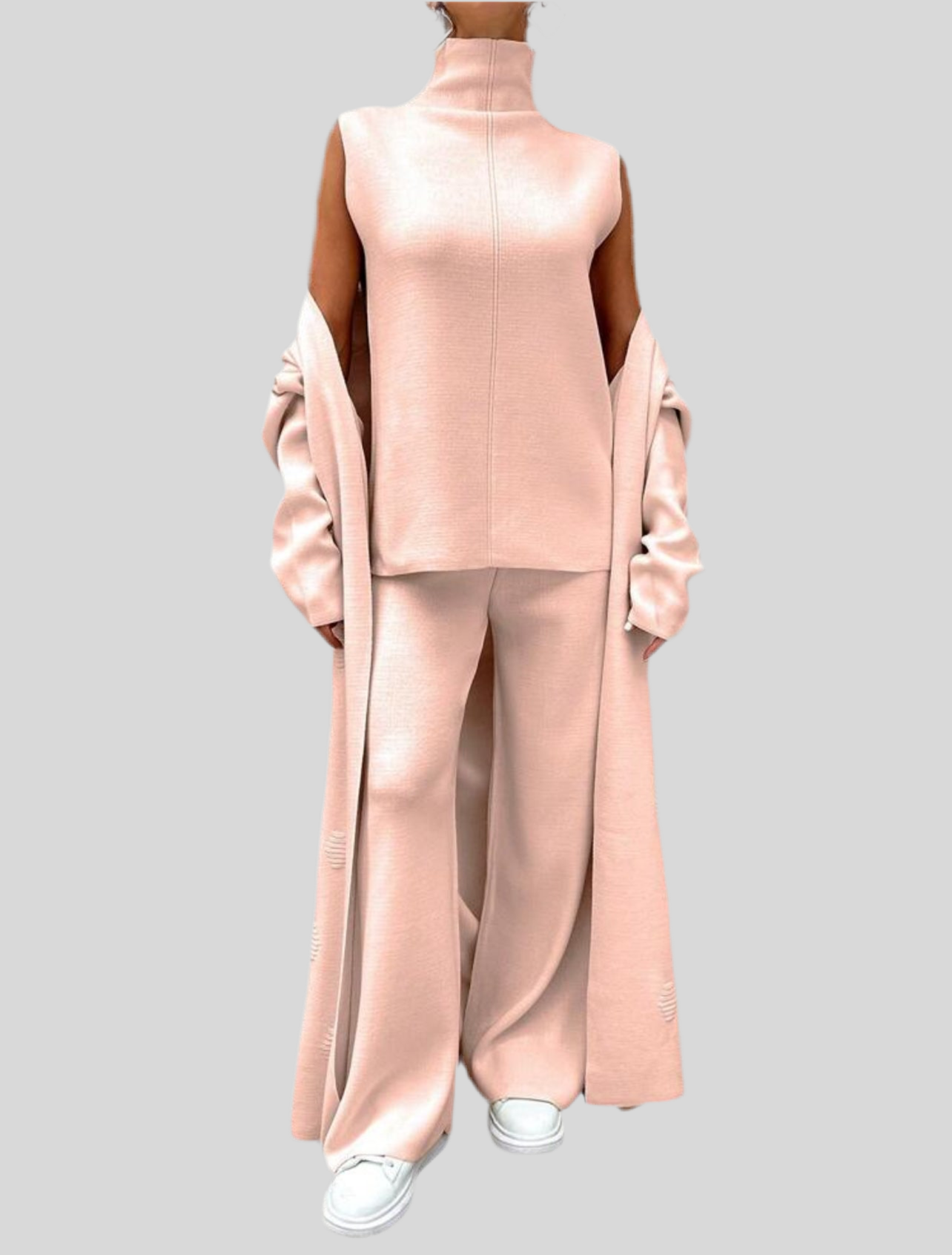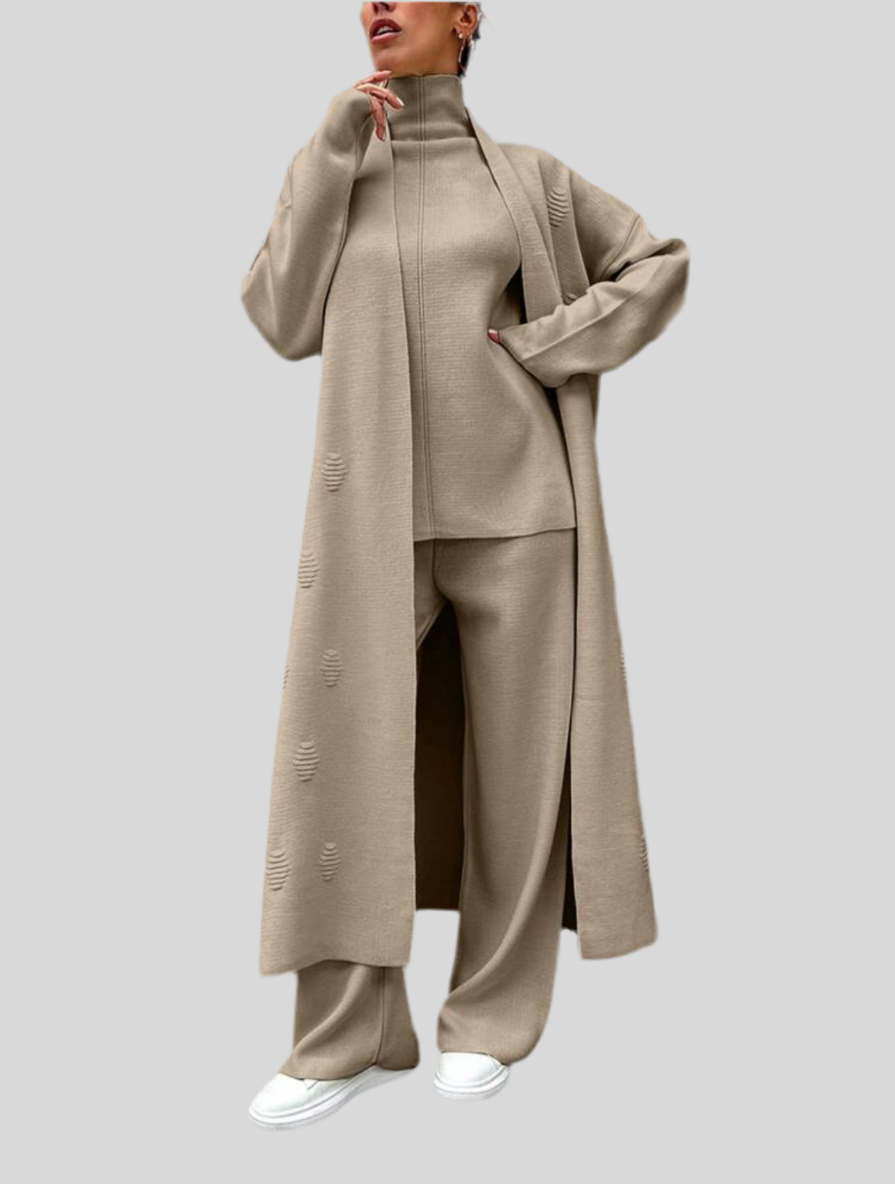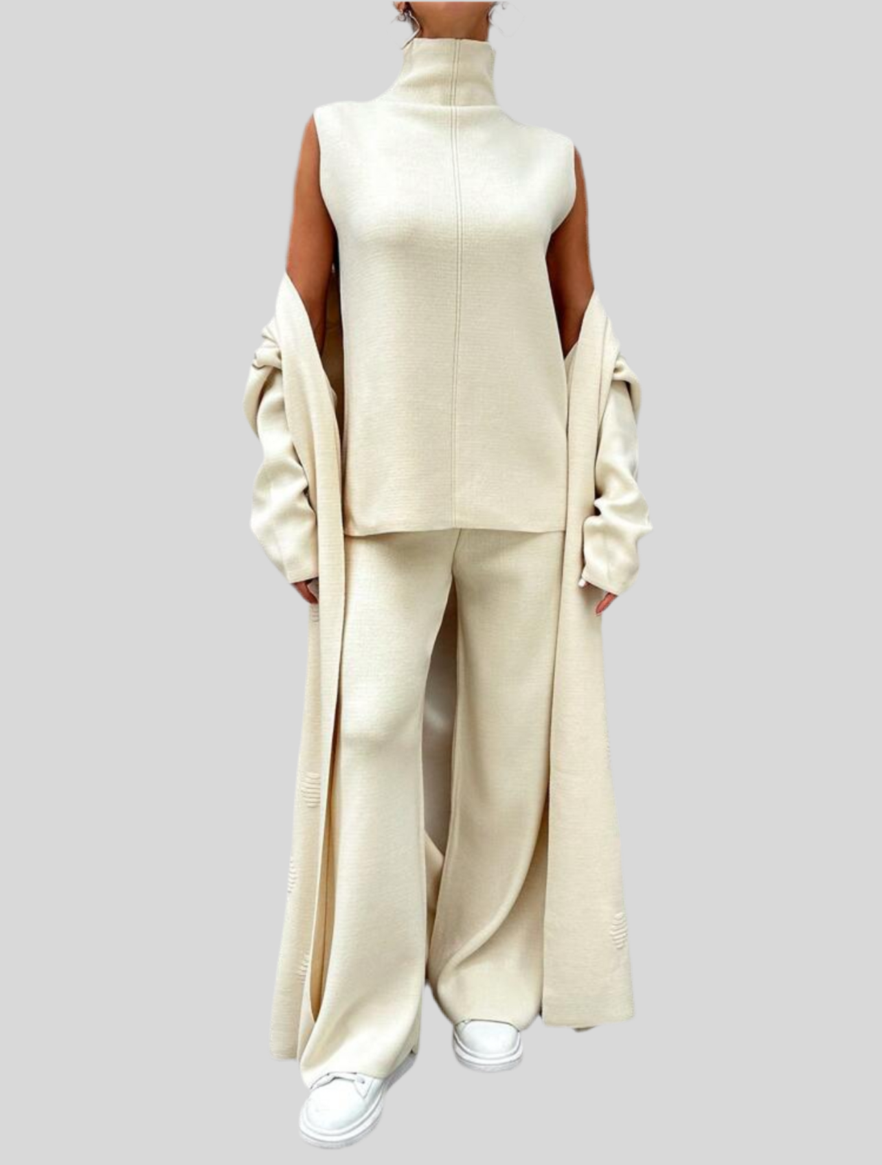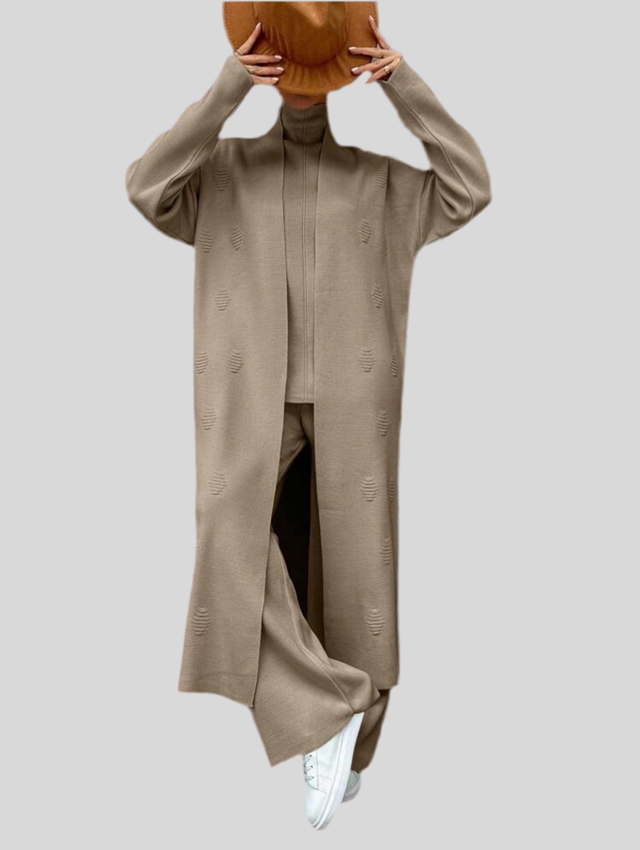 Este conjunto de punto de tres piezas disponible en 9 colores es perfecto para cualquier ocasión. El top de cuello alto y sin mangas junto con el cárdigan largo con detalles de dibujos en el mismo punto y el pantalón anchos y rectos con goma en la cintura aseguran la comodidad. Un tres piezas combinable por separado para la cuidad, y para cualquier evento con los accesorios adecuados. Talla única válida desde M a XL. La modelo mide 1,54 cm