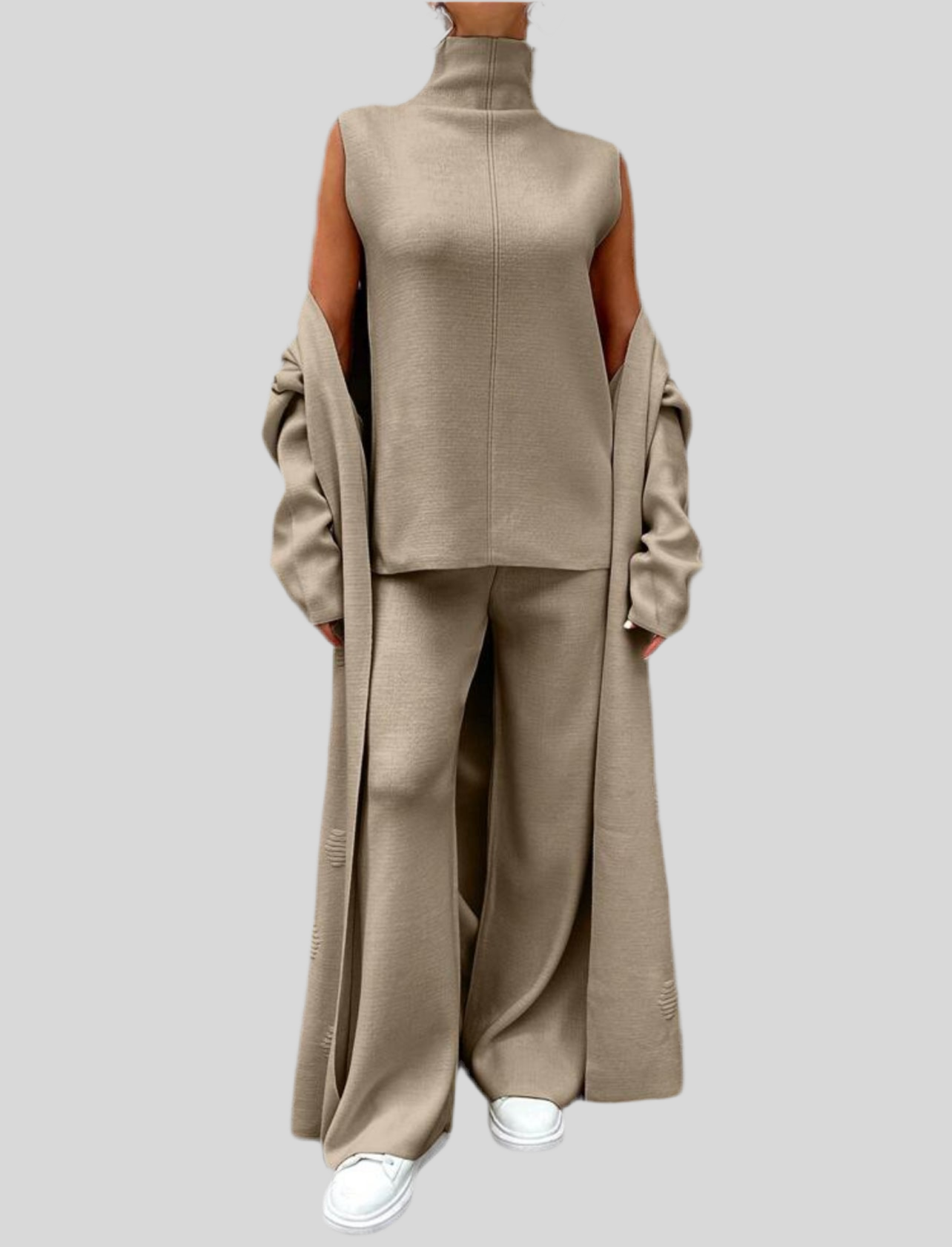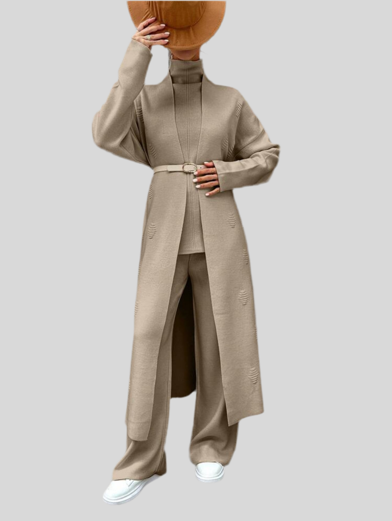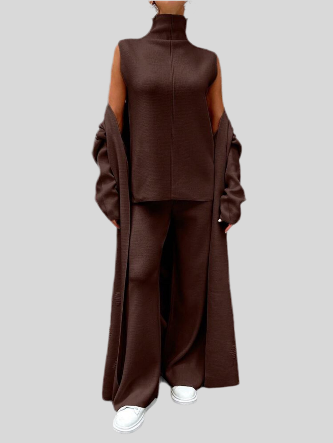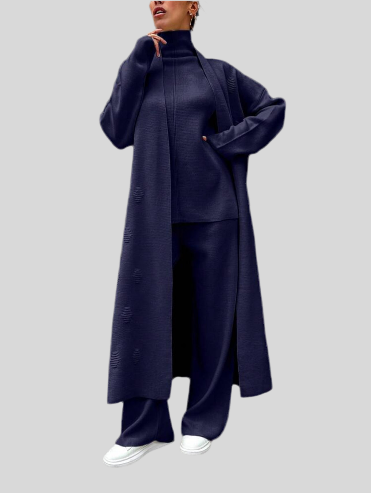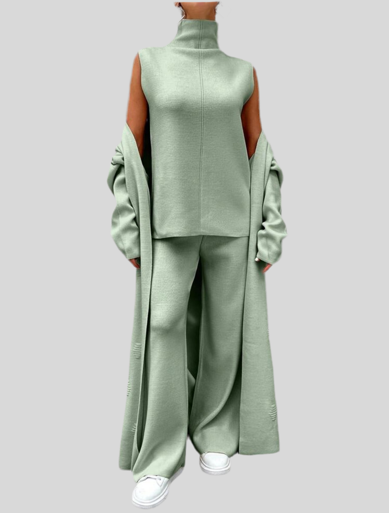 Este conjunto de punto de tres piezas disponible en 9 colores es perfecto para cualquier ocasión. El top de cuello alto y sin mangas junto con el cárdigan largo con detalles de dibujos en el mismo punto y el pantalón anchos y rectos con goma en la cintura aseguran la comodidad. Un tres piezas combinable por separado para la cuidad, y para cualquier evento con los accesorios adecuados. Talla única válida desde M a XL. La modelo mide 1,54 cm