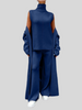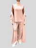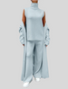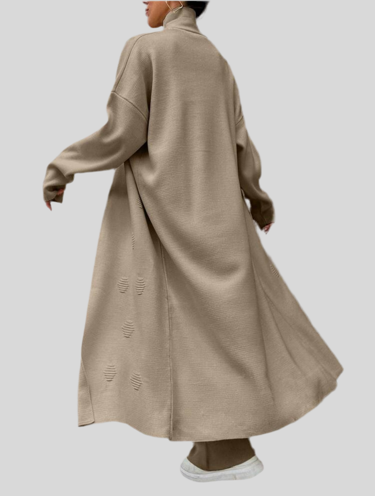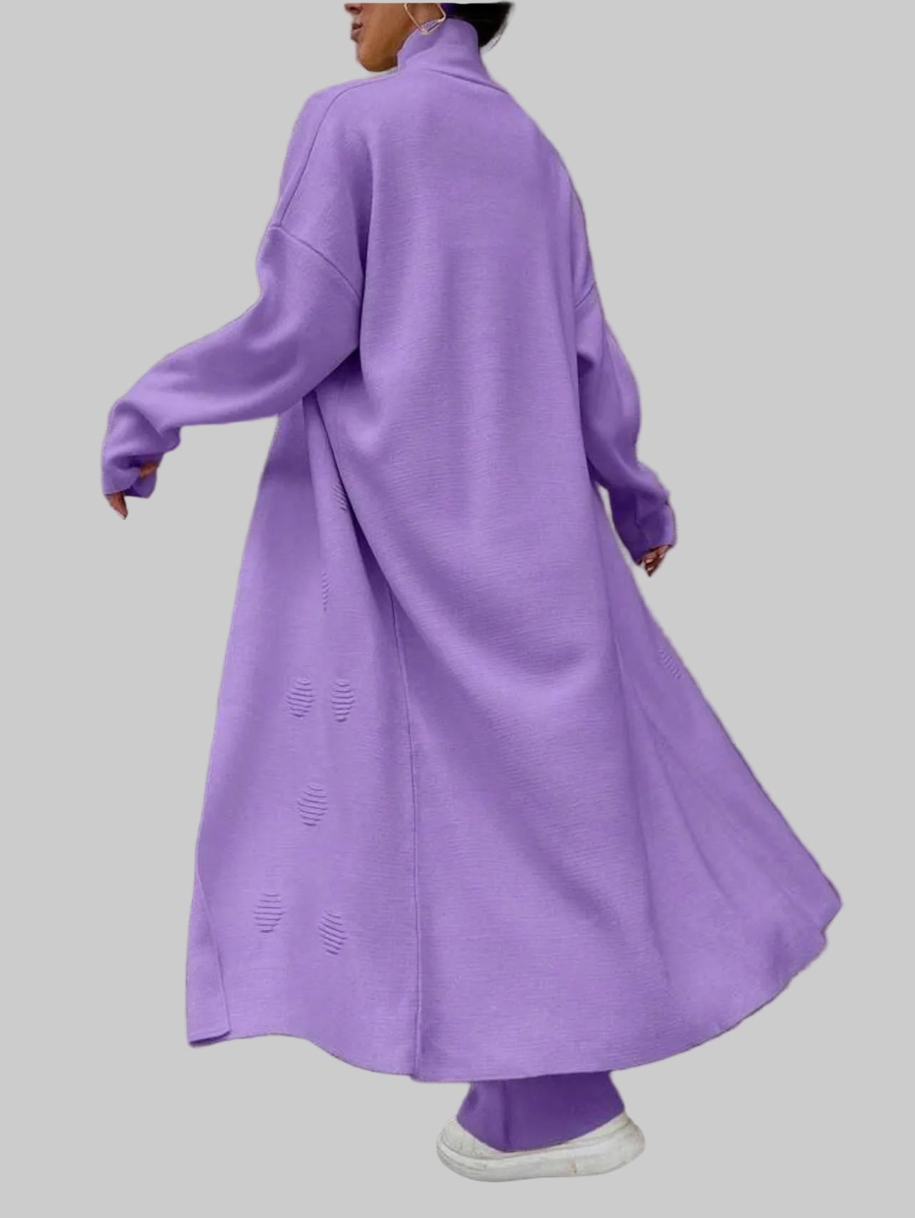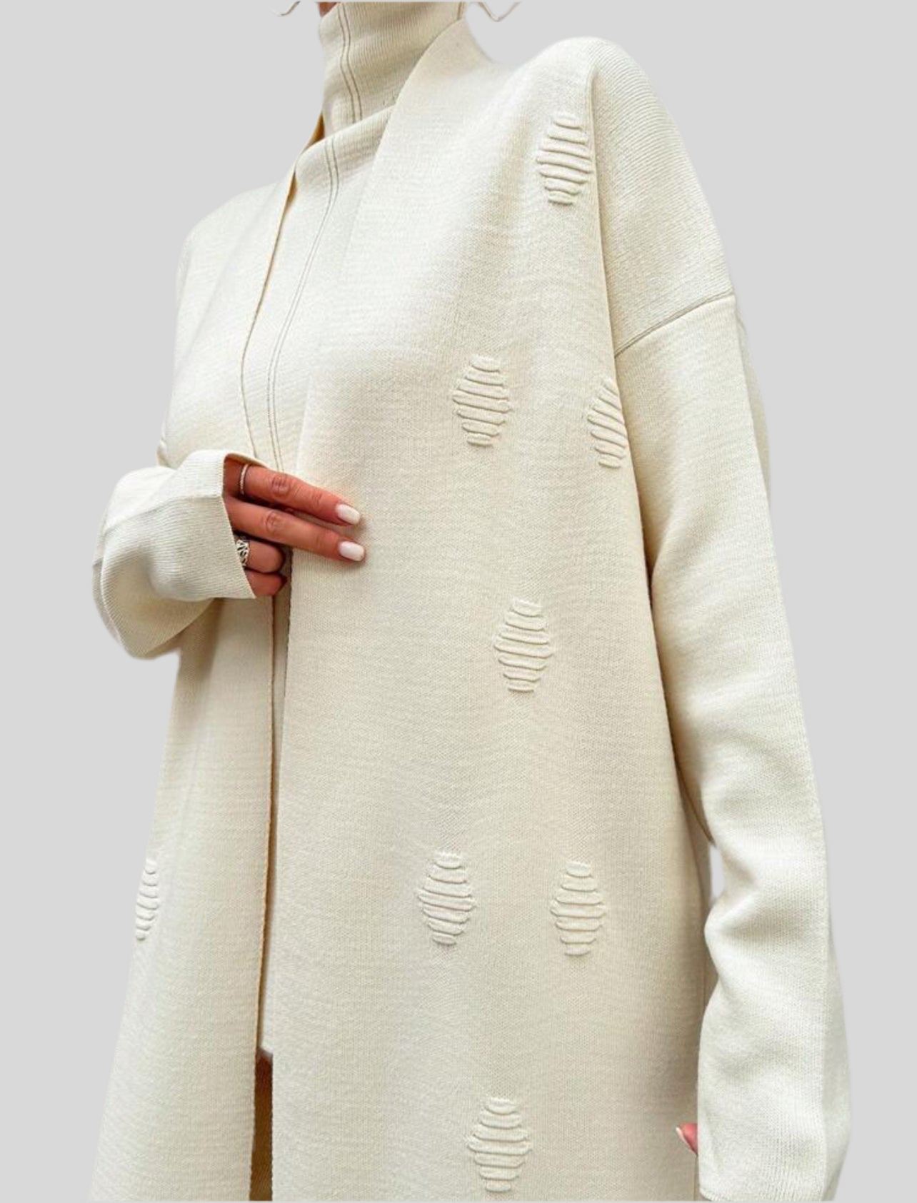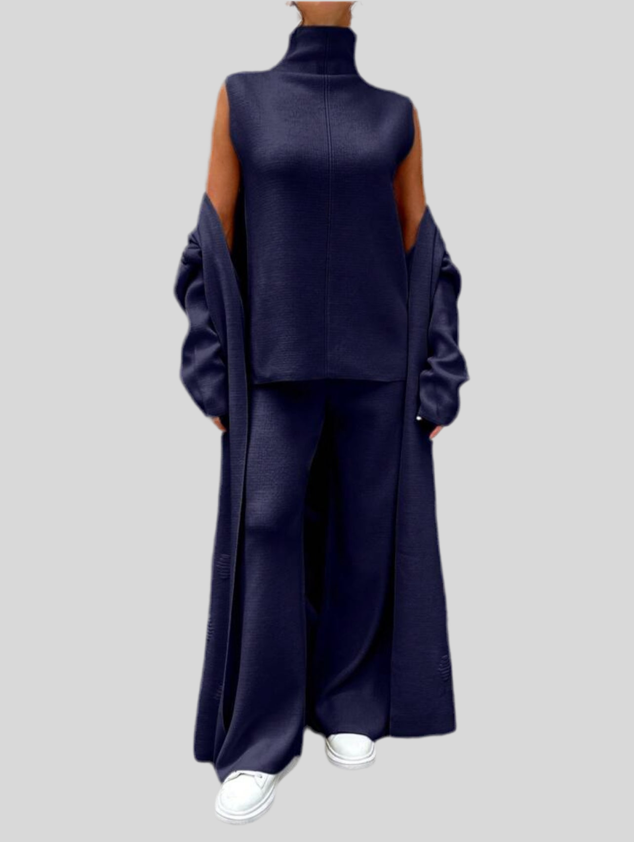 Este conjunto de punto de tres piezas disponible en 9 colores es perfecto para cualquier ocasión. El top de cuello alto y sin mangas junto con el cárdigan largo con detalles de dibujos en el mismo punto y el pantalón anchos y rectos con goma en la cintura aseguran la comodidad. Un tres piezas combinable por separado para la cuidad, y para cualquier evento con los accesorios adecuados. Talla única válida desde M a XL. La modelo mide 1,54 cm