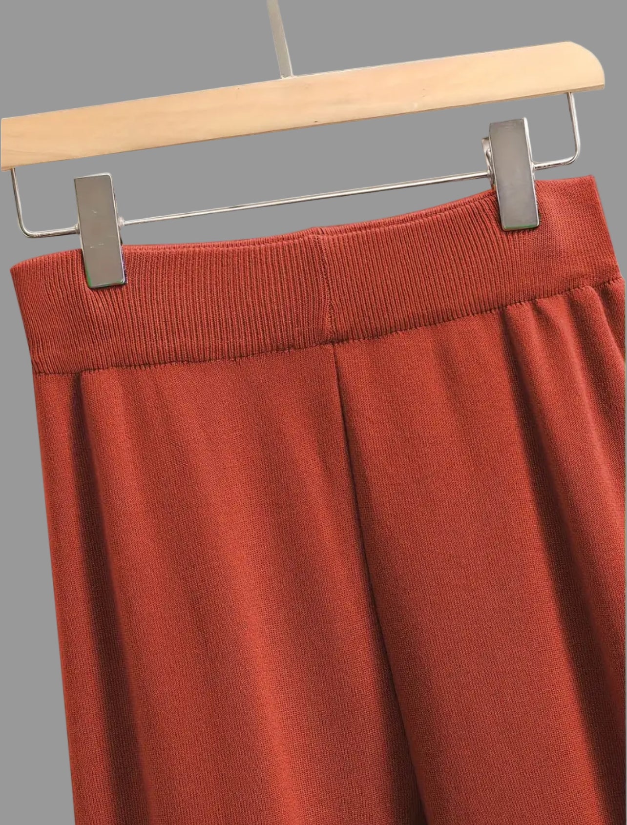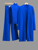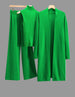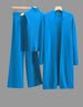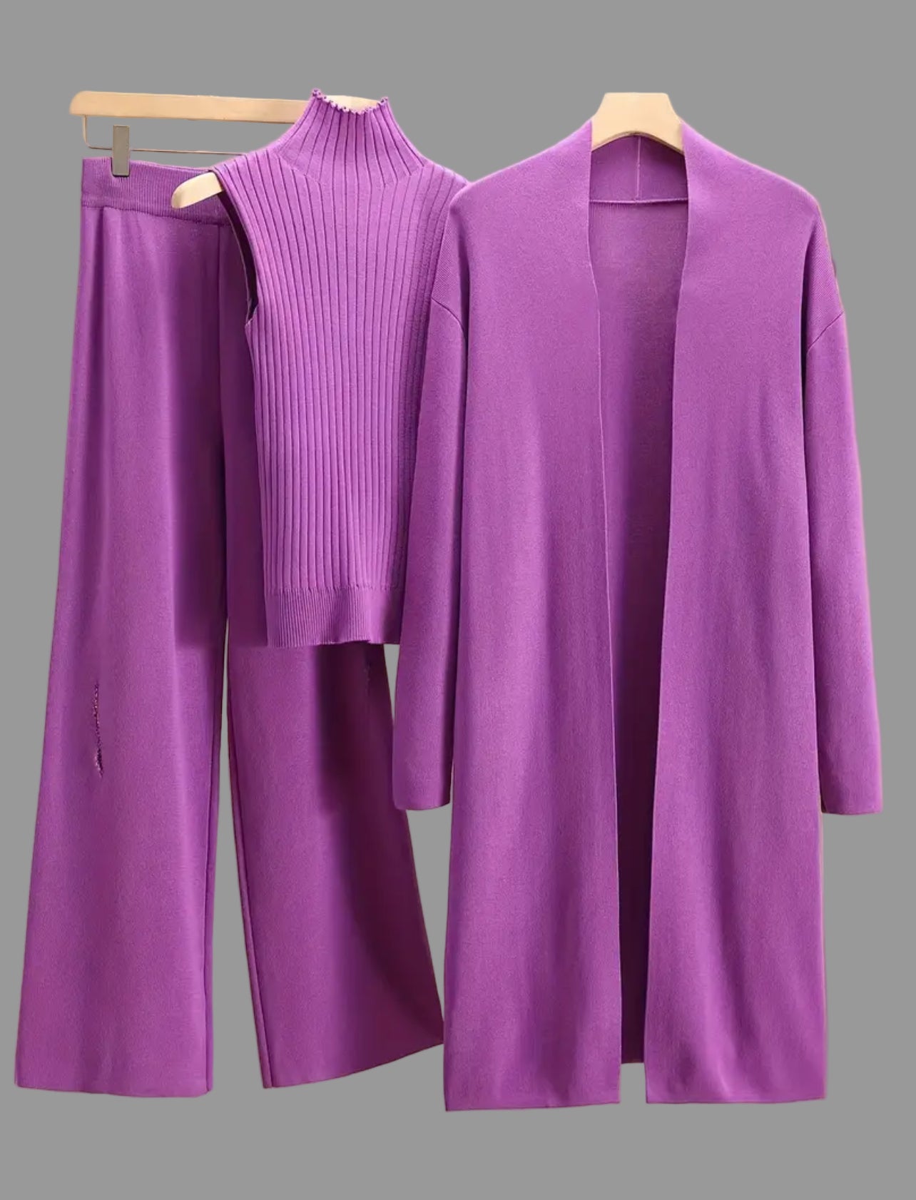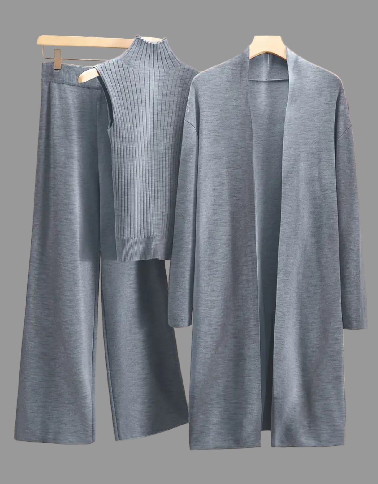 Este conjunto de tres piezas de punto presentado en una talla única equivalente a ML/, lo que lo hace perfecto para adaptarse a varias tallas. Cómodo, lavable y no necesita plancha. El pantalón amplio con cinturilla de goma garantiza comodidad y el top sin mangas y el cardigan largo, ofrecen estilo y versatilidad para llevar juntos o por separado.