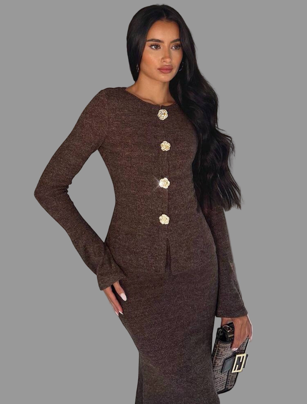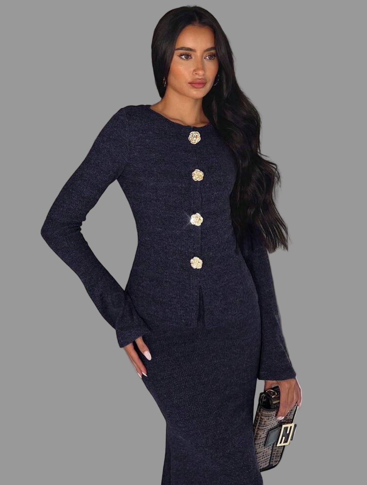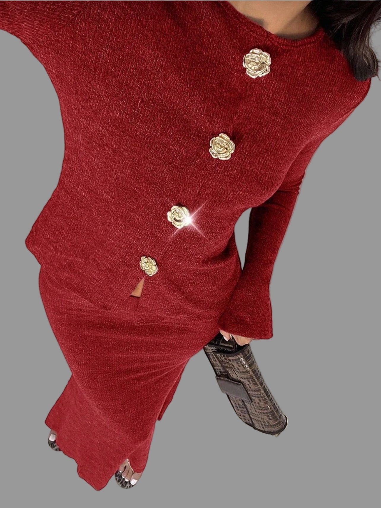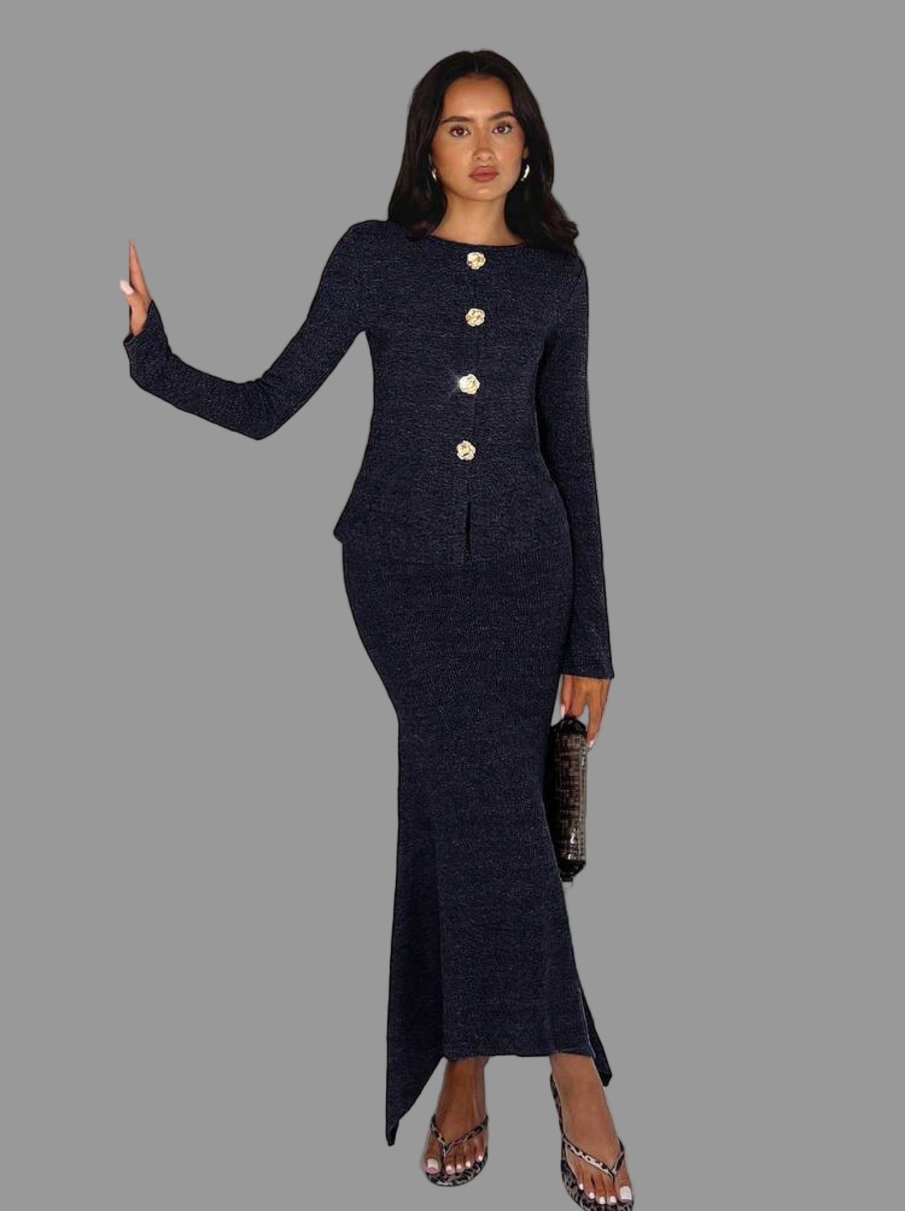 Este conjunto en punto de chaqueta larga y falda sirena, con botones flor y ajuste elástico, ofrece comodidad y estilo en cuatro colores. Perfecto para outfit cuidado, para acudir a cenas o salidas porque es sexy, se puede combinar de manera versátil por separado, mejor con zapato o botín.Haz una declaración elegante con este conjunto!
