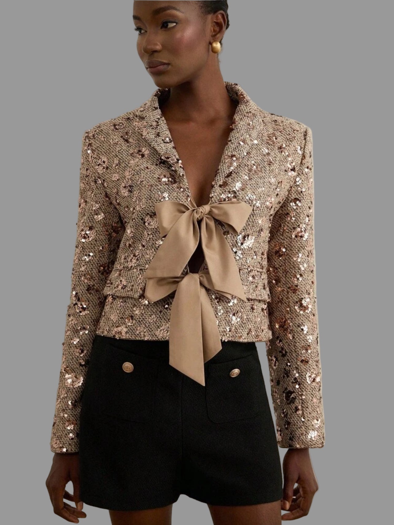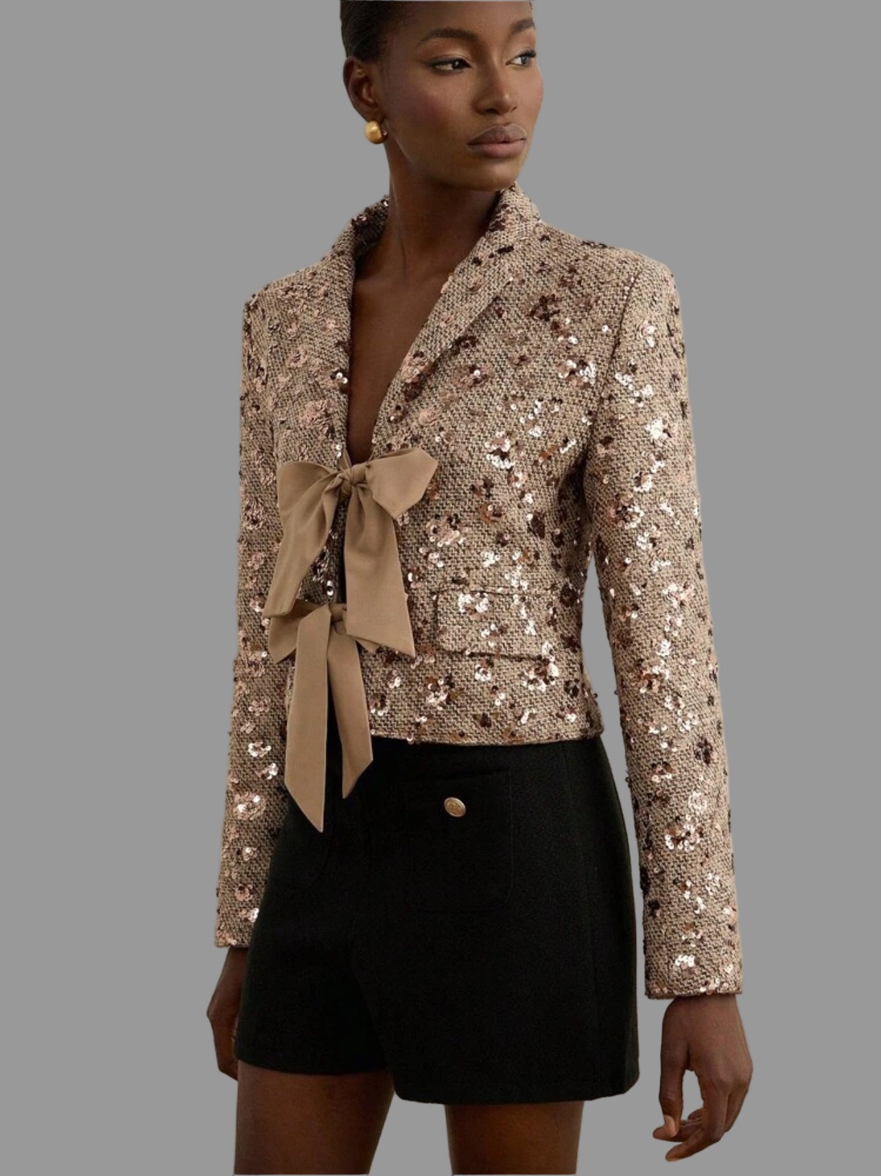 Esta chaqueta corta de tweed y lentejuelas es perfecta para cualquier evento. Con un cierre de dos lazos, su estilo femenino es ideal para estar elegante y sofisticada. ¡Hazte con ella y deslumbra con su maravilloso diseño! No lo dudes, combina con falda o pantalón en tono negro o marino.