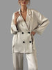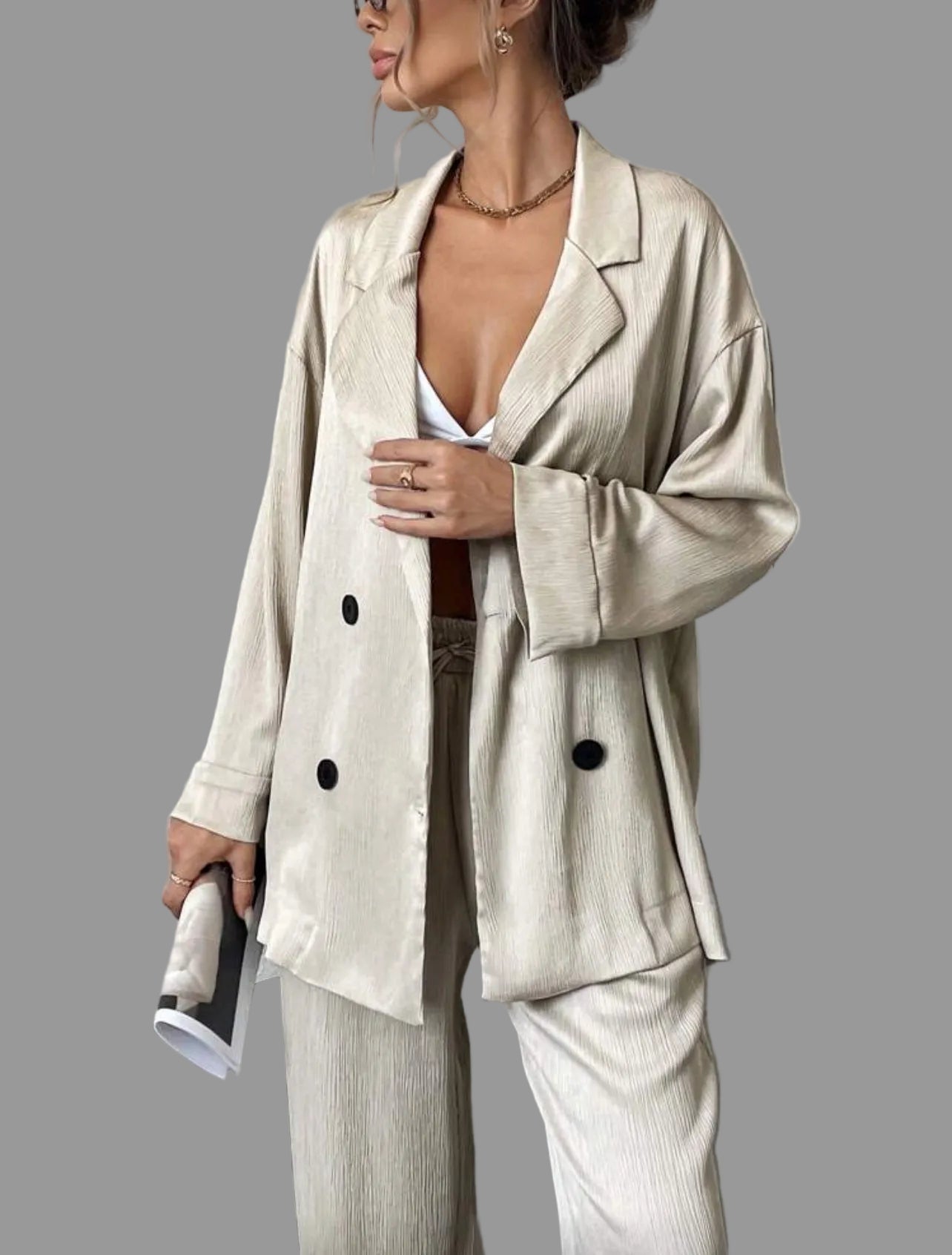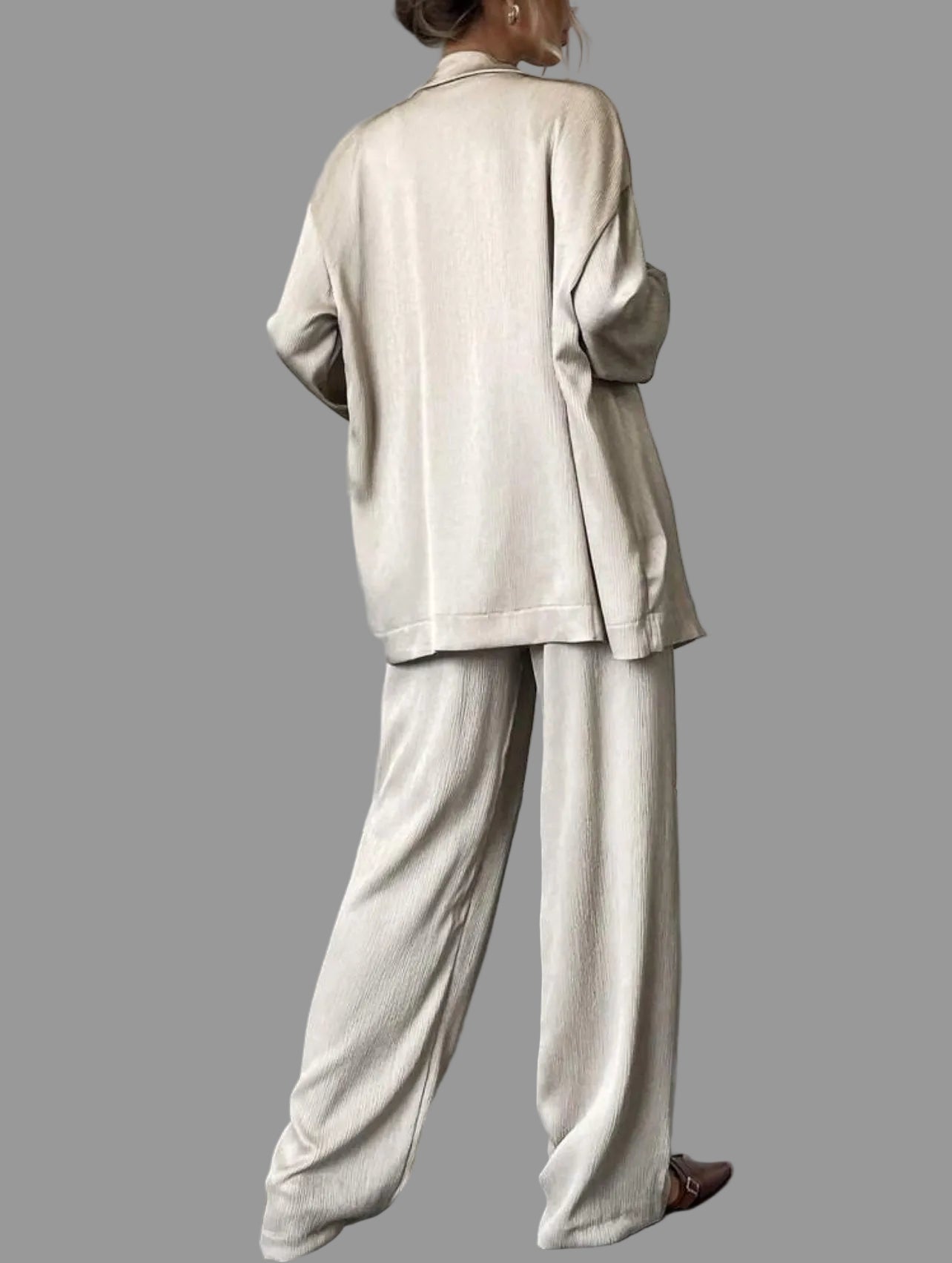 Este traje de chaqueta flojo combina un diseño de chaqueta desestructurada con pantalones de cinturilla elástica, ofreciendo una estética elegante y cómoda para el uso diario. Su patrón permite una mayor libertad de movimiento, ideal para transiciones entre entornos profesionales y casuales.