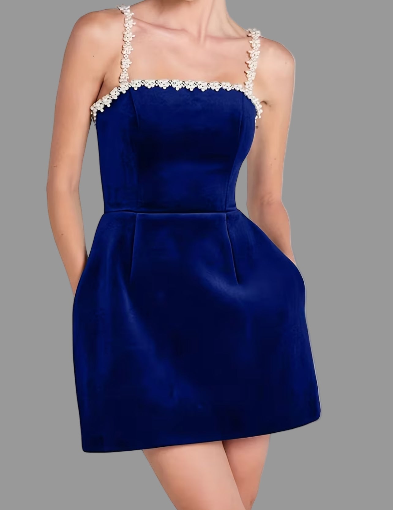 "Este vestido de terciopelo tipo Audrey es perfecto para resaltar tu figura, se recomienda para estructuras delgadas o menudas. También para jovencitas. Sus tirantes de brillantes y perlas le dan un toque superglamouroso y elegante. Disponible en 3 colores para añadir  a tu estilo."