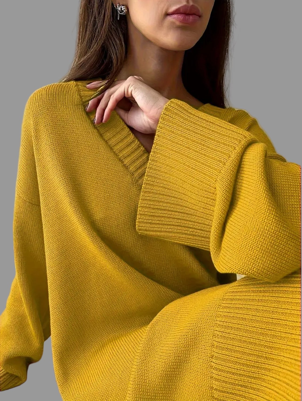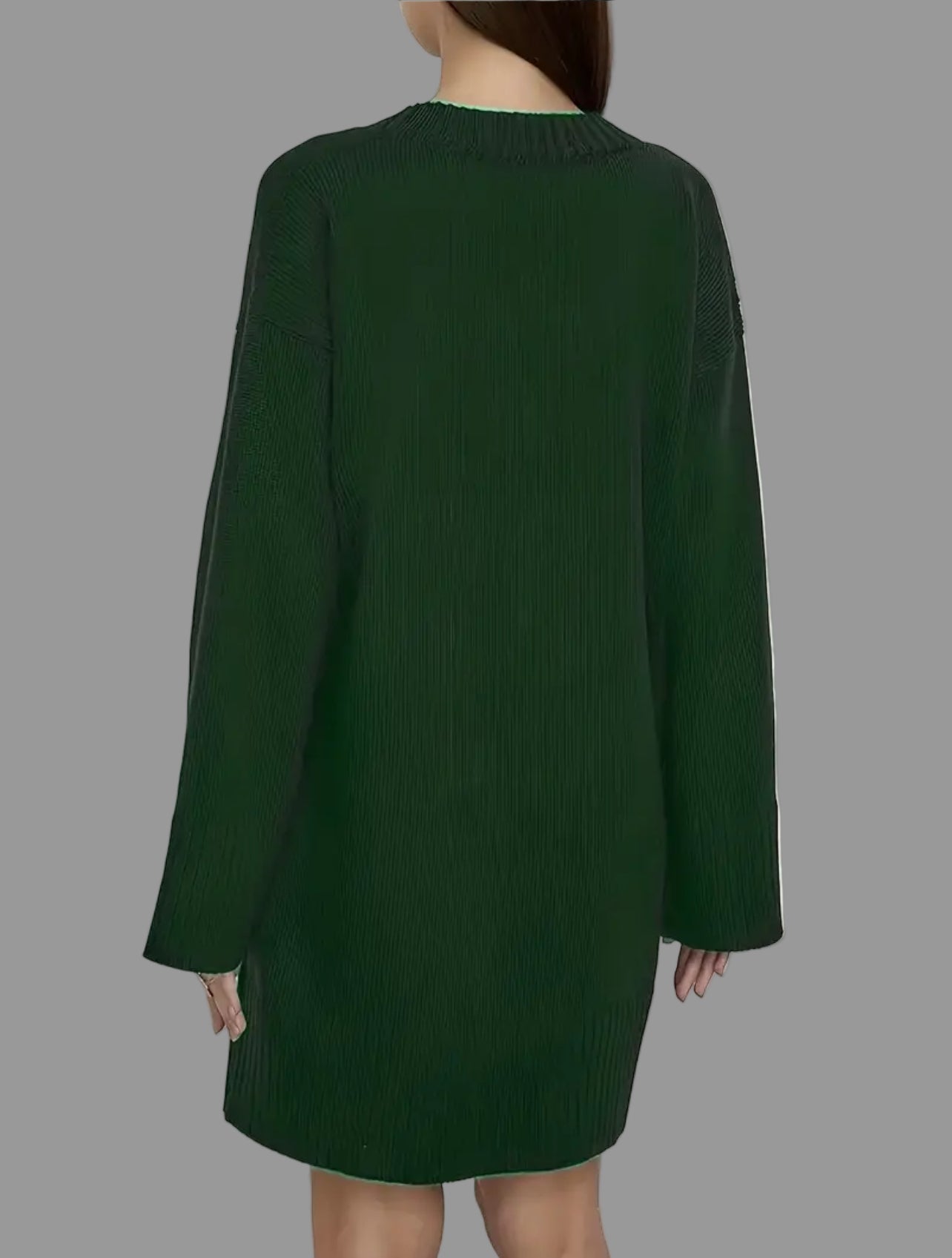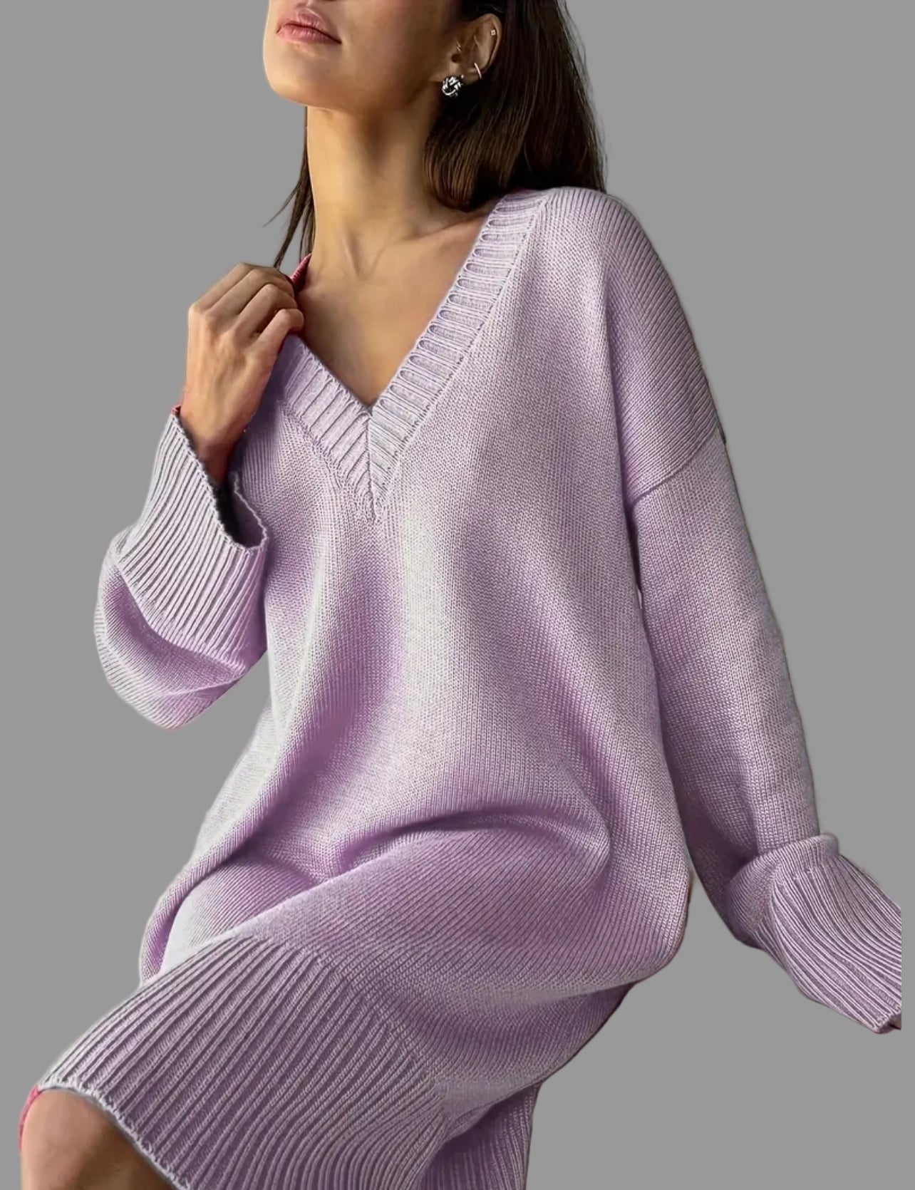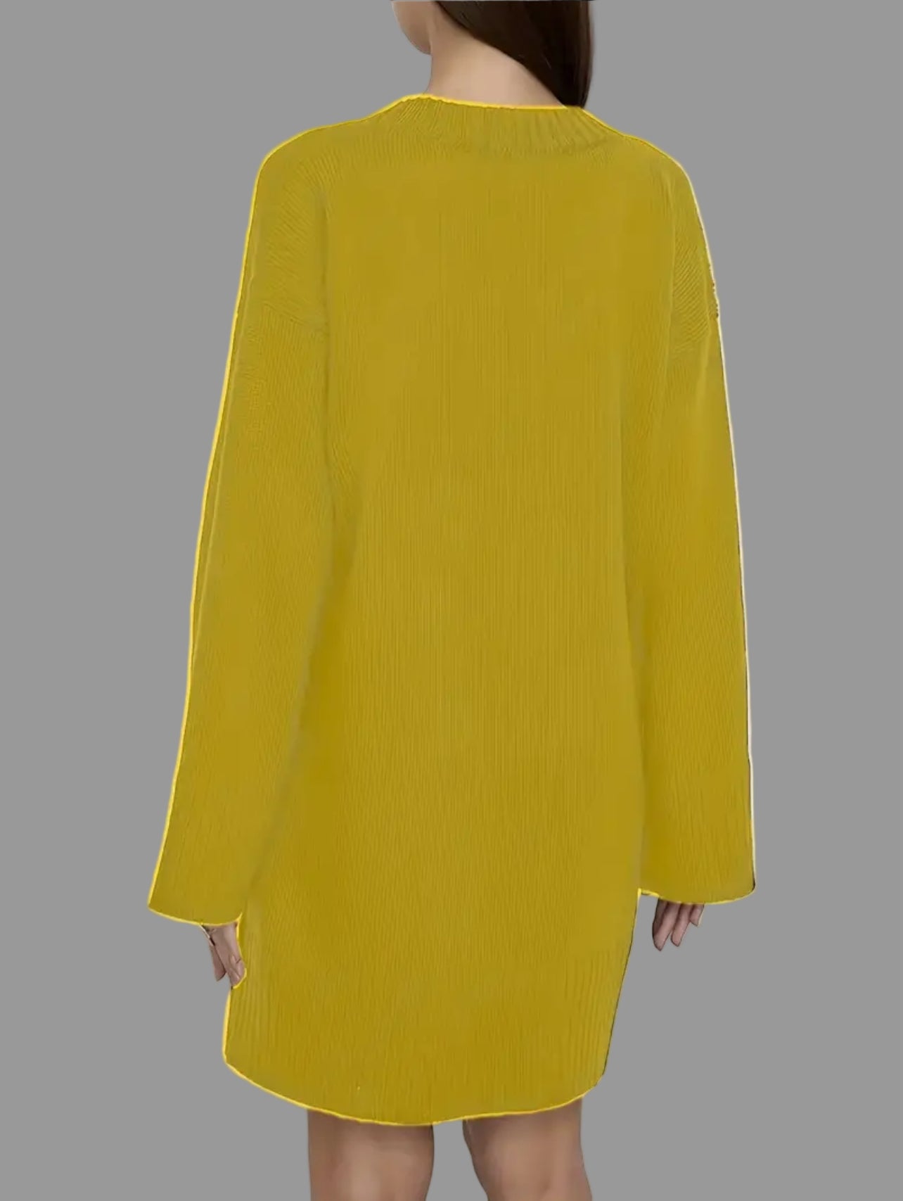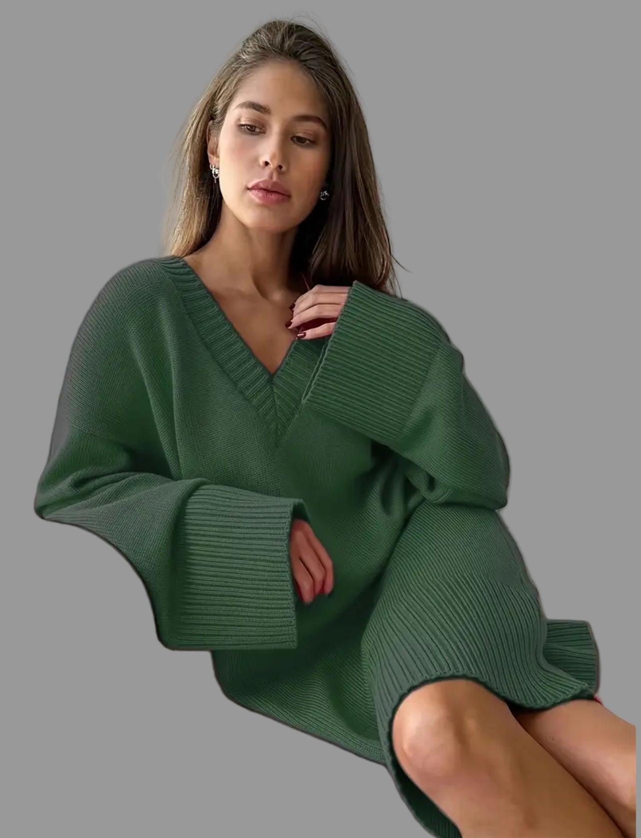 La comodidad y el estilo se combinan en nuestro vestido jersey de punto oversize con cuello pico. Puedes usarlo como un suéter con pantalones o como un vestido con medias gruesas para una apariencia versátil. Disponible en cinco tonos. ¡No pierdas la oportunidad de tener un look cómodo y moderno!