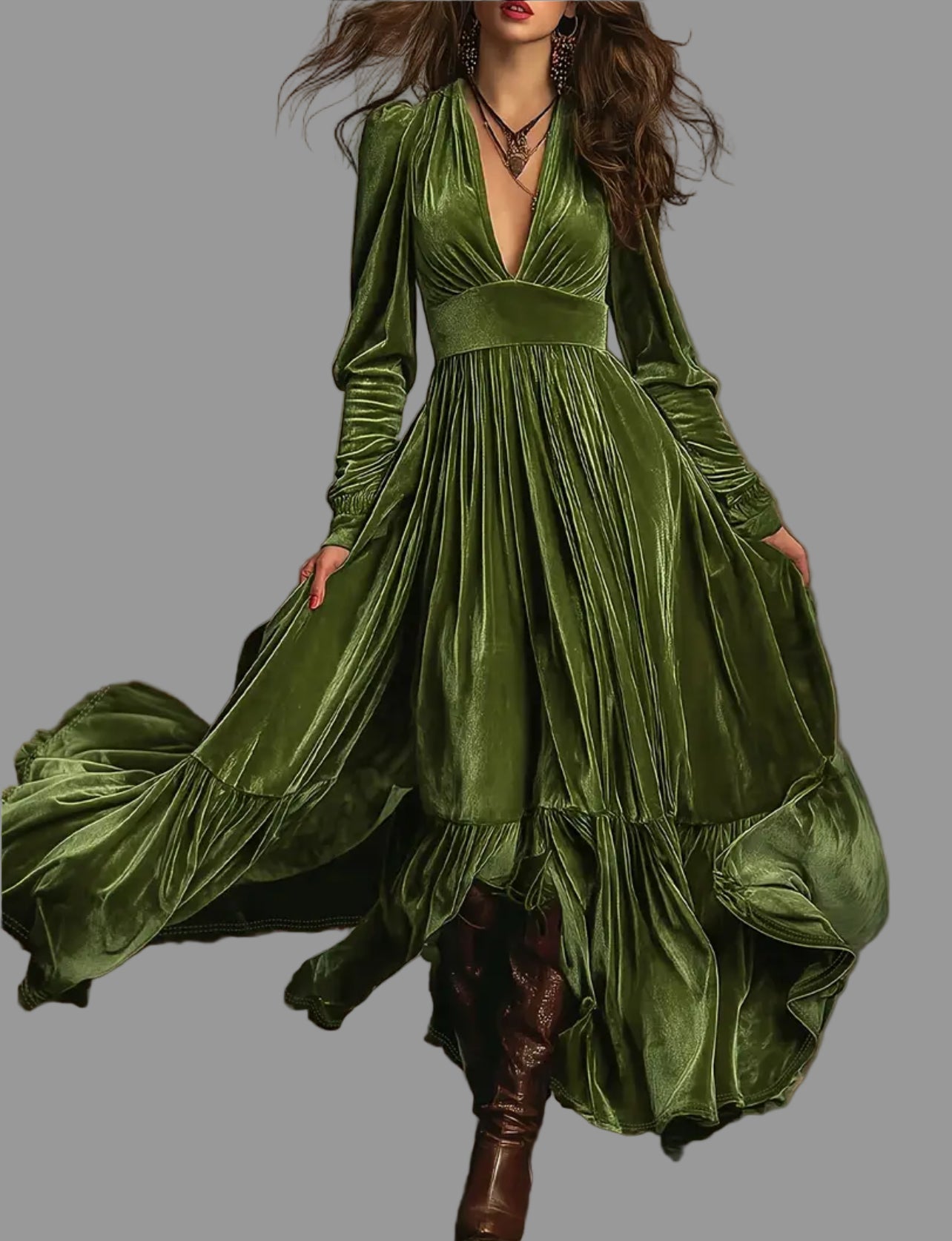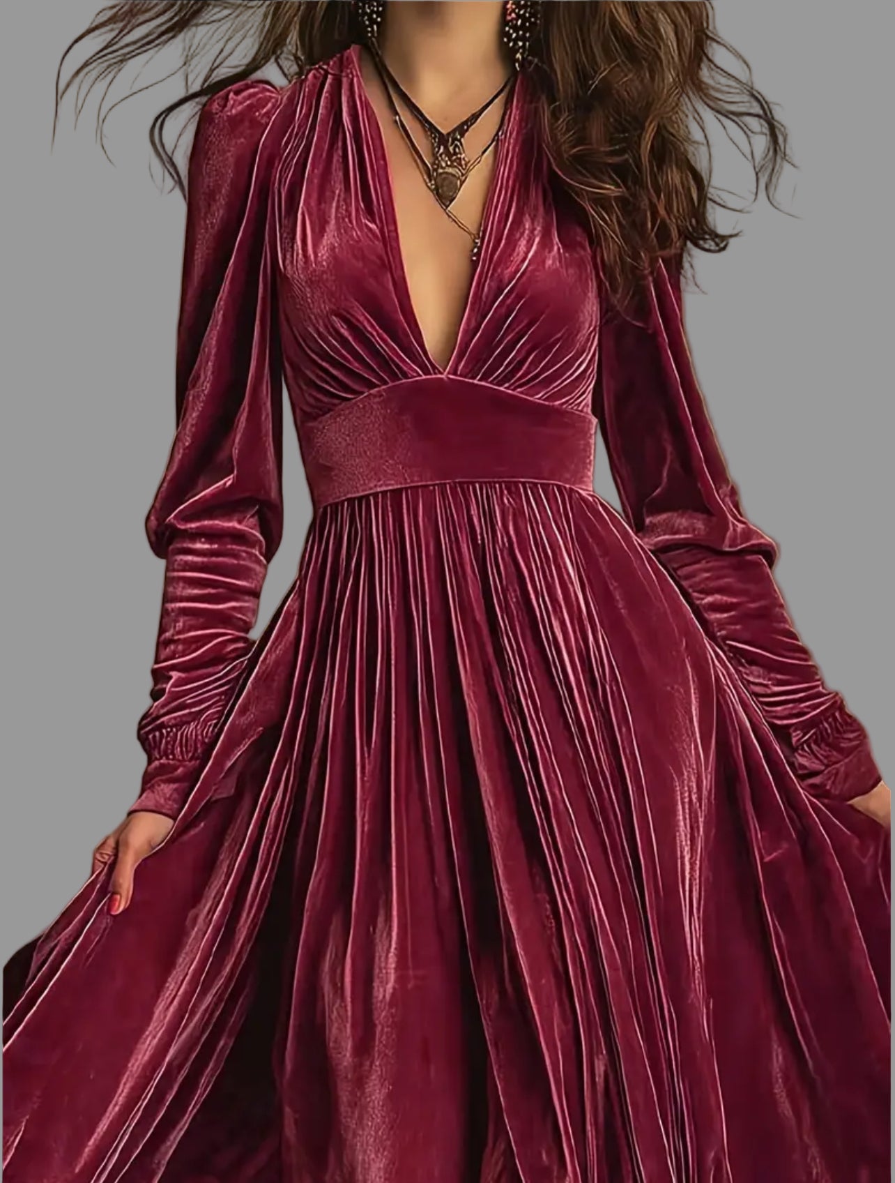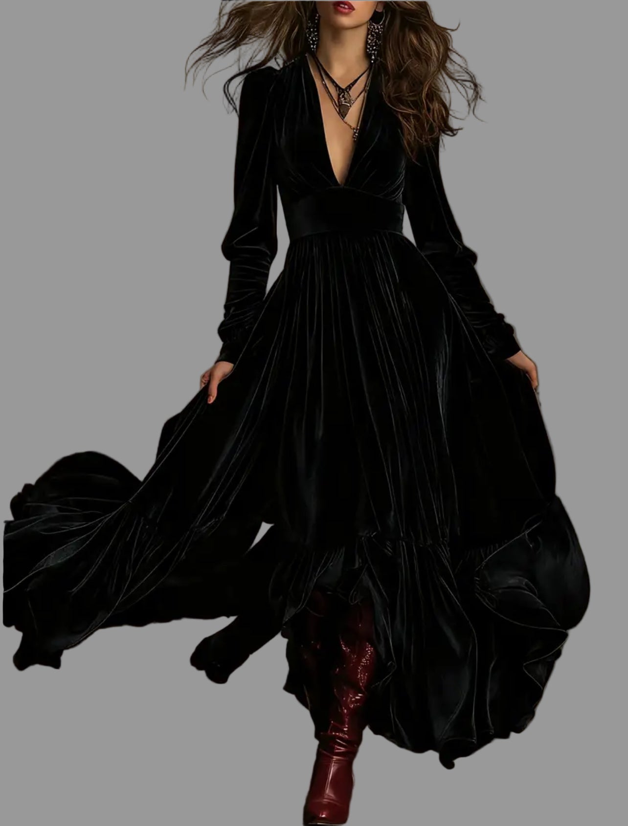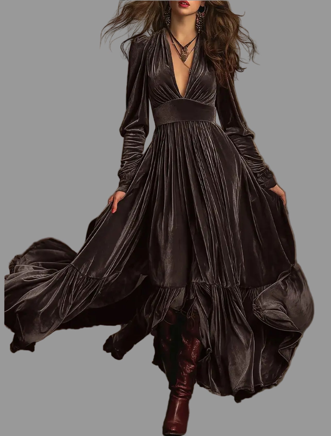 This Este vestido representa la elegancia y la comodidad. Es largo, de terciopelo con un escote profundo y una cintura ajustada, para realzar tu figura y darte libertad de movimiento. Con falda de paneles, es una fusión perfecta de estilo y sencillez. ¡Llévalo con confianza, para una apariencia femenina y sofisticada! Se un diez. Disponible en 6 maravillosos colores.