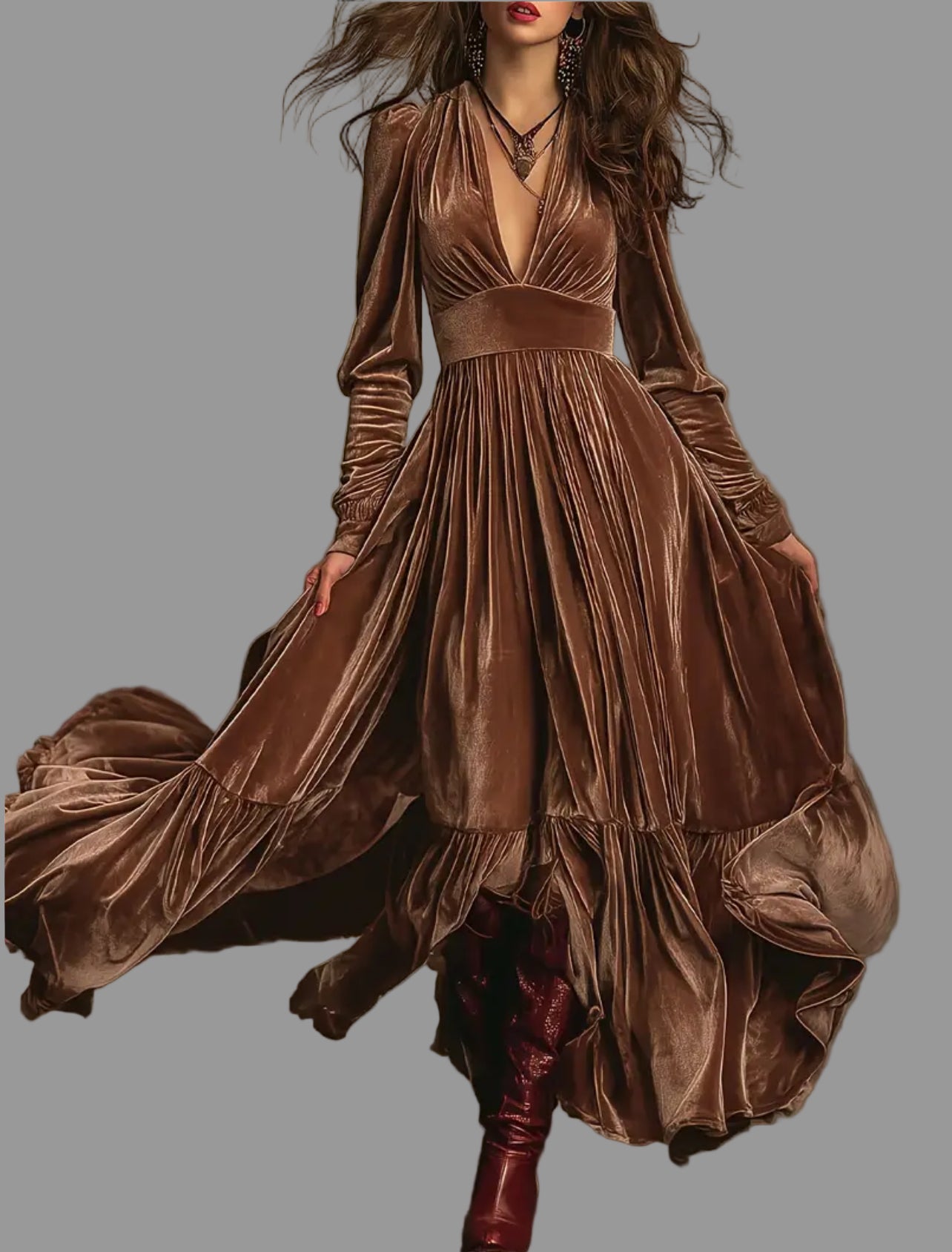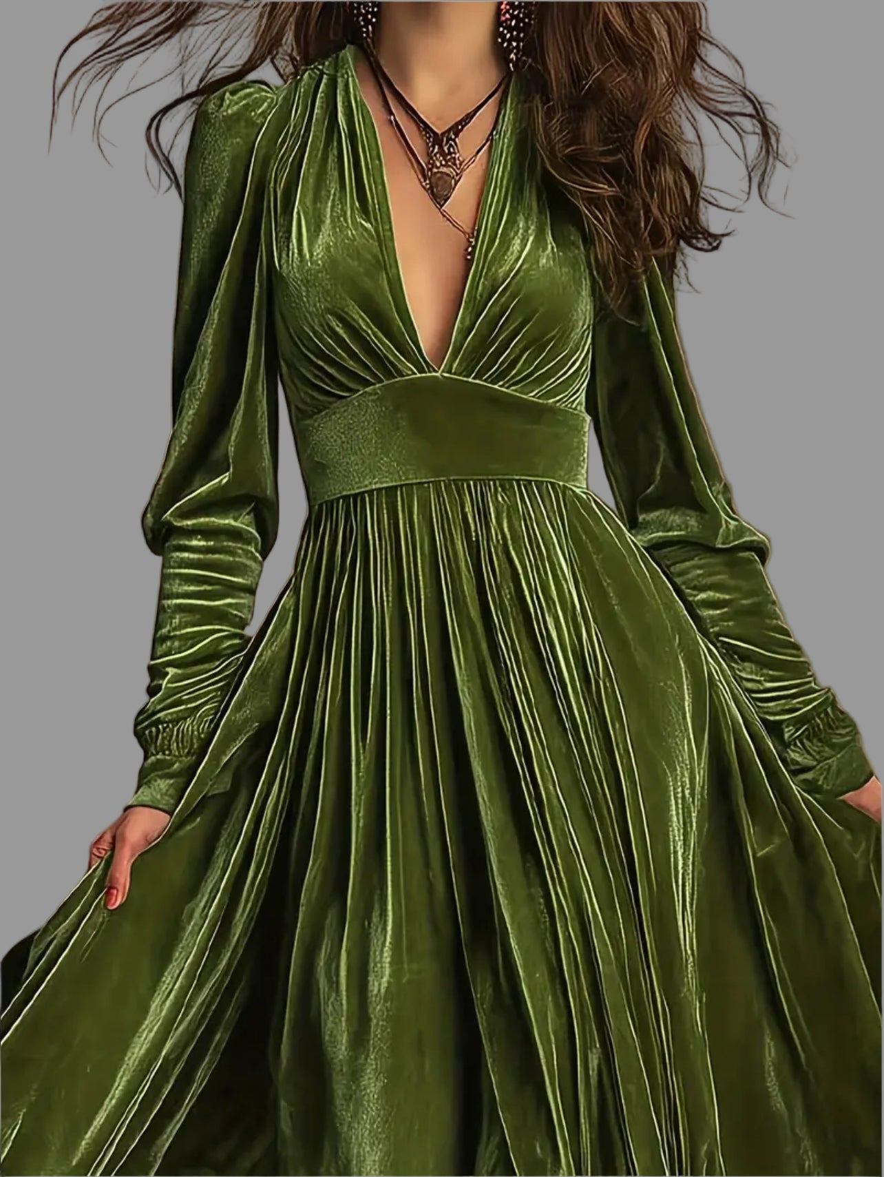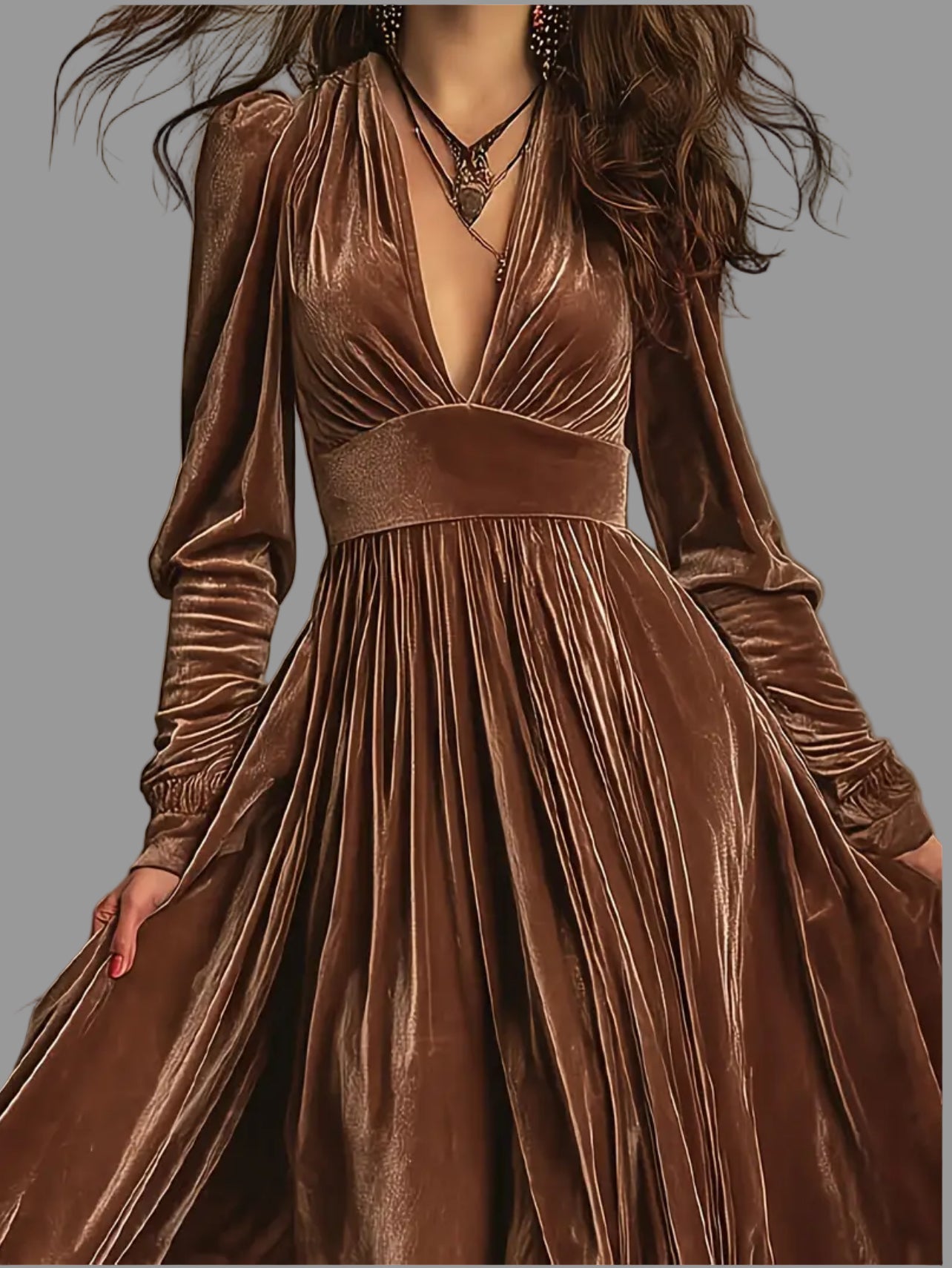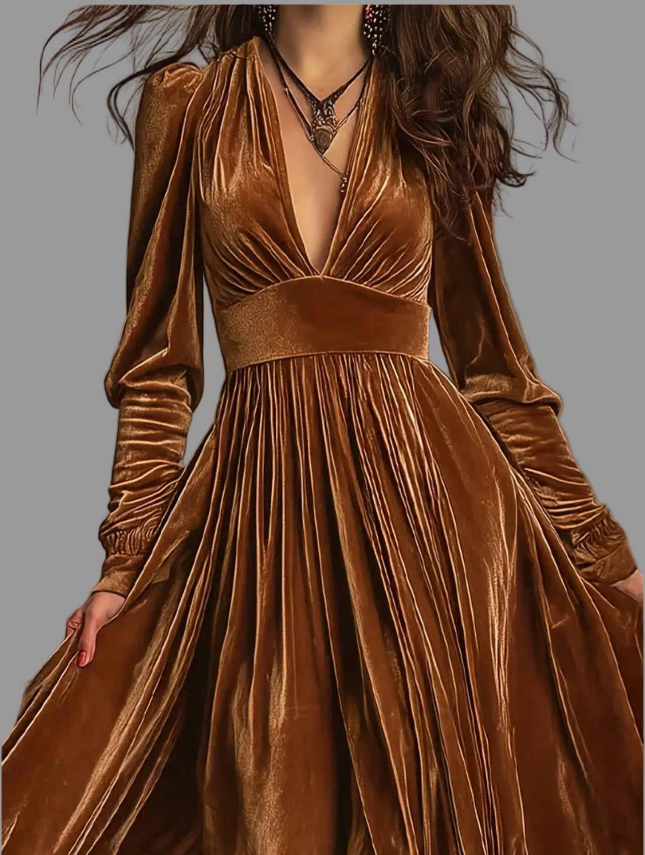 This Este vestido representa la elegancia y la comodidad. Es largo, de terciopelo con un escote profundo y una cintura ajustada, para realzar tu figura y darte libertad de movimiento. Con falda de paneles, es una fusión perfecta de estilo y sencillez. ¡Llévalo con confianza, para una apariencia femenina y sofisticada! Se un diez. Disponible en 6 maravillosos colores.