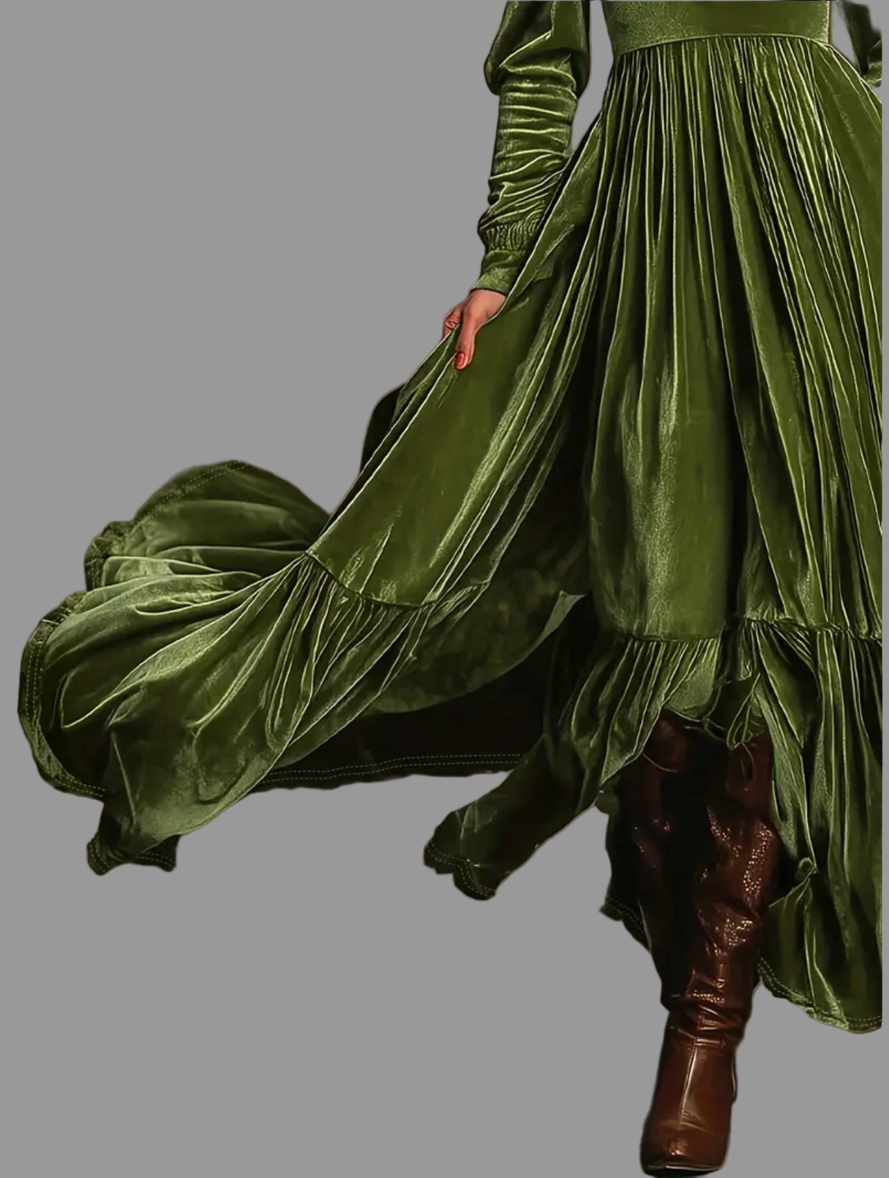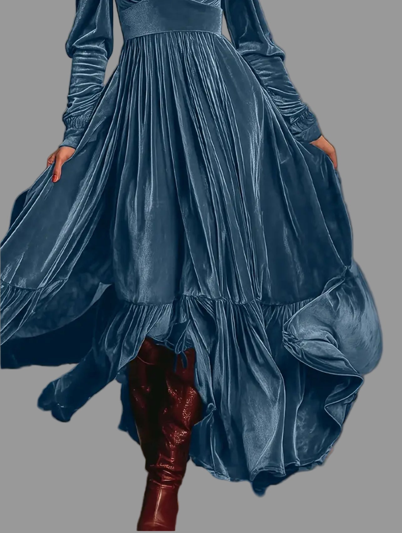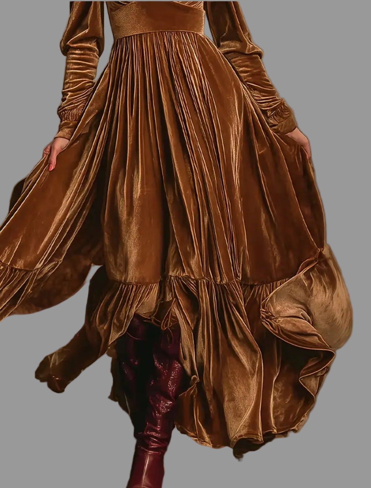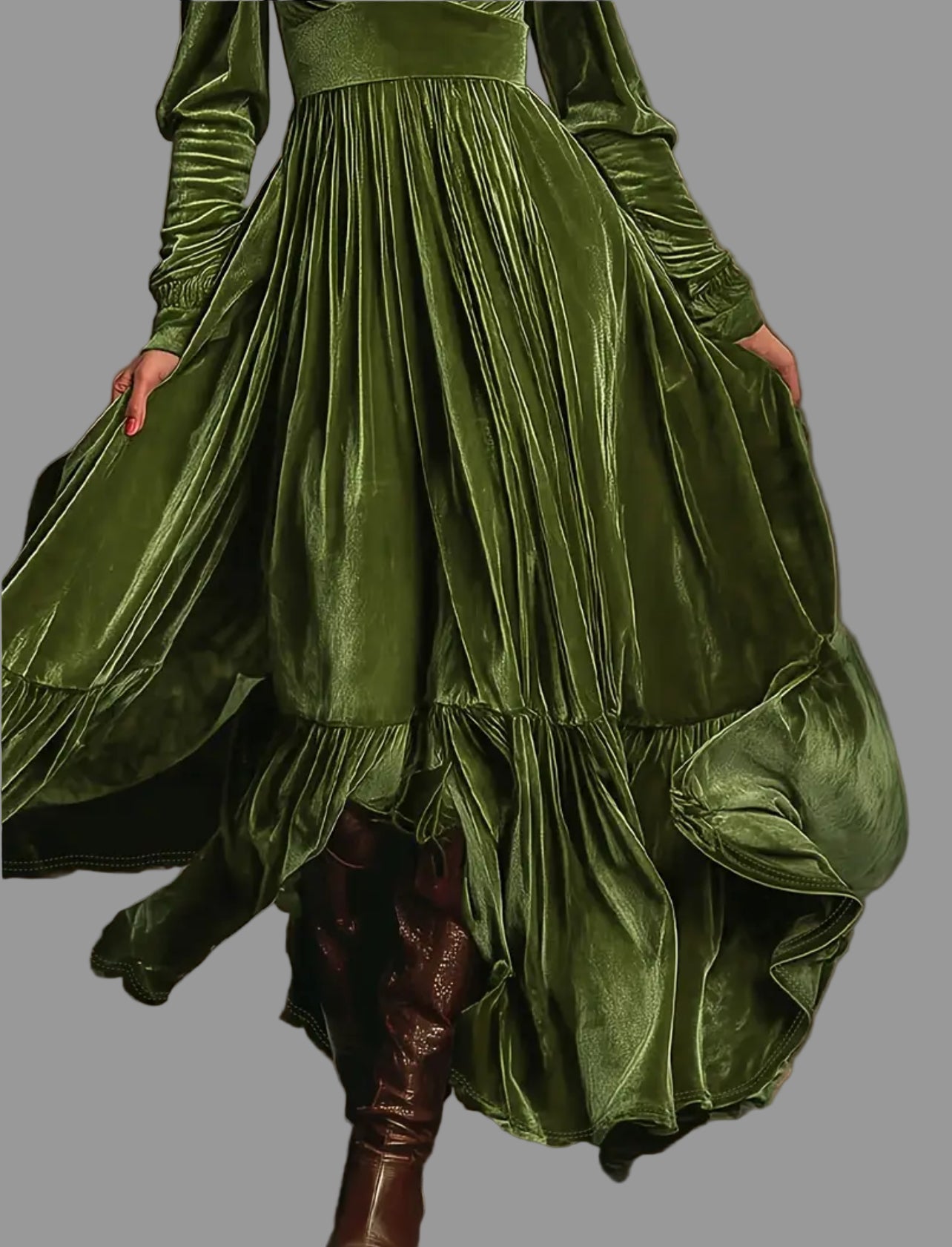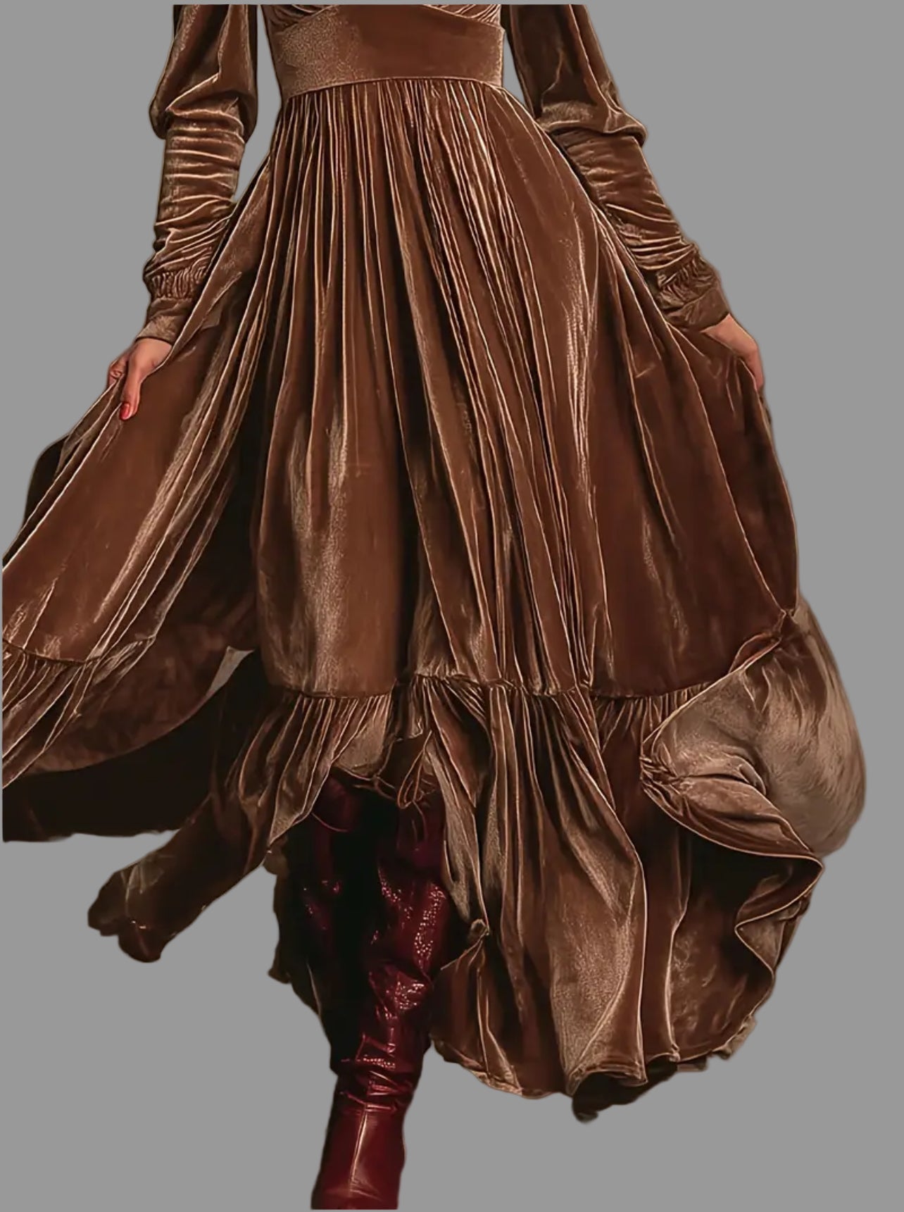 This Este vestido representa la elegancia y la comodidad. Es largo, de terciopelo con un escote profundo y una cintura ajustada, para realzar tu figura y darte libertad de movimiento. Con falda de paneles, es una fusión perfecta de estilo y sencillez. ¡Llévalo con confianza, para una apariencia femenina y sofisticada! Se un diez. Disponible en 6 maravillosos colores.