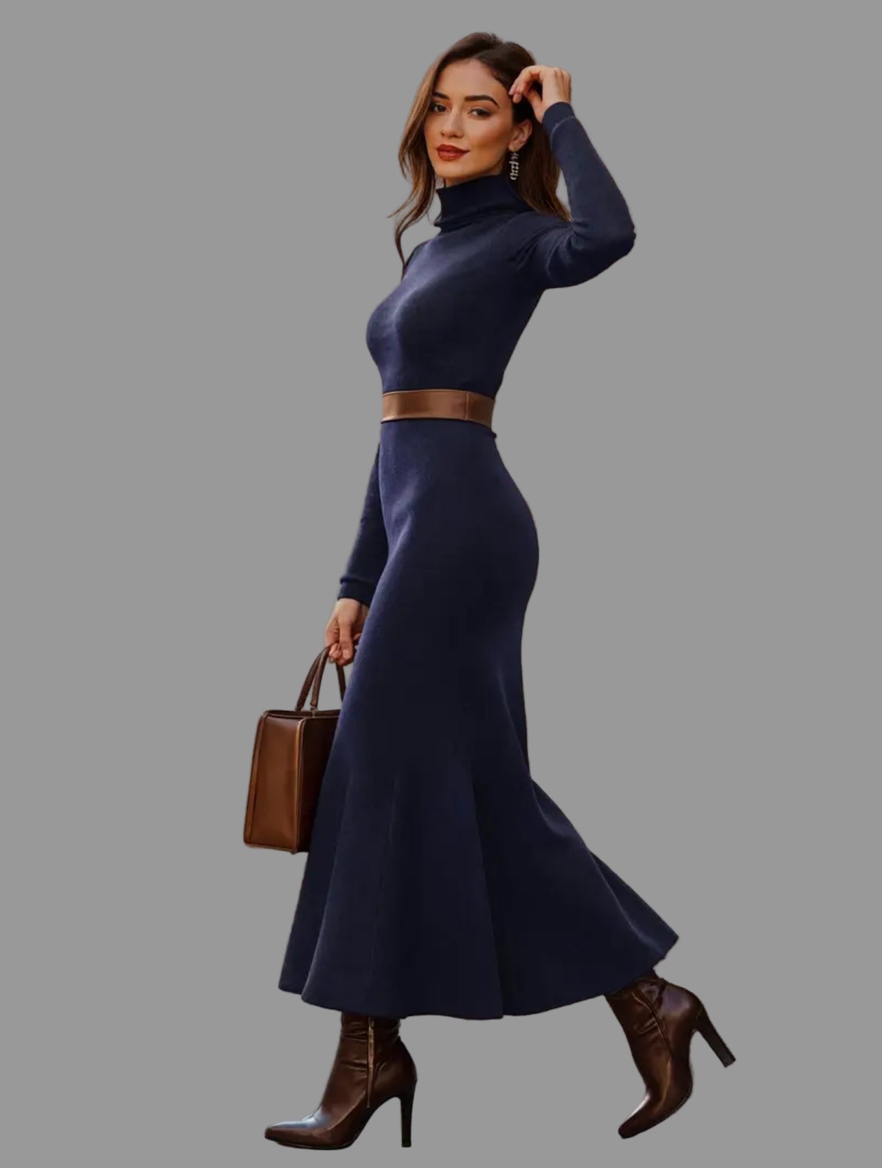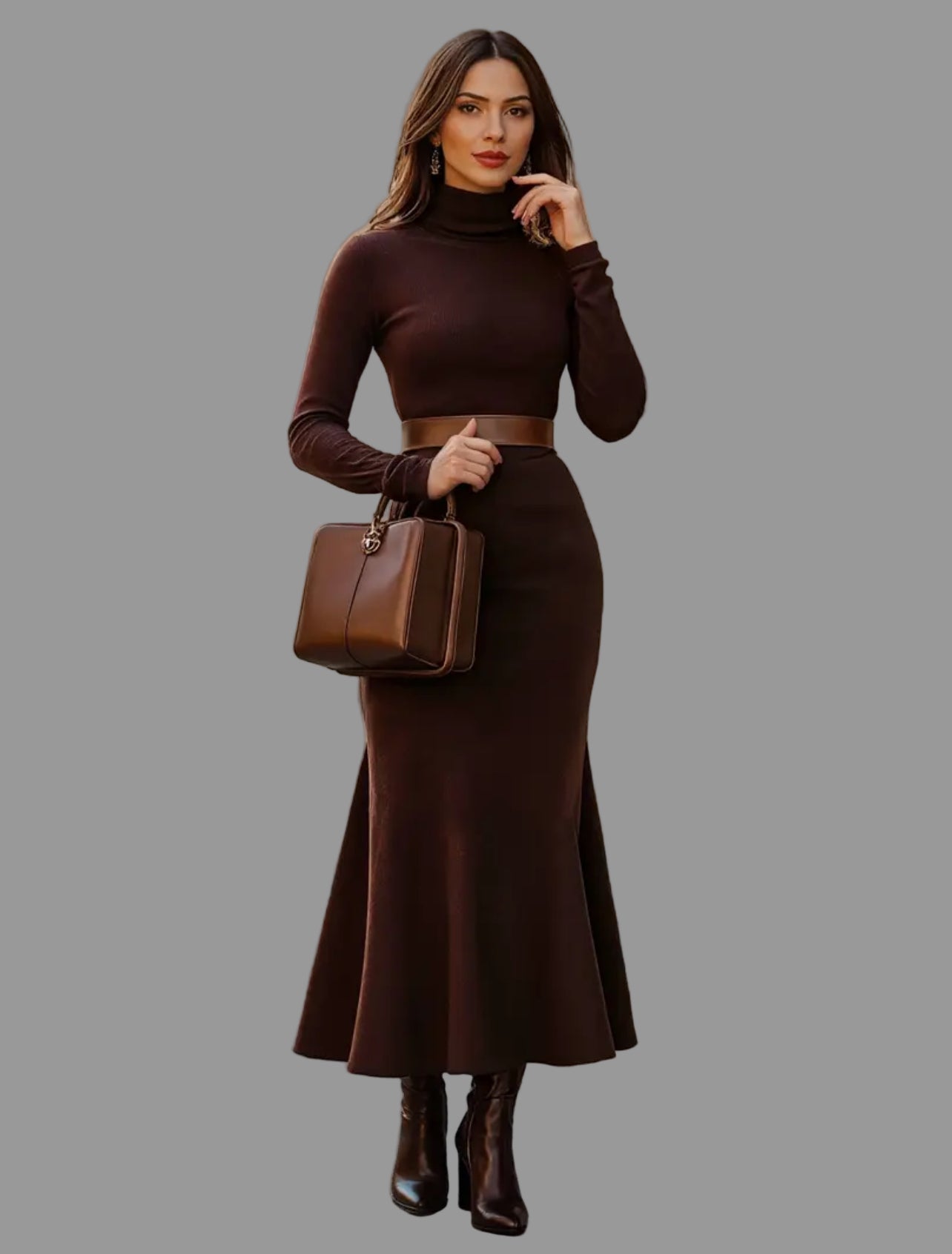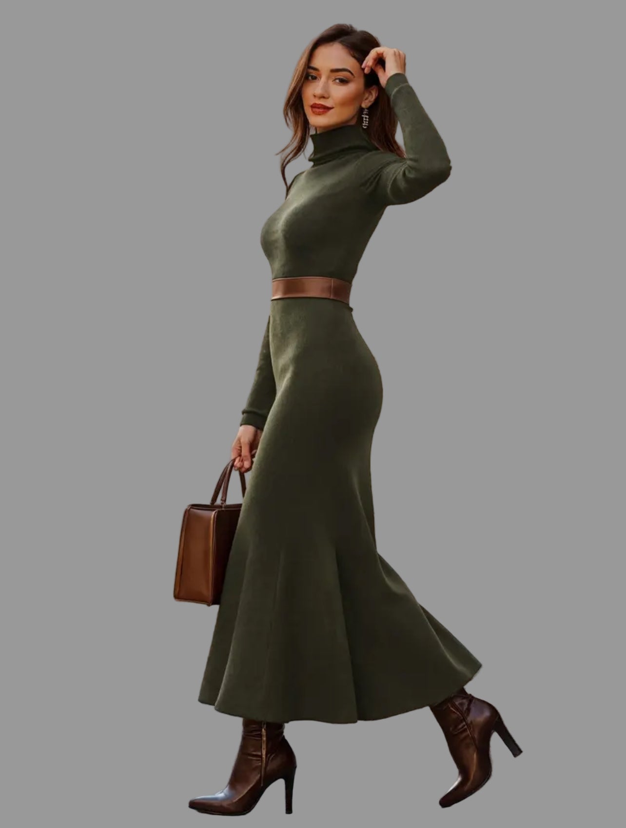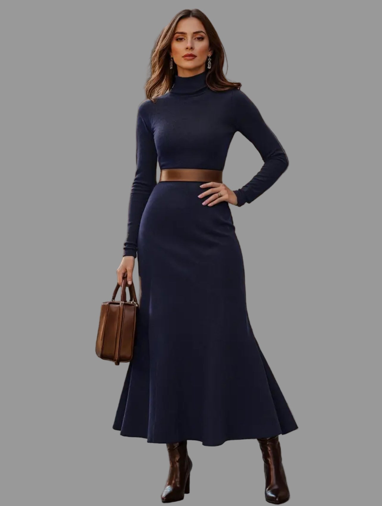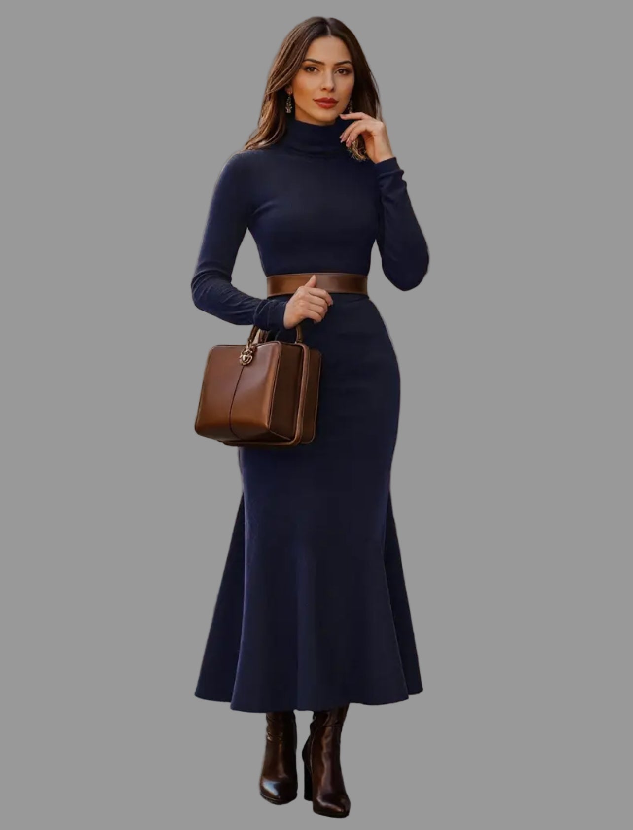 Este vestido midi con cuello alto es el complemento perfecto para tu guardarropa. Confeccionado en un tejido muy suave que brinda comodidad y elasticidad, su falda entallada se abre en una elegante forma de sirena. Además, puedes darle un toque personal con un cinturón (no incluido en el modelo) y elegir entre cuatro maravillosos colores, es ideal para el trabajo y cualquier ocasión.